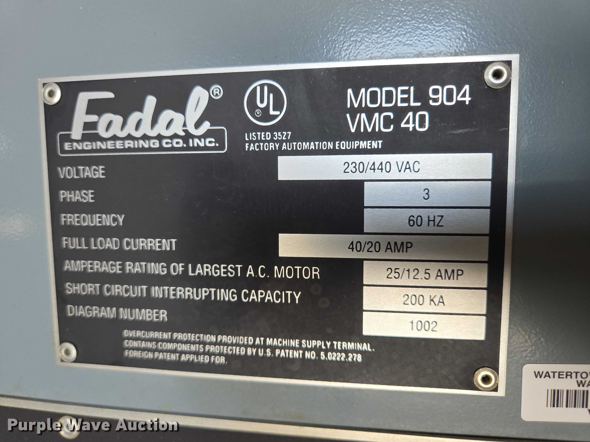 Fadal 904-1 CNC mill. Serial: 9409054. Dimensions Overall Length: 100", Width: 98", Height: 110". Electric Motor Volts: 230/440, Phase: Three. Notes Coolant tank included. Lake Area Technical College. Watertown, SD 57201