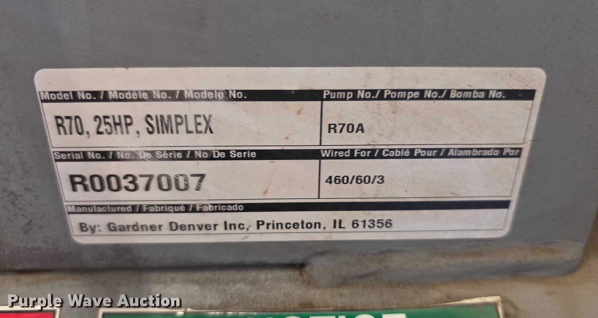 Purple Wave is selling a used Air Compressor in Kansas. This item is a 2003 Gardner-Denver R70 air compressor with the following: Serial: R0037007