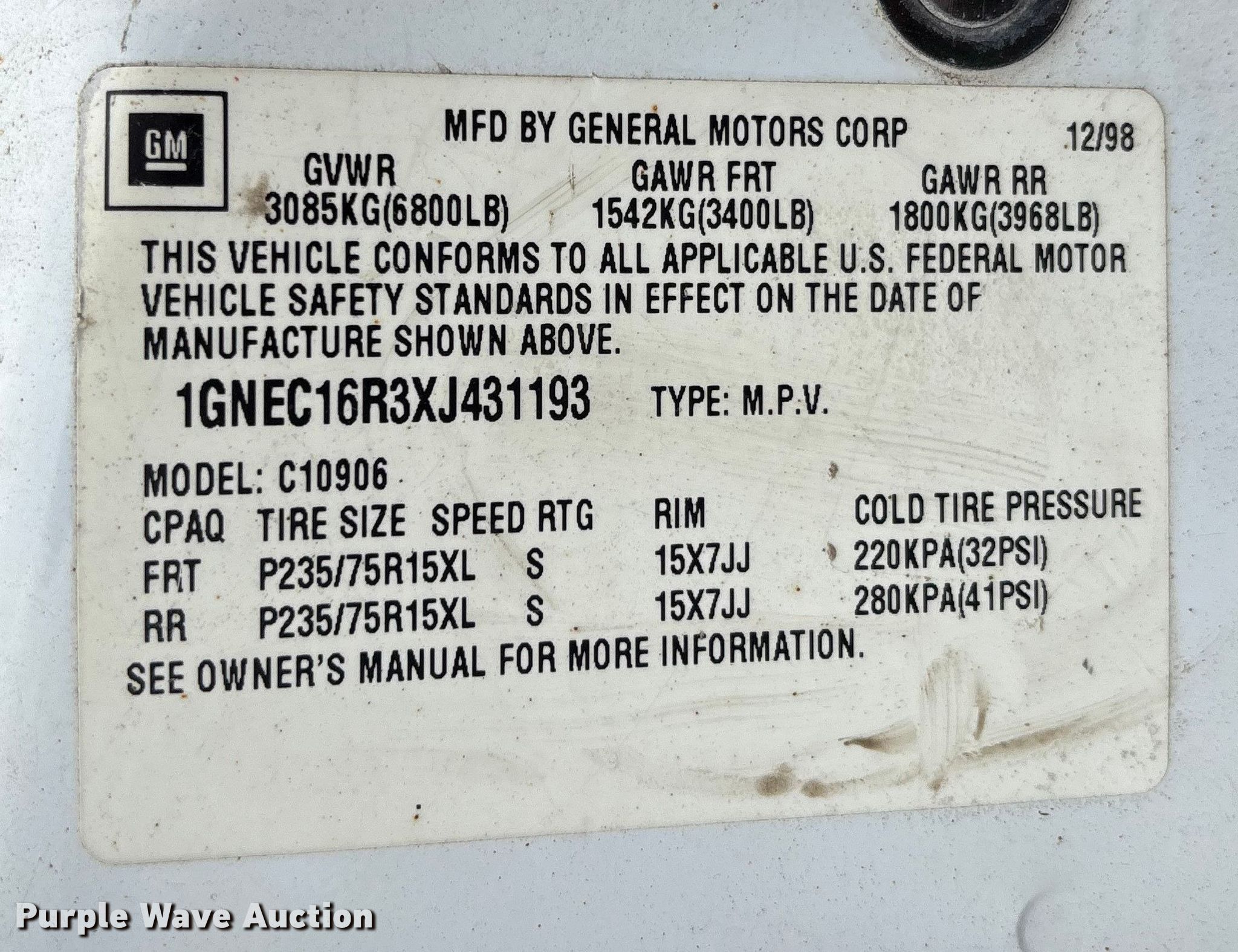 Purple Wave is selling a used Passenger Vehicle in Kansas. This item is a 1999 Chevrolet Suburban C1500 SUV with the following: Miles: 196,034 on odometer, VIN: 1GNEC16R3XJ431193