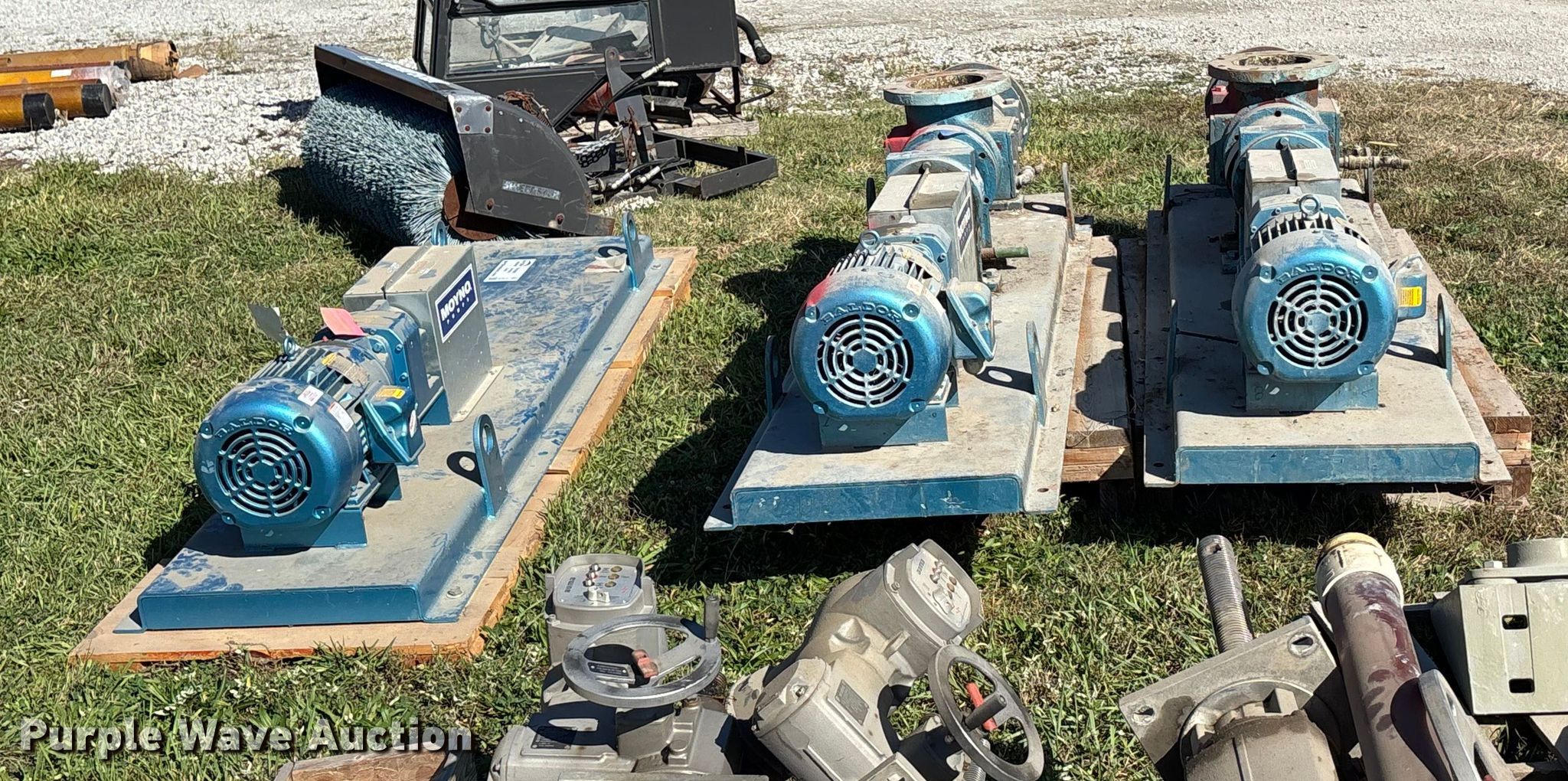 Purple Wave is selling a used Pump in Nebraska. This item is a (3) Moyno Progressive cavity pump with the following: Electric motors CECP377, Volts: 230/460, Amps: 25/12.5, RPM: 1,760, (2) 3118044QZ progressive cavity pumps, Parts may be mising