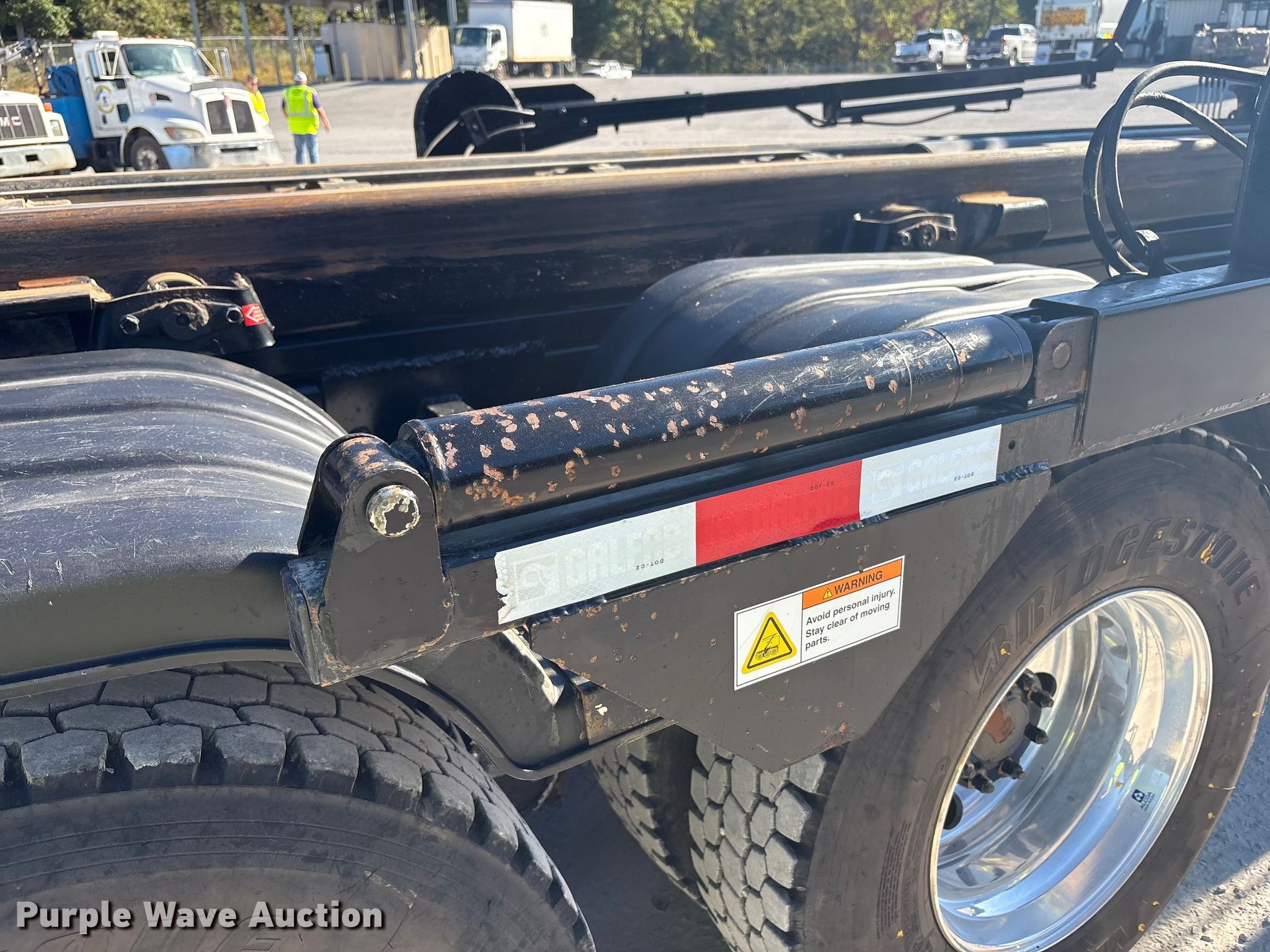 2025 Mack GR64F roll-off container truck. Miles: 57,664 on odometer, Hours: 2,604 on meter, VIN: 1M2GR3GCXSM044651. Engine Mack MP8-415C, Serial: 1433017, Displacement: 12.8L, Cylinders: 6, Fuel type: Diesel, HP: 415. Transmission Automatic. Chassis Axles: Tandem, Suspension: Camelback, Brakes: Air, PTO, GVWR: 62,000 lbs. Interior AC, Heat, Heated mirrors, Power windows, Power locks, Cruise control. Features Bed Roll-off bed, Galfab, Length: 23', Ram: Dual, Roll tarp. Tires Front: 315/80R22.5, Rear: 11R22.5. Kentucky title. Title distribution may be delayed up to 30 days from verification of funds. Hopkinsville Solid Waste Enterprise - Open Inspection: October 30. Hopkinsville, KY 42240