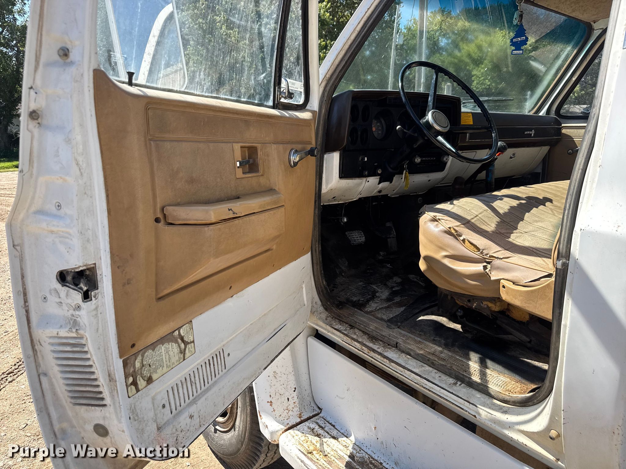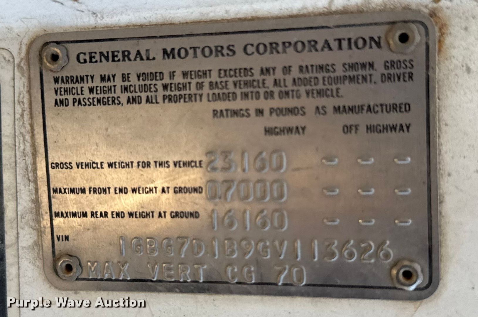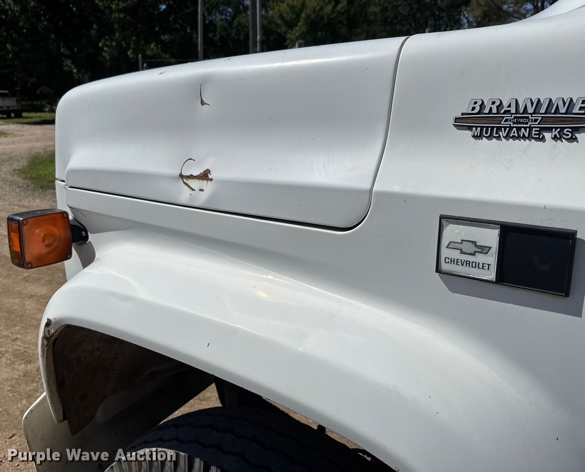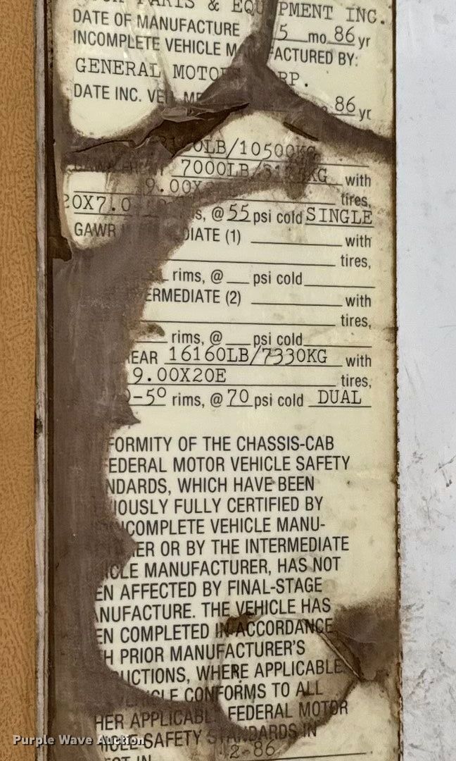 1986 Chevrolet C70 truck cab and chassis. Miles: 93,392 on odometer, VIN: 1GBG7D1B9GV113626. Engine GM, Displacement: 366 CID, Cylinders: 8, Fuel type: Gas. Transmission Manual, Speed: 4, plus 2. Chassis Axles: Single, Suspension: Spring, Brakes: Hydraulic, PTO, Truck chassis: 9' 4", GVWR: 23,160 lbs FAWR: 7,000 lbs, RAWR: 16,160 lbs. Interior Heat. Tires Size: 9.00-20. Kansas title. Title distribution may be delayed up to 30 days from verification of funds. Salem Township. Haysville, KS 67060