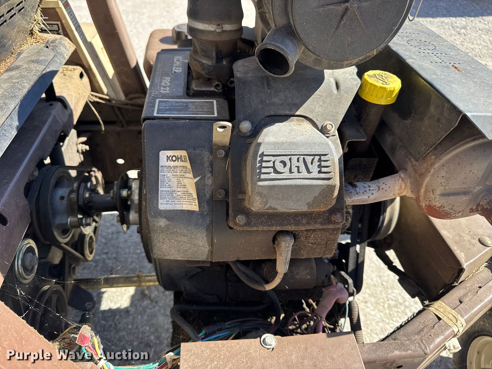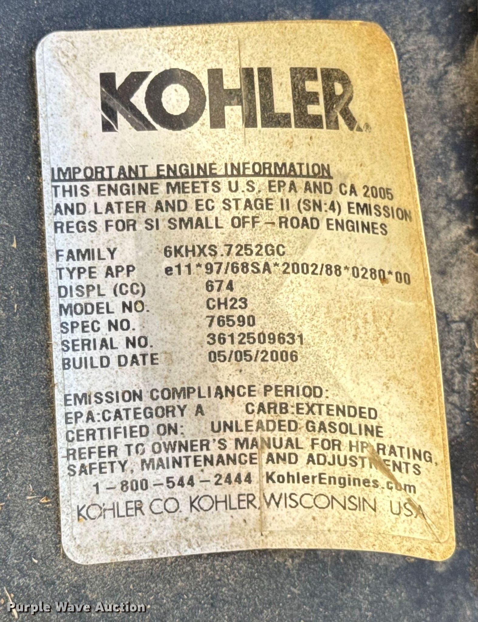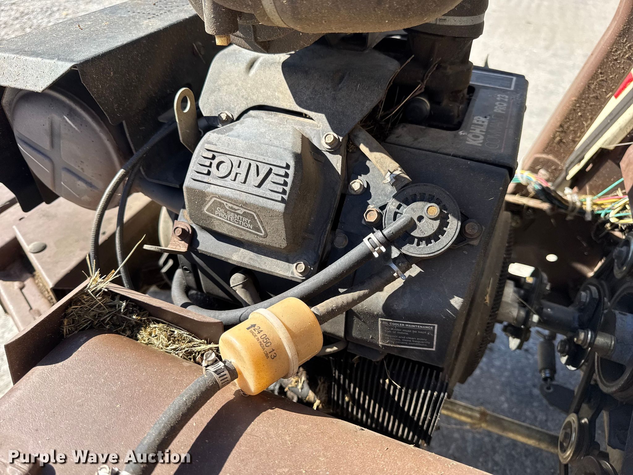 Grasshopper 723K ZTR lawn mower. Hours: 1,409 on meter, Cutting width: 61", Serial: 5620191. Engine Kohler Command Pro 23, Serial: 3612509631, Displacement: 674cc, Cylinders: 2, Fuel type: Gas, HP: 23. Transmission Hydrostatic. Chassis PTO. Tires Front: 22x11.00-10, Rear: 13x6.50-6. Notes Non-operational unit. Knob Noster Public Schools. Knob Noster, MO 65336