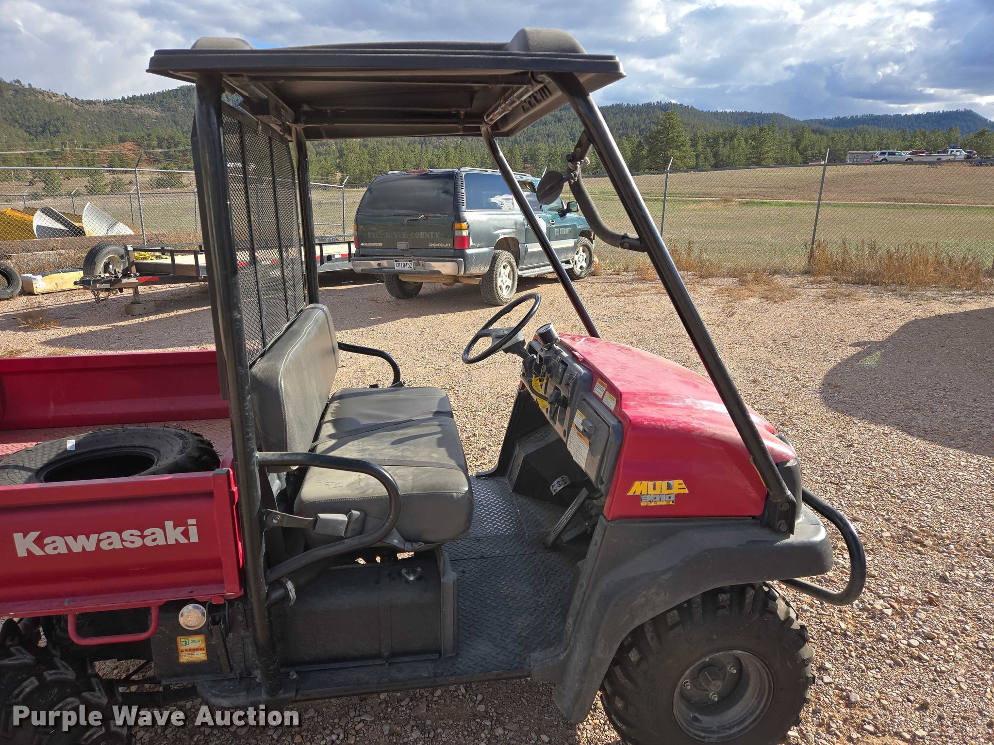 2006 Kawasaki Mule 3010 utility vehicle. Miles: 2,476 on odometer, Hours: 738 on meter, VIN: JK1AFDB136B510642. Engine Kawasaki, Cylinders: 3, Fuel type: Diesel. Transmission Automatic. Chassis Four wheel drive/ All wheel drive. Operators station OROPS, Canopy. Features Grille guard, Receiver hitch, Dump bed 48" L x 54" W, Dump bed type: Manual. Tires Size: 24x11-10. Notes Spare tire included. South Dakota title. Title distribution may be delayed up to 14 days from verification of funds. Fall River County Highway Department. Hot Springs, SD 57747