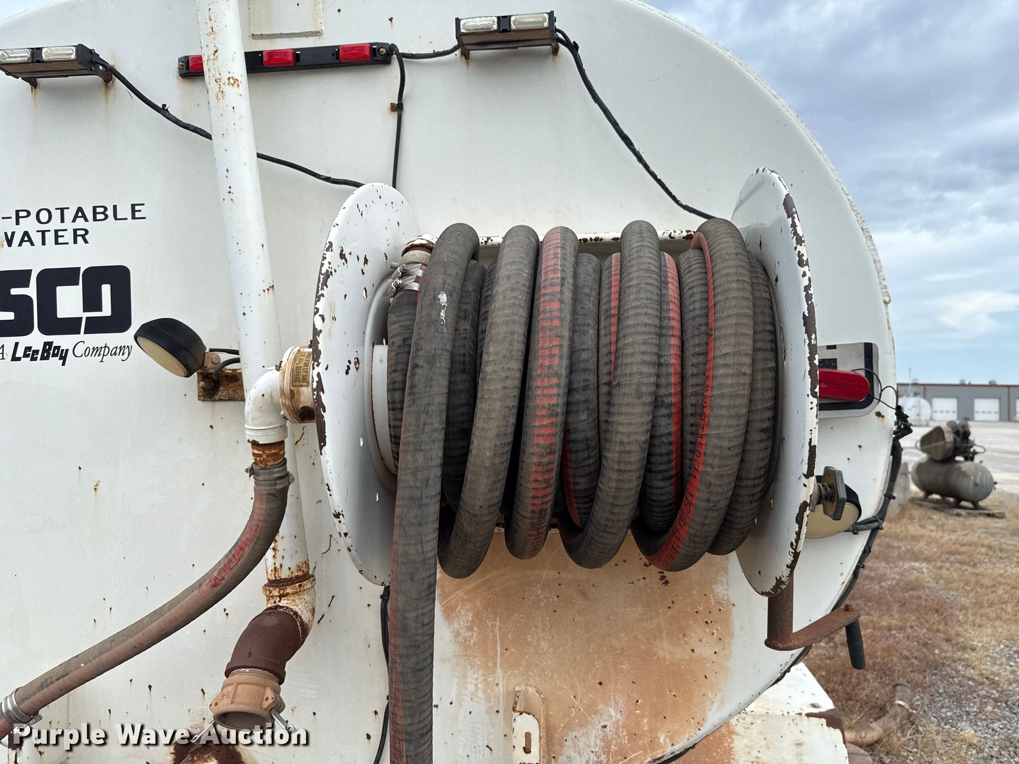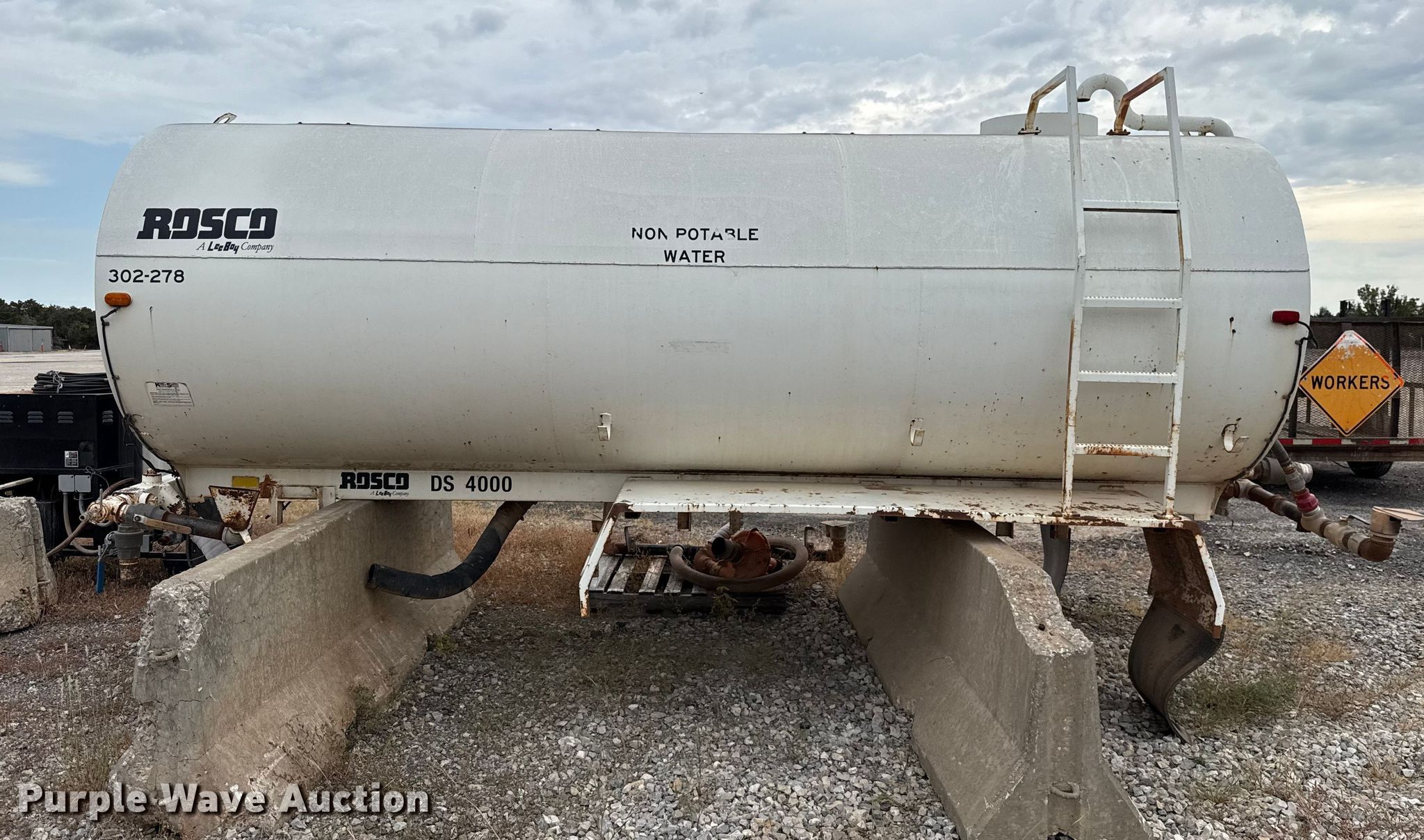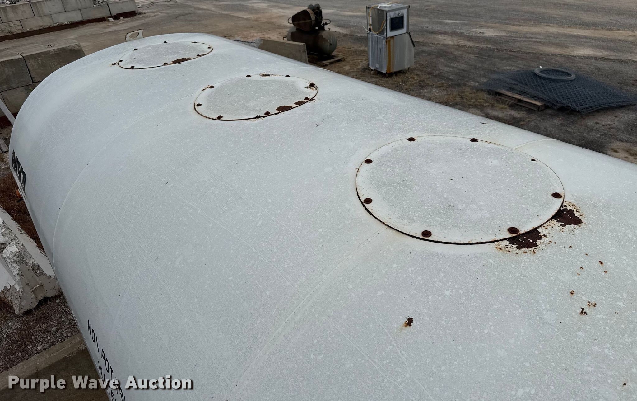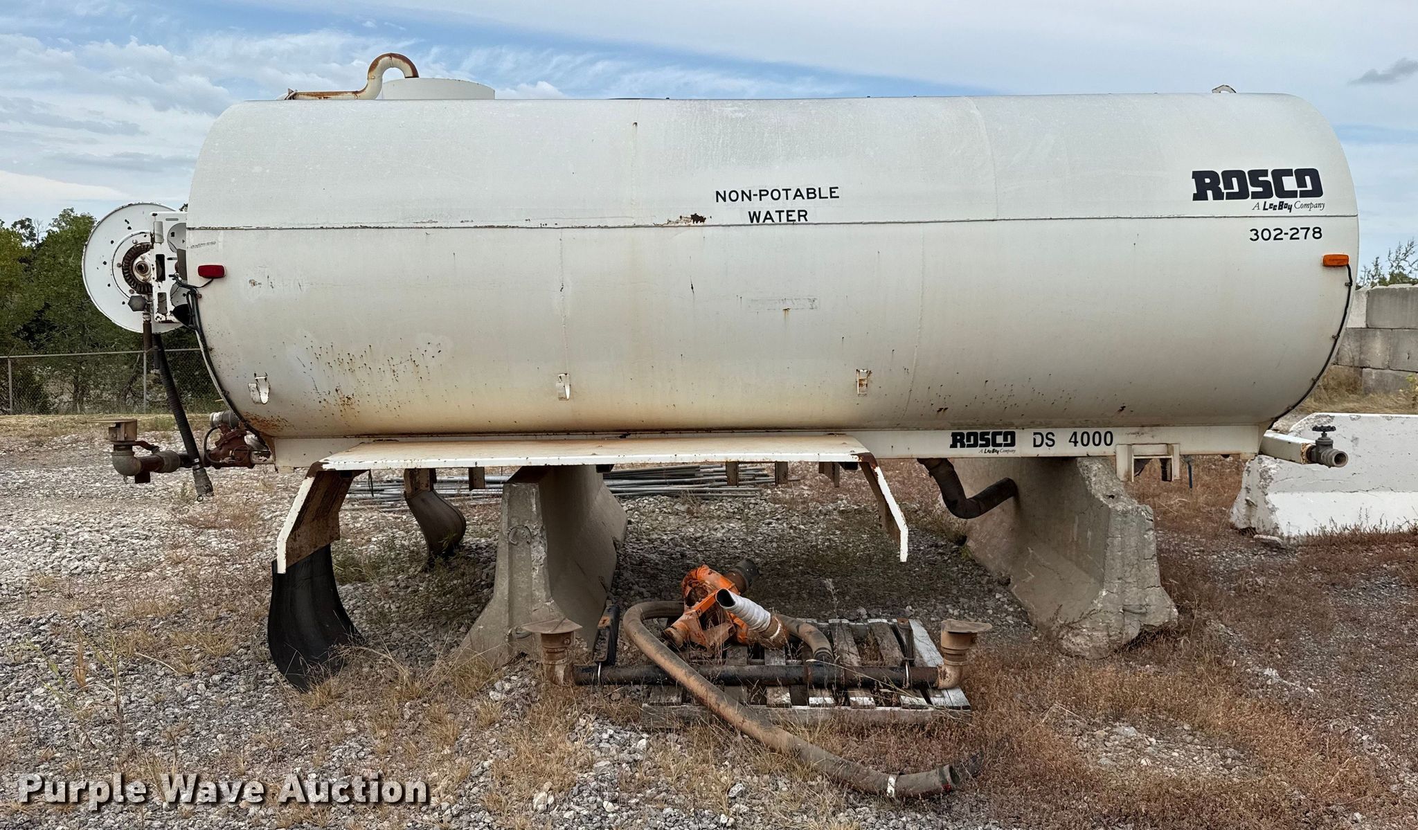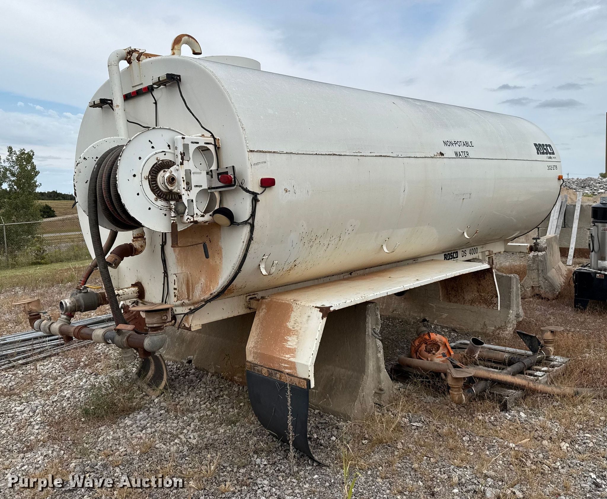 Purple Wave is selling a used Truck Part and Attach. in Oklahoma. This item is a Rosco DS4000 water tank bed with the following: Serial: 45900, Length: 16', Width: 90", Height: 66", Bed type: Steel, Barrel, Side spray, Hose reel, Hose, Site glass, Man hole: 1, Diameter: 22"