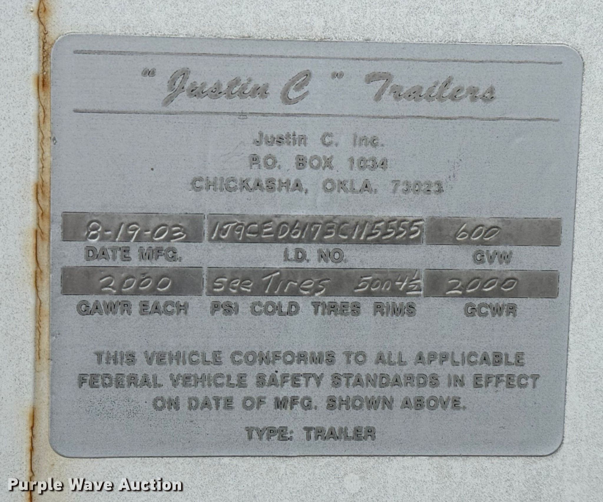 Purple Wave is selling a used Enclosed Cargo Trailer in Oklahoma. This item is a 2003 Justin C Trailers enclosed cargo trailer with the following: VIN: 1J9CE06173C115555