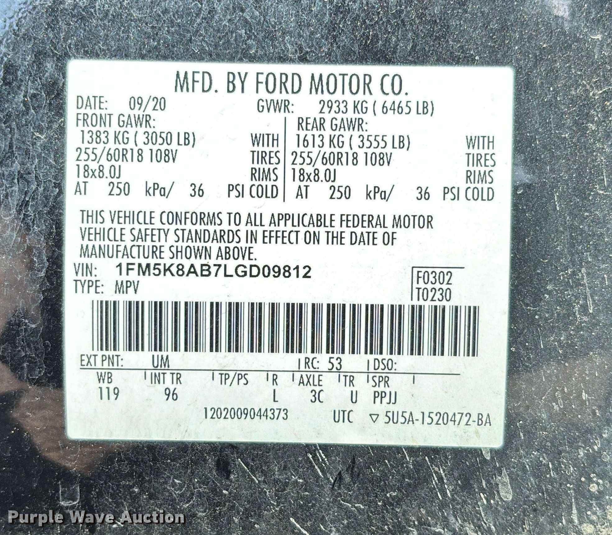 2020 Ford Explorer Police Interceptor SUV. Miles: 115,176 on odometer, VIN: 1FM5K8AB7LGD09812. Engine Displacement: 3.3L V6 DOHC, Cylinders: 6, Fuel type: Gas. Transmission Automatic, All wheel drive. Interior AC, Heat, Seat: Power driver, Power windows, Power locks, Cruise control, Backup camera. Tires Size: 255/60R18. Kansas title. Title distribution may be delayed up to 30 days from verification of funds. Derby, KS 67037