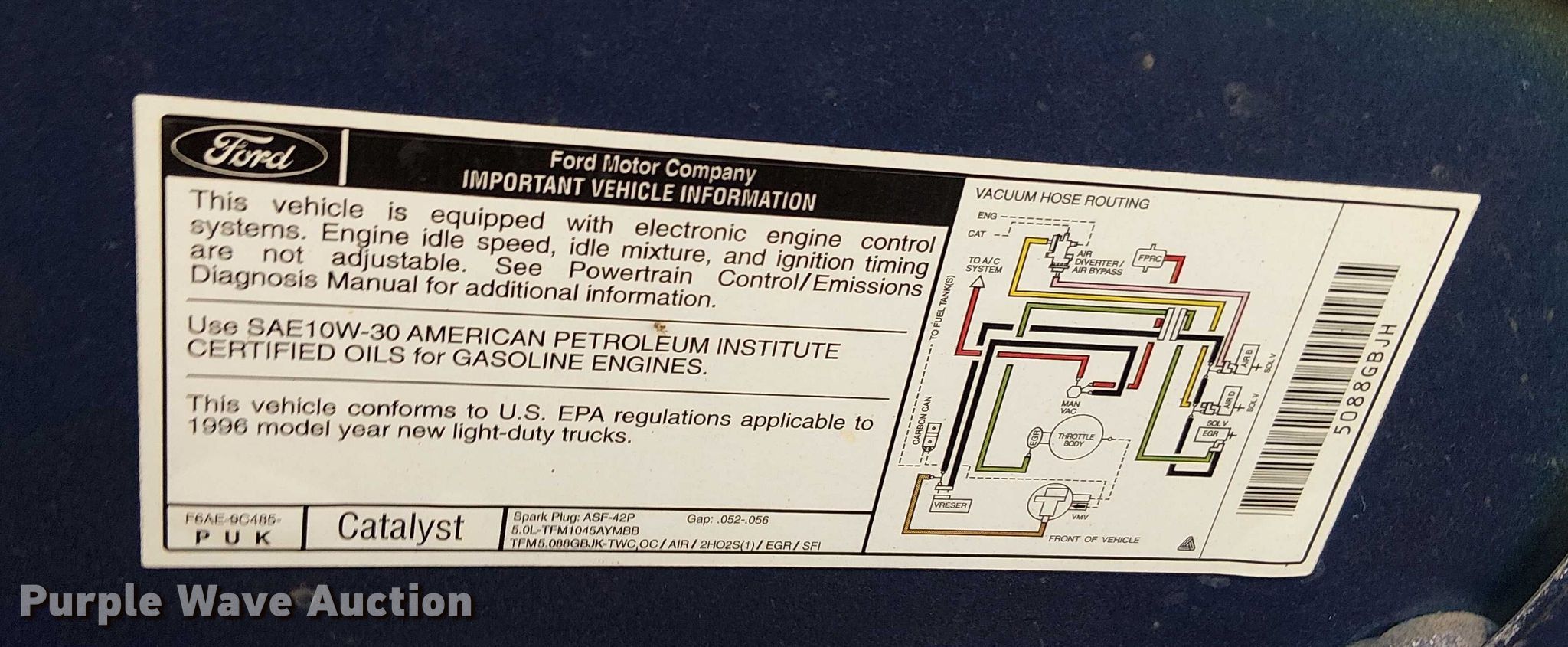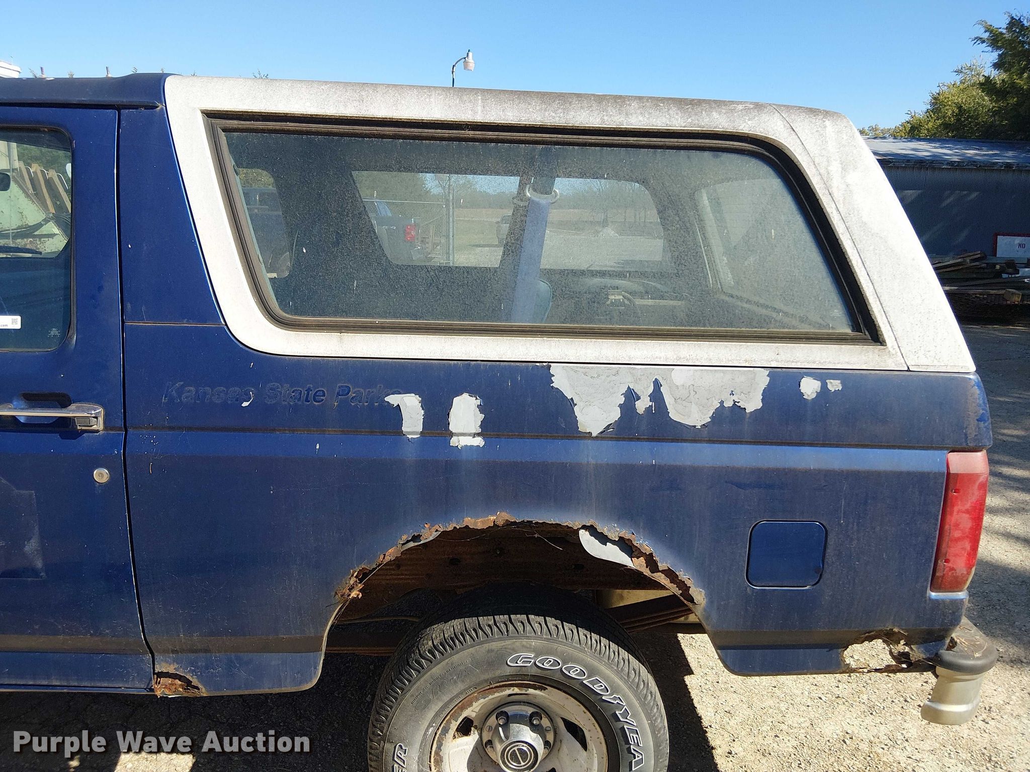 1996 Ford Bronco SUV. Miles: 67,499 on odometer, VIN: 1FMEU15N7TLB63618. Engine Displacement: 5.0L V8 OHV, Cylinders: 8, Fuel type: Gas. Transmission Automatic, Four wheel drive. Interior AC, Heat, Power windows. Tires Size: 235/75R15. Notes Dash warning indicator: ABS, Battery missing, Non-operational brakes , Unit must be towed or hauled. Kansas title. Title distribution may be delayed up to 14 days from verification of funds. Clinton State Park. Lawrence, KS 66049