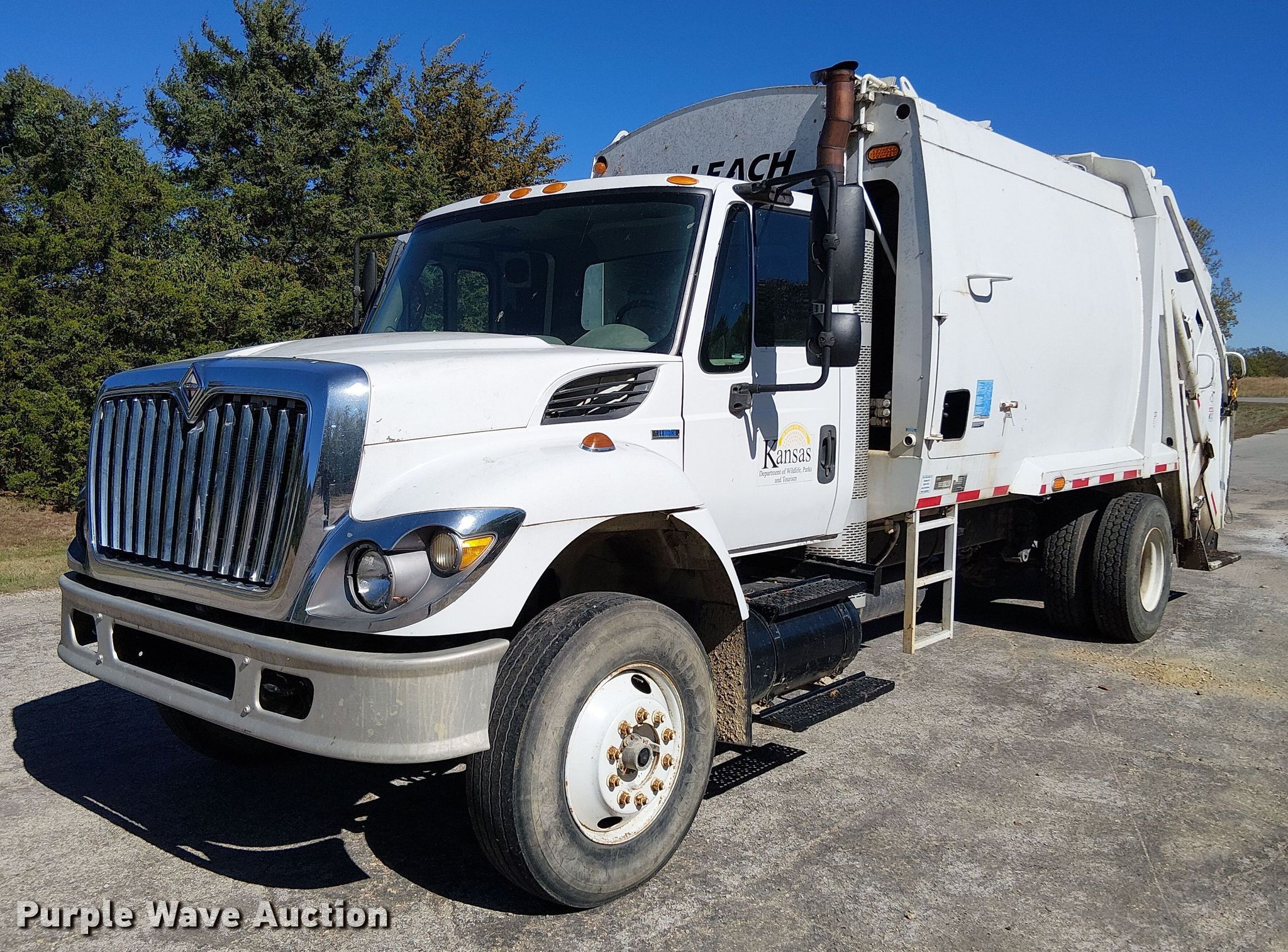 2008 International 7300 refuse truck. Miles: 102,569 on odometer, VIN: 1HTZZAANX8J674534. Engine International Maxxforce DT, Displacement: 7.64L, Cylinders: 6, Fuel type: Diesel. Transmission Automatic. Chassis Axles: Single, Suspension: Spring, Brakes: Air, PTO, GVWR: 33,000 lbs, Wheelbase: 600". Interior AC, Heat, Heated mirrors, Cruise control, Backup camera. Features Refuse bed Leach, Serial: 30467, Load: Rear, Winch. Tires Size: 11R22.5. Notes Dash warning indicator: Regen, Non-operational refuse bed, Hydraulic leak, Carrier cylinder cracked, Non-operational AC, Weld repairs, Electrical issues, battery drains, Battery cover missing. Kansas title. Title distribution may be delayed up to 14 days from verification of funds. Clinton State Park. Lawrence, KS 66049