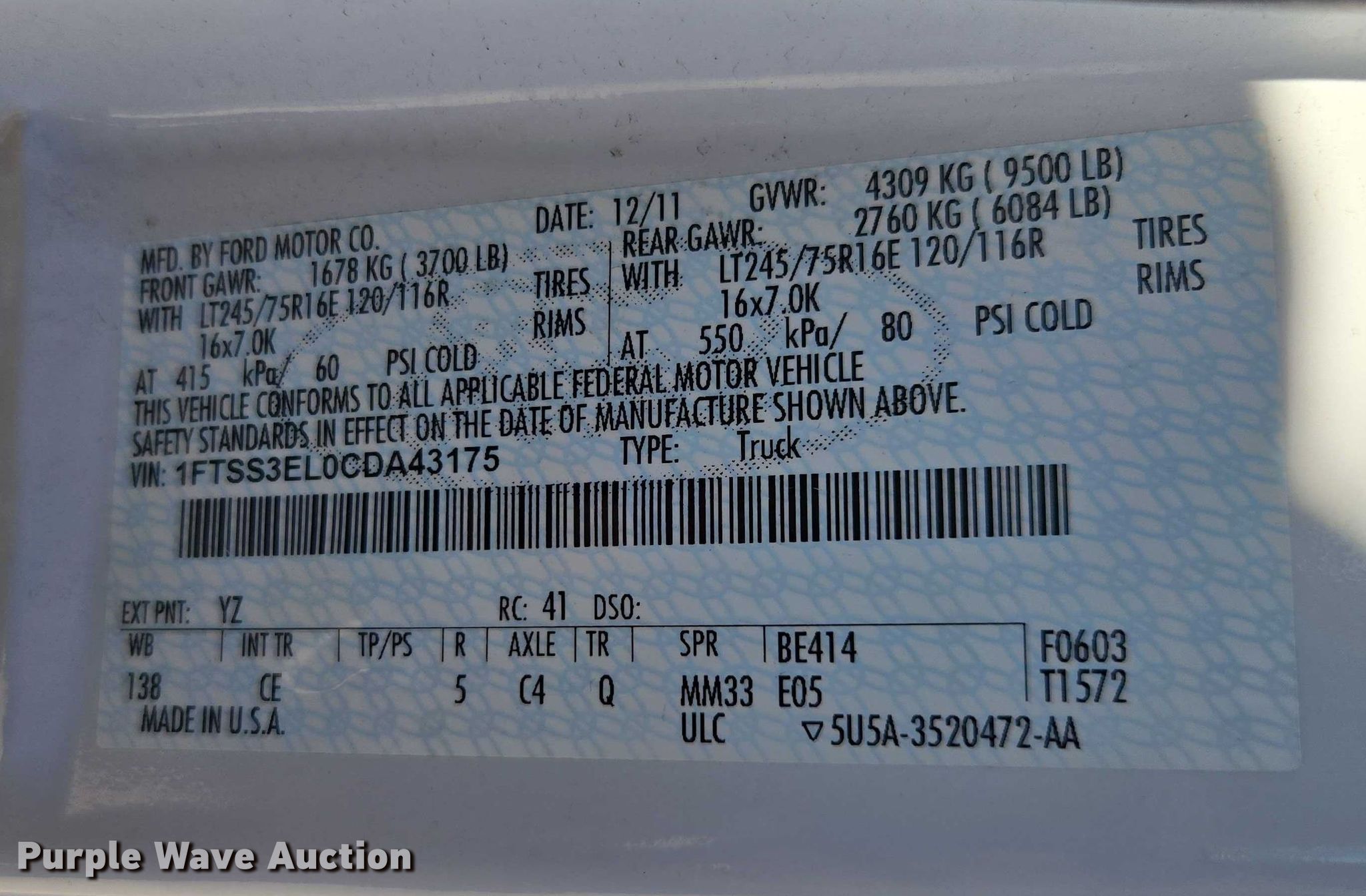 - VIN: 1FTSS3EL0CDA43175