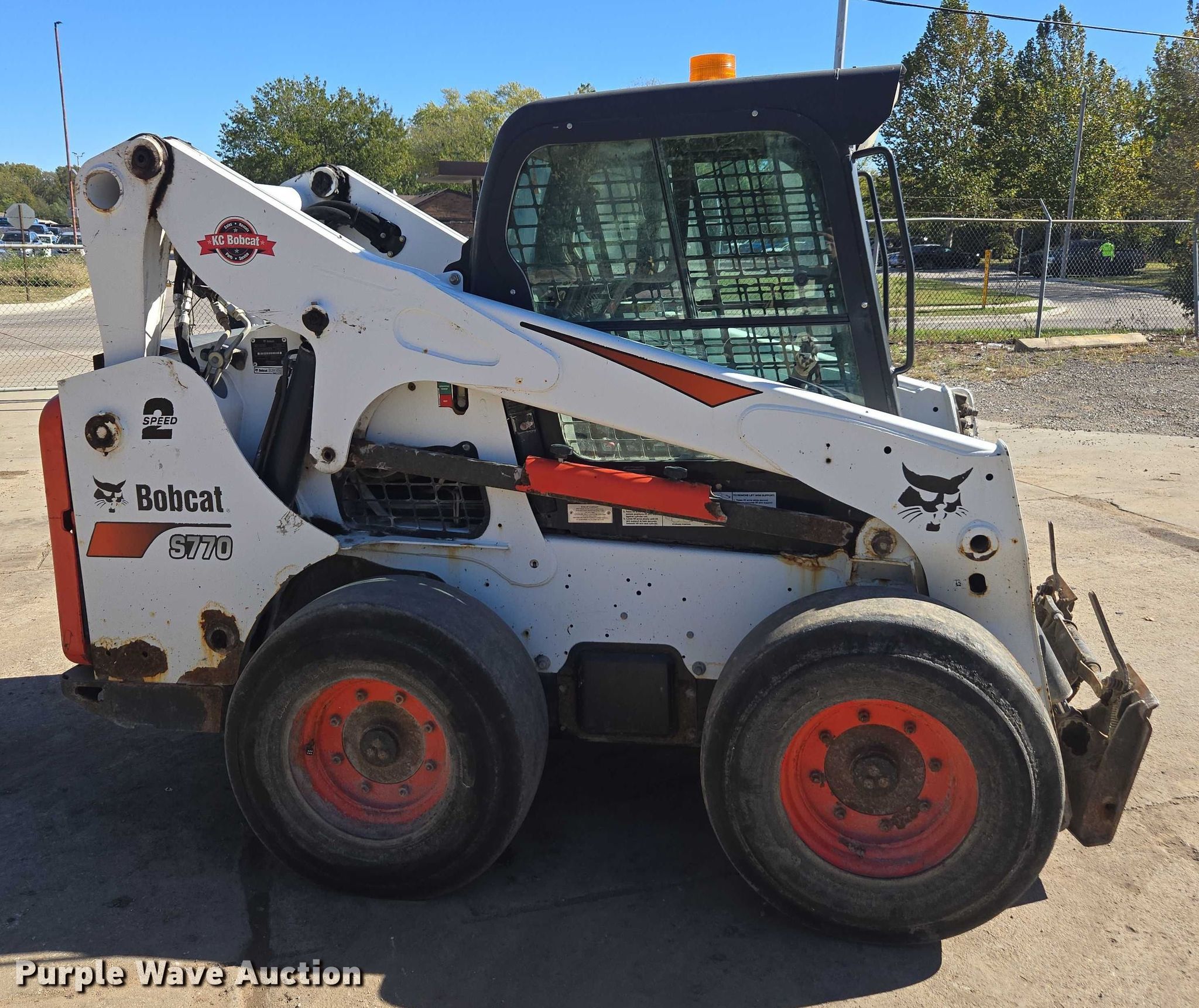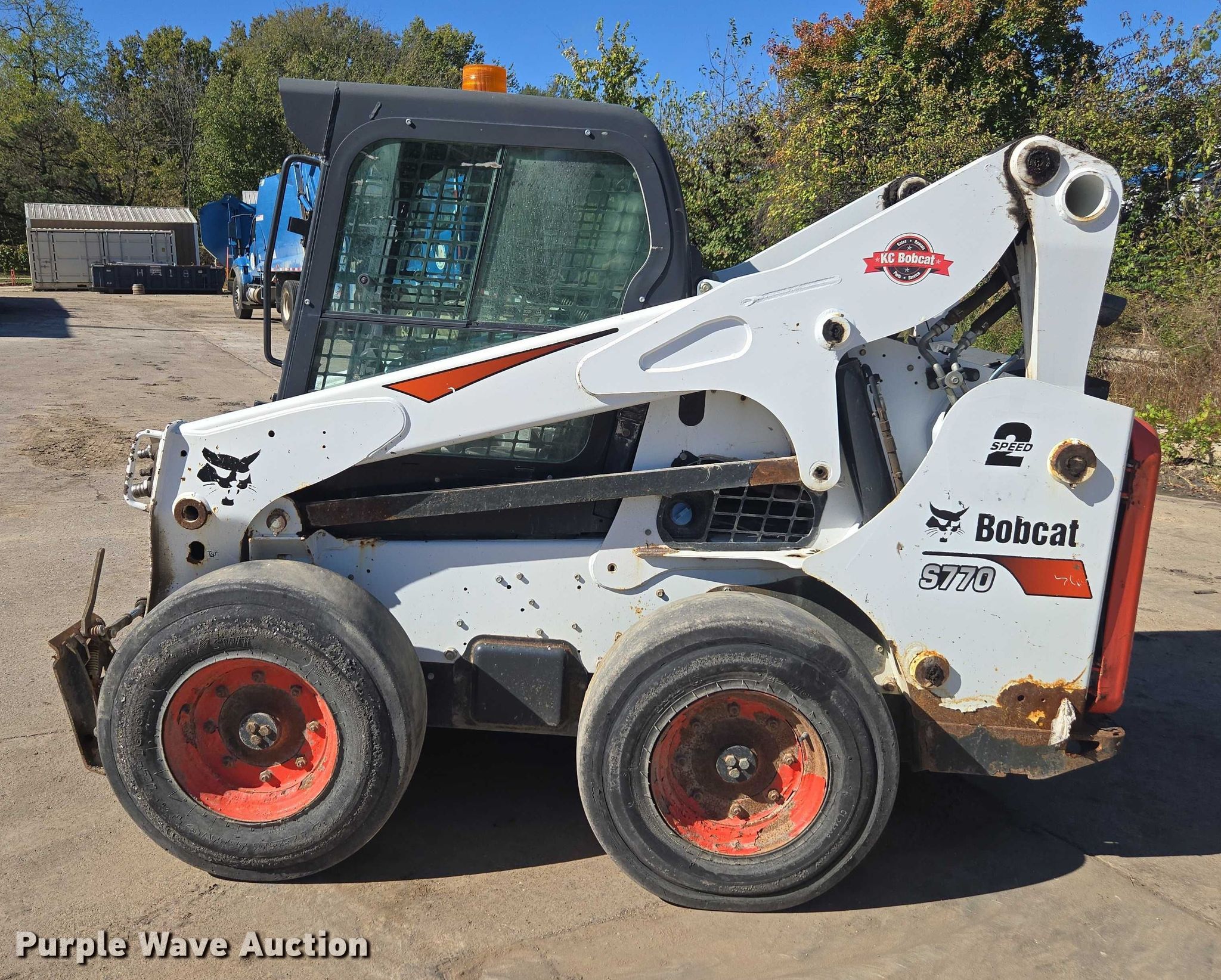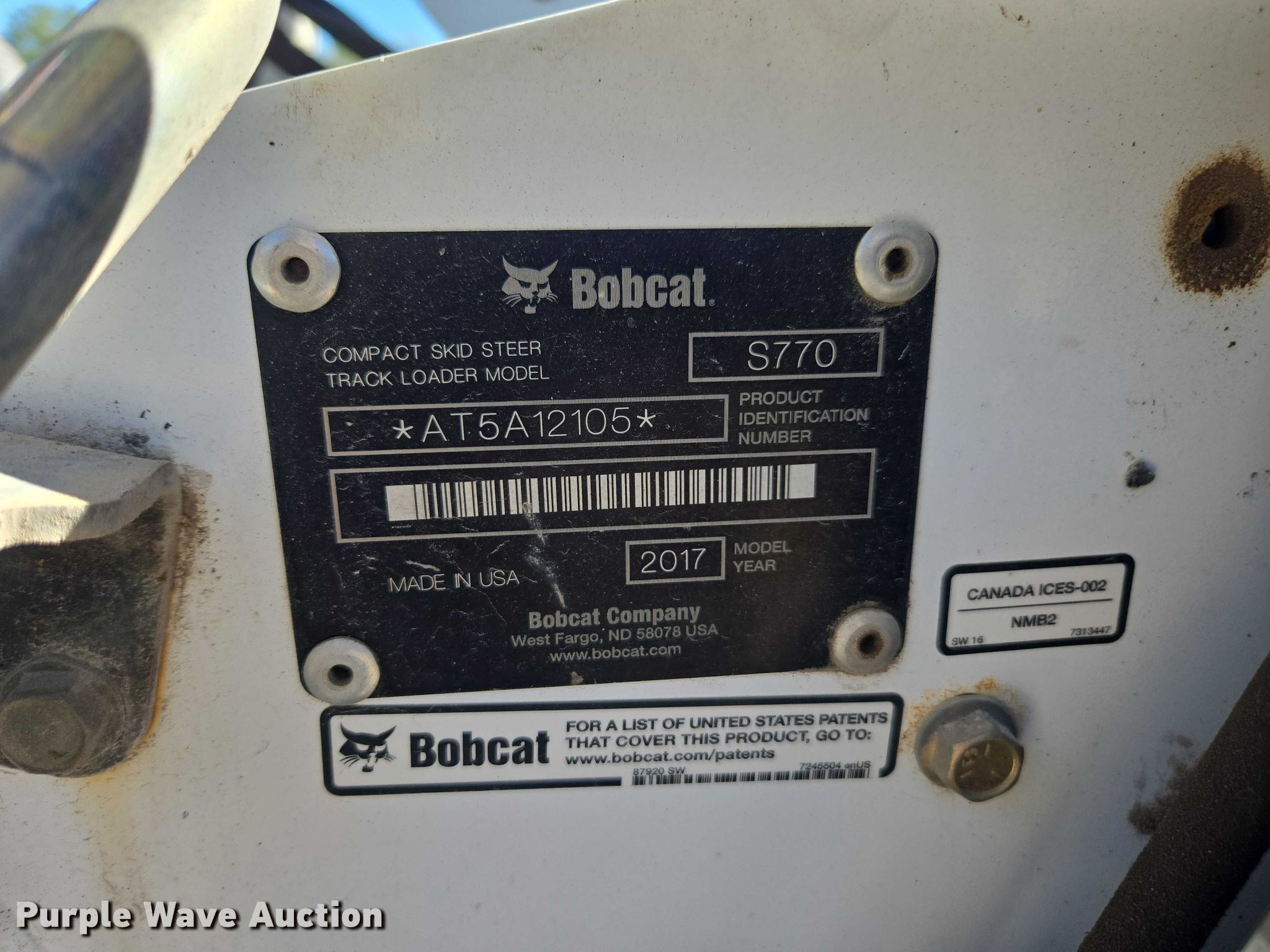 Purple Wave is selling a used Skid Steer Loader in Kansas. This item is a 2017 Bobcat S770 skid steer loader with the following: Hours: 2,005 on meter, Serial: AT5A12105
