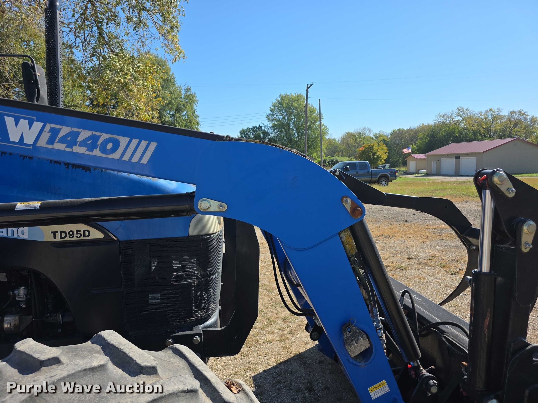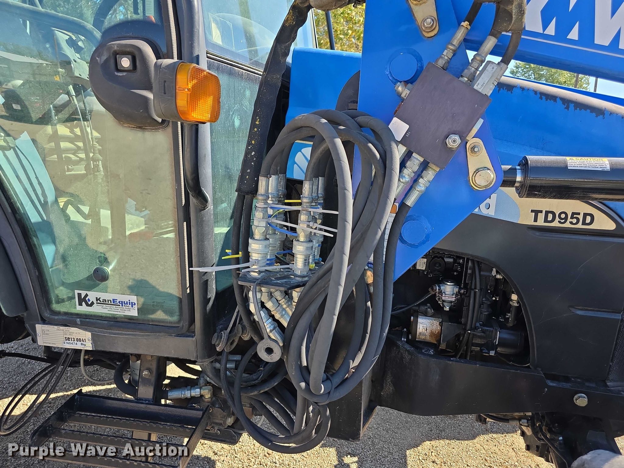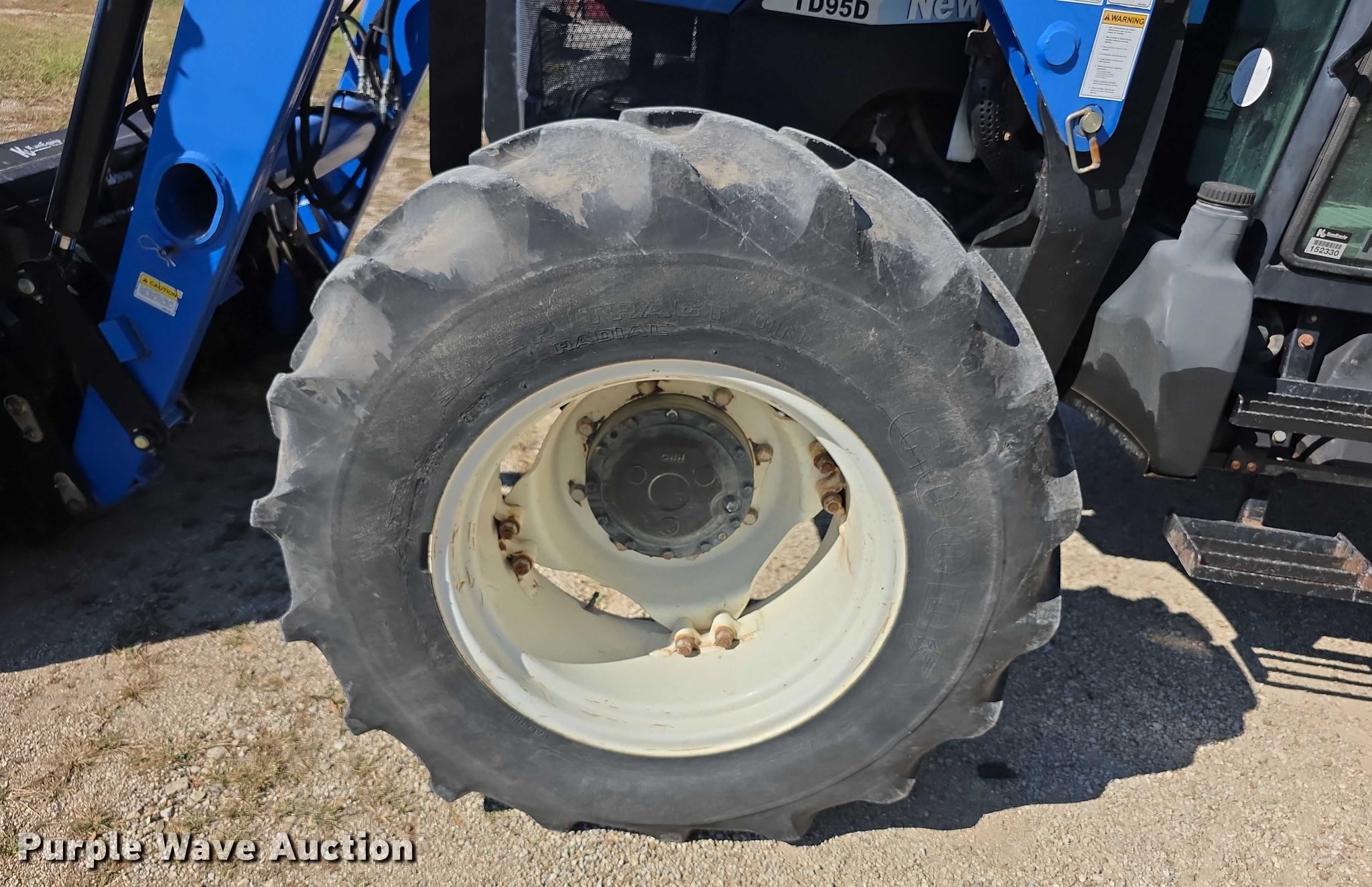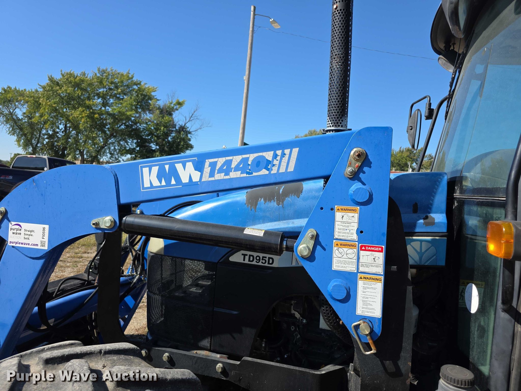 2007 New Holland TD95D MFWD tractor. Hours: 2,261 on meter, Serial: HJD104977. Engine Cylinders: 4, Fuel type: Diesel. Transmission Synchro, 12F - 12R. Operators station AC, Heat. Features PTO: 540, 1000, Three point Top link, Seven pin outlet, Hydraulic remote sets Rear: 3, Loader K&W 1440, Controls: Joystick, Bucket Width: 86".. Tires Front: 13.6R24, Rear: 18/4R34, Wheel weights: 3, Wheelbase: 88". View repairs. Maple Hill, KS 66507