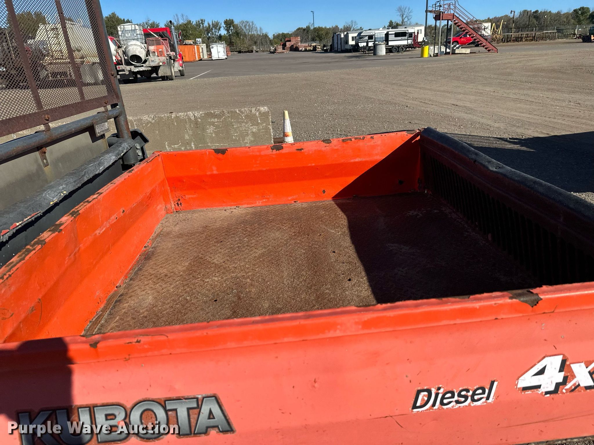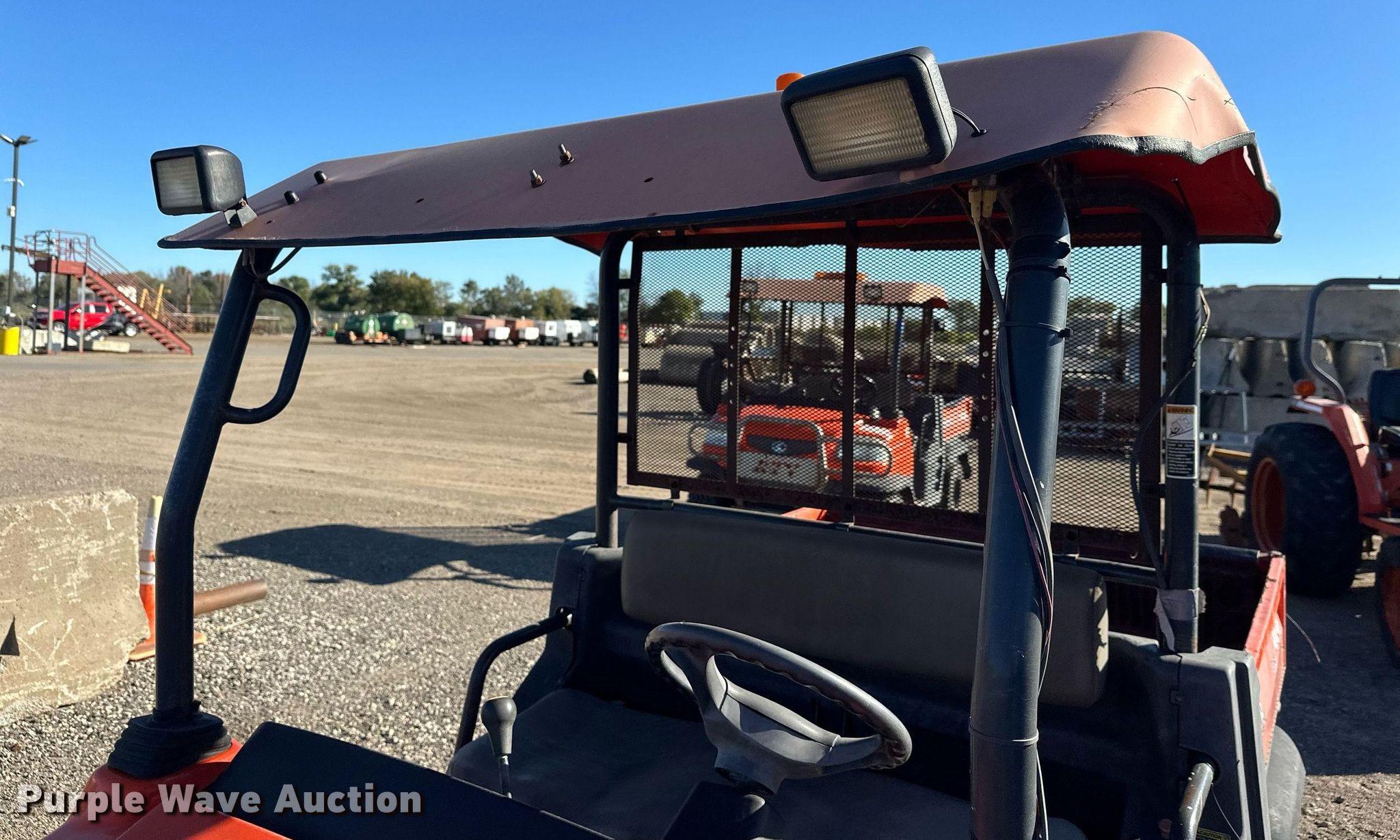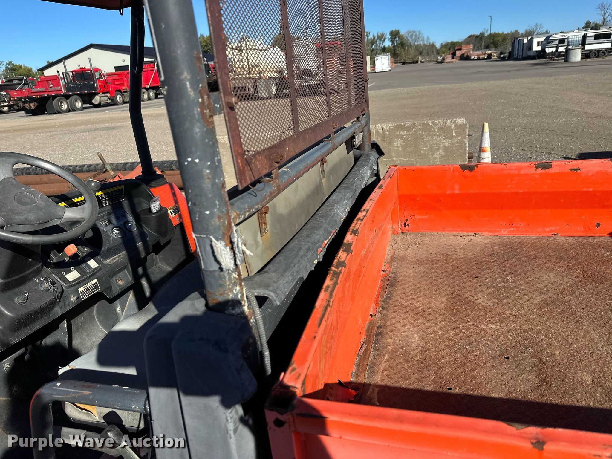 2001 Kubota RTV900 utility vehicle. Hours: 2,625 on meter, VIN: KRTV900A41026716, Serial: 26716. Engine Kubota D902, Cylinders: 3, Fuel type: Diesel. Transmission Hydrostatic, Speed: 2. Chassis Four wheel drive/ All wheel drive. Features Grille guard, Dump bed 48" L x 54" W, Dump bed type: Electric/ Hydraulic. Tires Size: 25x10.00-12. Notes Driveshaft removed , Non-operational unit. Park Construction Co. Blaine, MN 55449