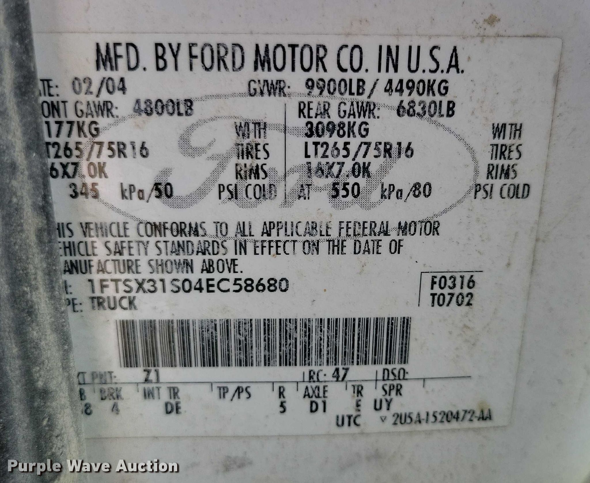 Purple Wave is selling a used 3/4 or 1 Ton Pickup or Van in Iowa. This item is a 2004 Ford F350 SuperCab pickup truck with the following: Miles: 230,857 on odometer, VIN: 1FTSX31S04EC58680