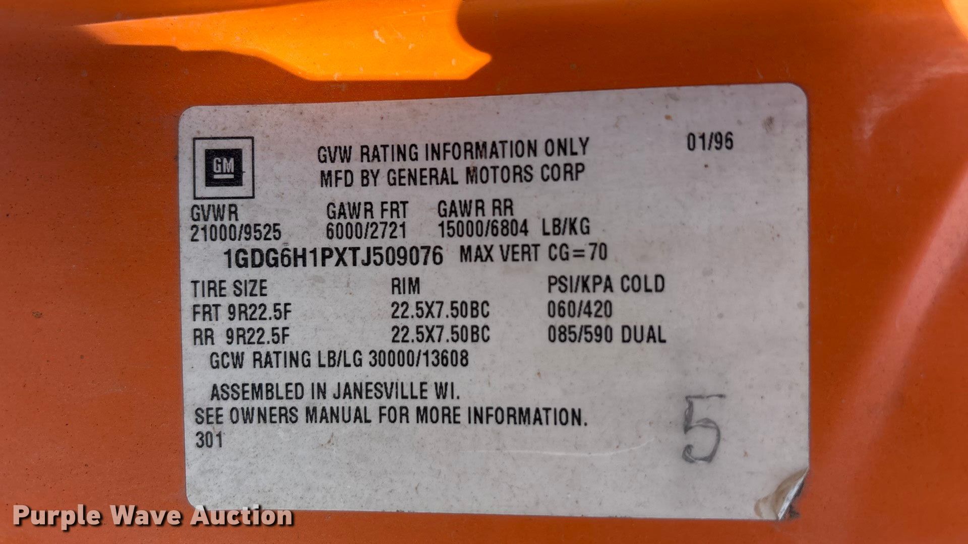 1996 GMC C6 truck cab and chassis. Miles: 210,085 on odometer, VIN: 1GDG6H1PXTJ509076. Engine Displacement: 6.0L, Cylinders: 8, Fuel type: Gas. Transmission Manual, Speed: 5. Chassis Axles: Single, Suspension: Spring, Brakes: Hydraulic, PTO, Truck chassis: 126", GVWR: 21,000 lbs FAWR: 6,000 lbs, RAWR: 15,000 lbs. Interior Heat, Brake controller. Features Fuel tank: Single. Tires Size: 10R22.5. Notes Non-operational passenger door, interior latch broken, Jump start required during on-site data collection. Texas title. Seller is a Texas licensed motor vehicle dealer. The buyer may be required to pay sales tax and/or registration fees to the dealer prior to taking possession. Buyers may be required to provide identification to the licensed dealer to comply with state laws. Title will be assigned and distributed by the dealer. Please contact the seller for distribution questions. D.Horton Truck and Equipment. Cleburne, TX 76031