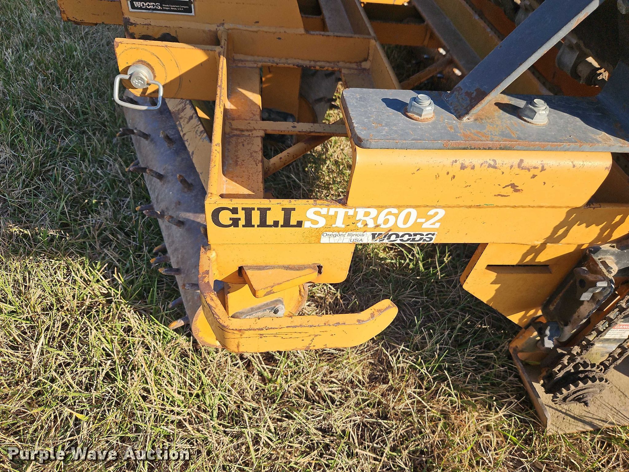 Woods STR60-2 Seeder Attachment. Serial: 963693. Dimensions Overall Length: 48", Width: 69", Height: 36". Features Width: 60", Hitch: Three point, Seed delivery, Bulk fill system. Notes Drive chain missing. Gaston's Lawn & Landscape. Baldwin City, KS 66006