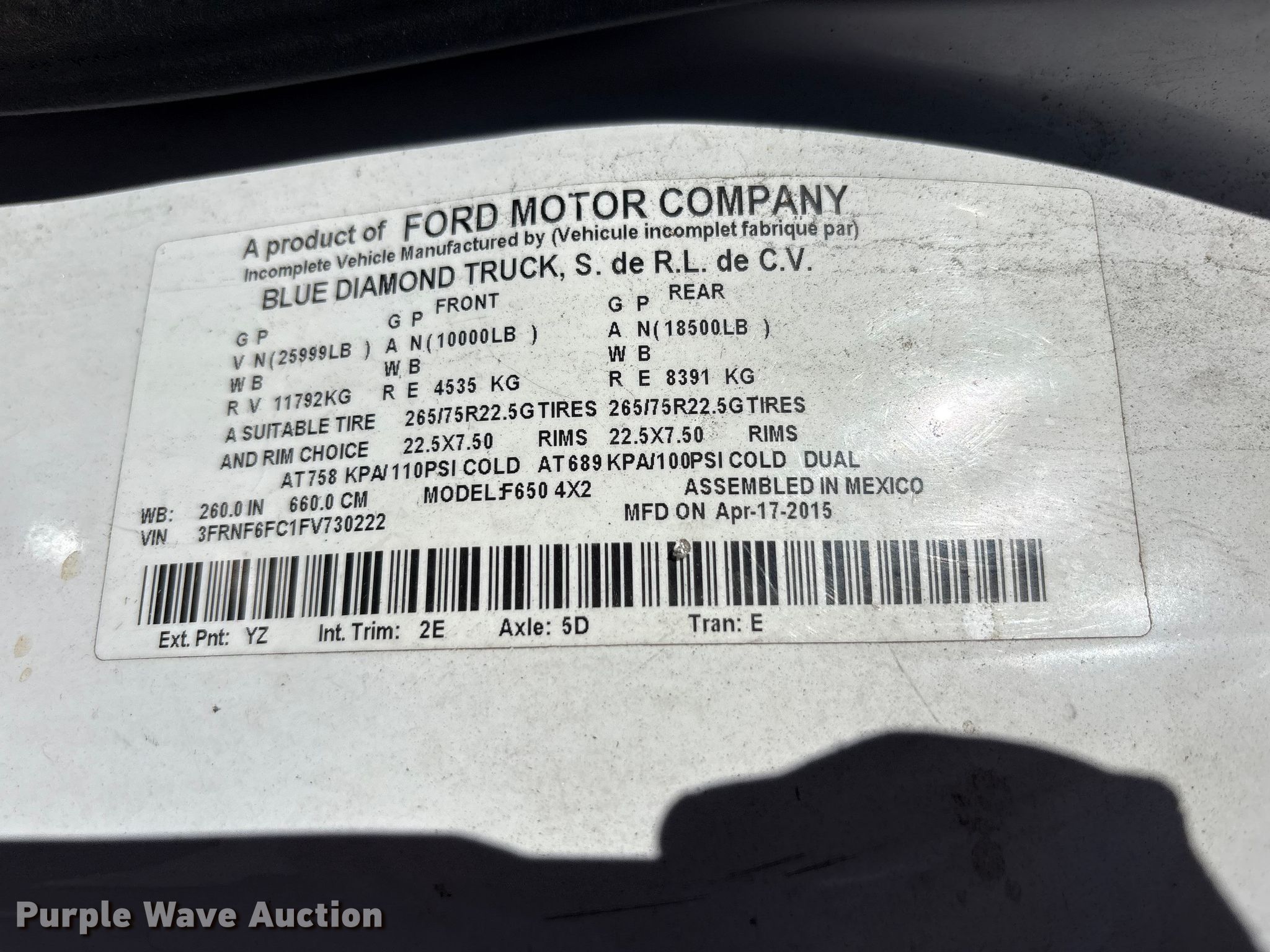 2015 Ford F650 shuttle bus. Miles: 112,083 on odometer, Hours: 15,905 on meter, VIN: 3FRNF6FC1FV730222. Engine Cummins, Displacement: 6.7L, Cylinders: 6, Fuel type: Diesel. Transmission Automatic. Chassis Axles: Single, Suspension: Air, Brakes: Hydraulic, GVWR: 25,999 lbs. Interior AC, Heat, Cruise control, Passengers: 37. Tires Size: 255/70R22.5. Notes Dash warning indicator: Check engine. Tennessee title. Seller is a Tennessee licensed motor vehicle dealer. The buyer may be required to pay sales tax and/or registration fees to the dealer prior to taking possession. Buyers may be required to provide identification to the licensed dealer to comply with state laws. Title will be assigned and distributed by the dealer. Please contact the seller for distribution questions. Carpenter Bus Sales. Franklin, TN 37067