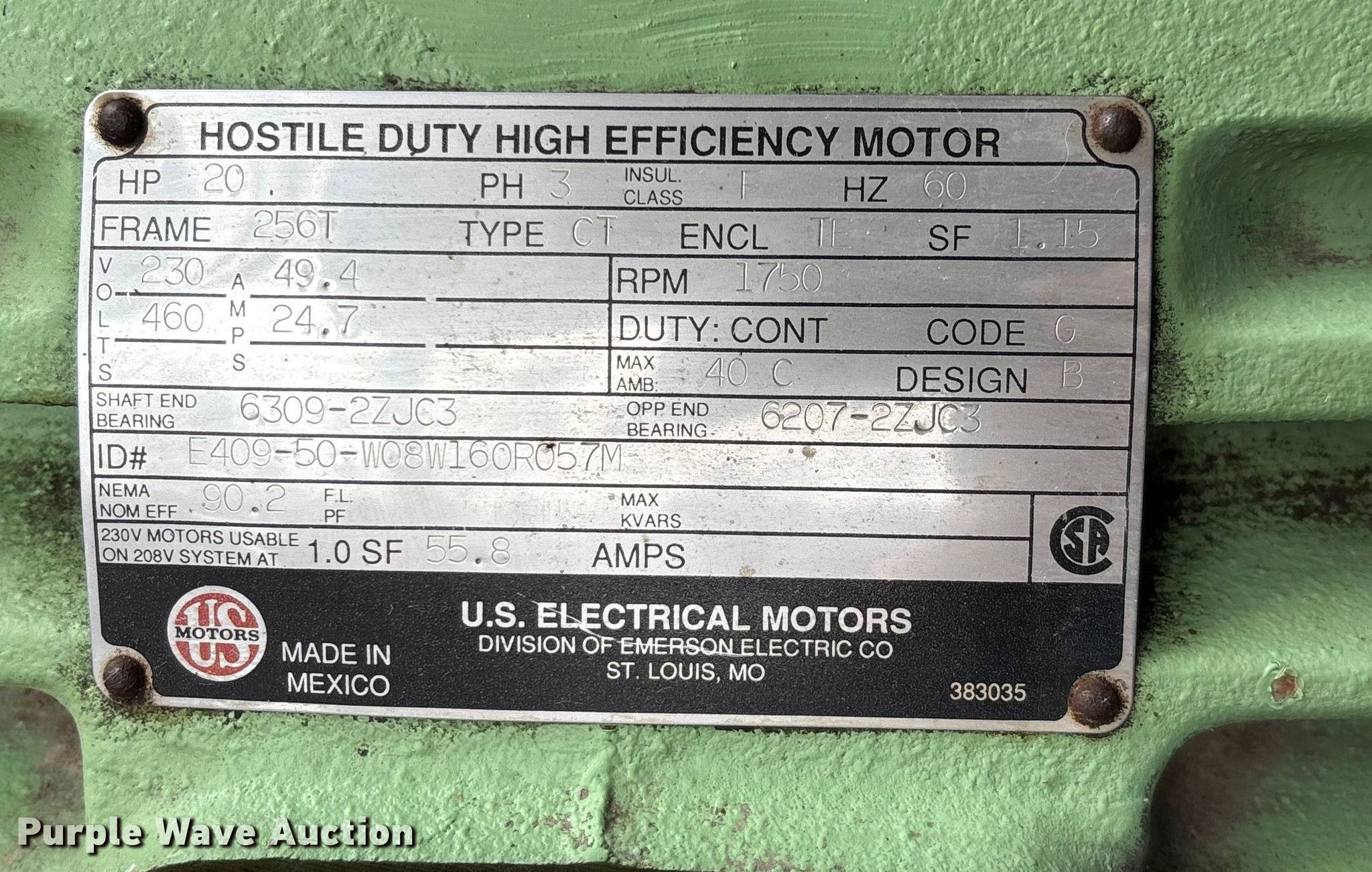 U.S Electrical Motors Hostile Duty electric motor. Serial: 383035. Electric Motor HP: 20, Volts: 230/460, Phase: Three. Notes Unused. Complete Auto Sales LLC. Diamond, MO 64840