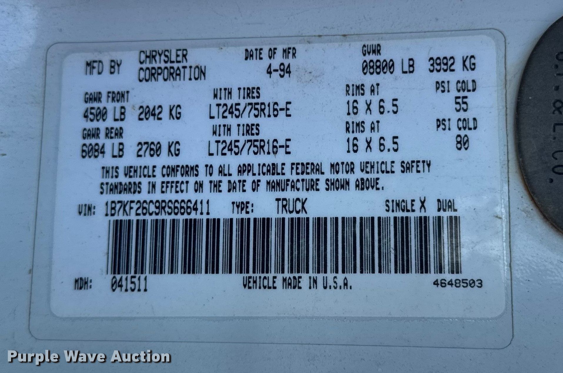 Purple Wave is selling a used 3/4 or 1 Ton Pickup or Van in Illinois. This item is a 1994 Dodge Ram 2500 pickup truck with the following: Miles: 107,293 on odometer, VIN: 1B7KF26C9RS666411