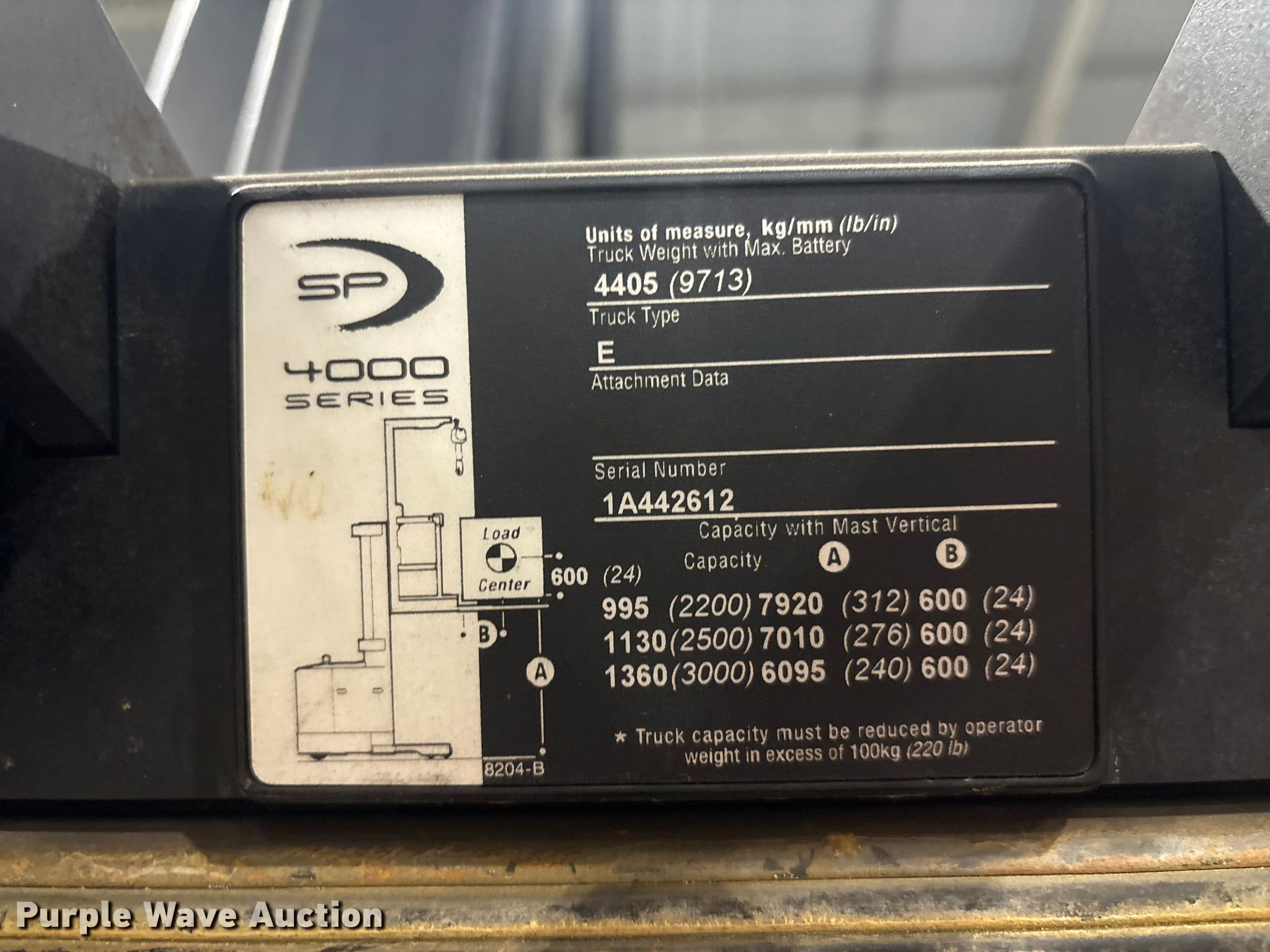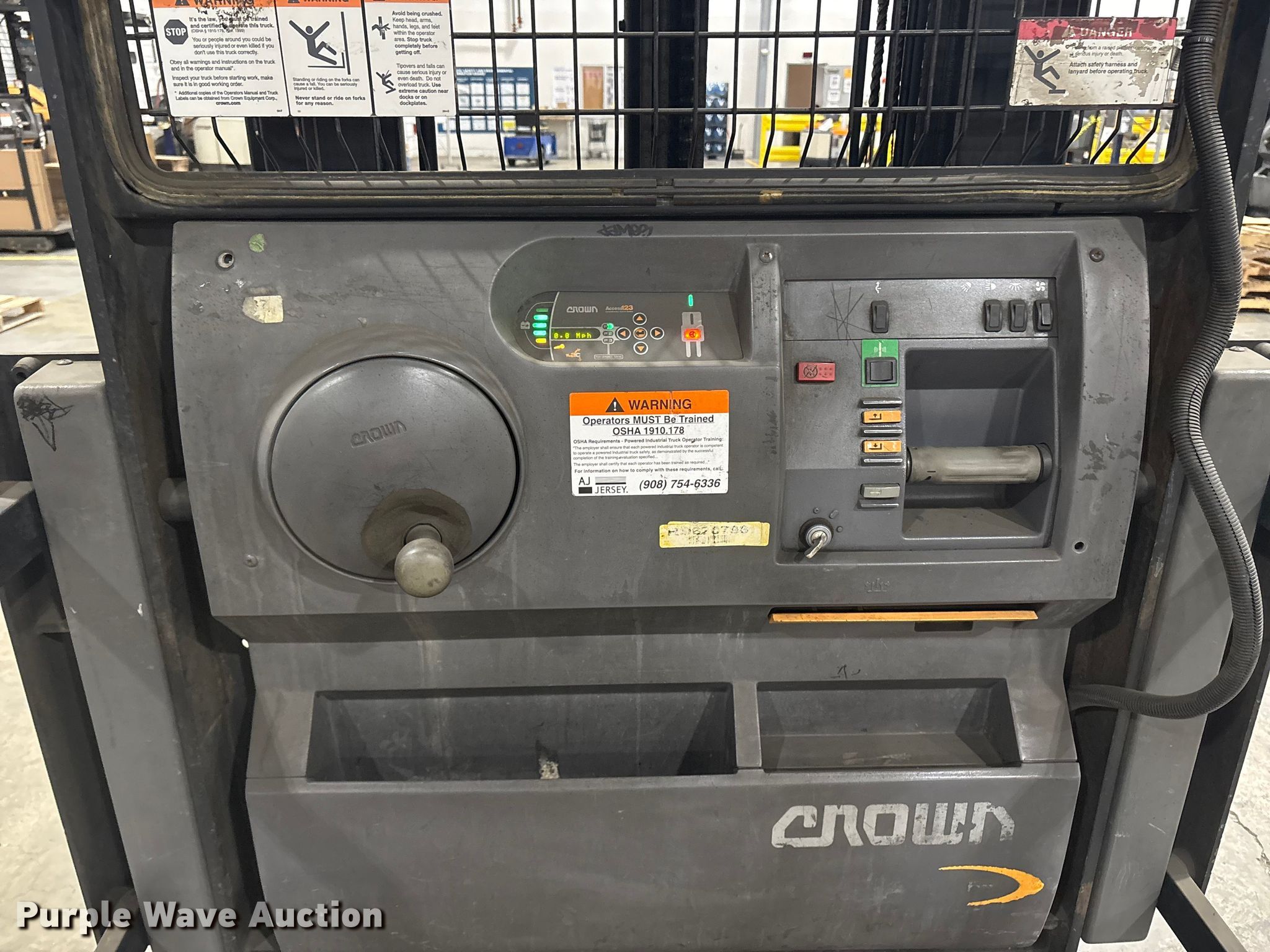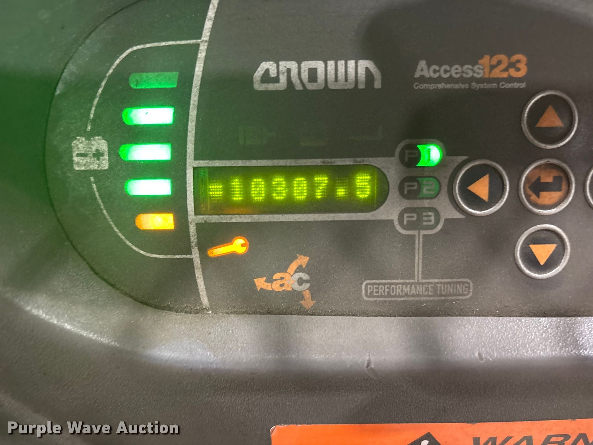 Purple Wave is selling a used Warehouse Forklift in New Jersey. This item is a 2015 Crown SP4050-30 order picker with the following: Hours: 10,308 on meter, Miles or hours may vary, unit still in use, Serial: 1A442612, Unit #: SFS2599