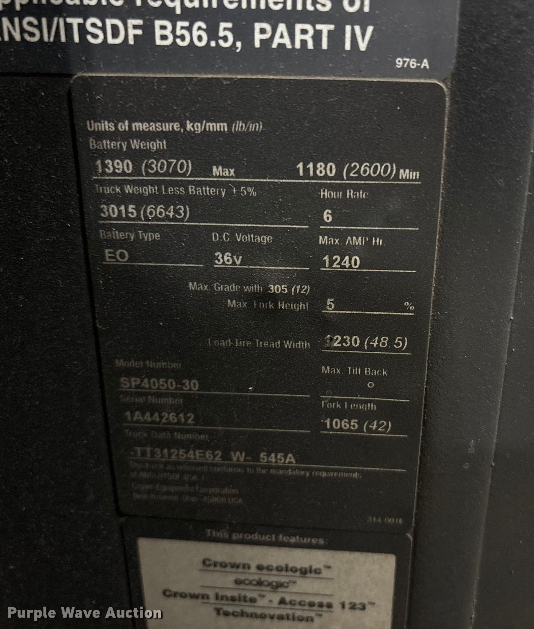 2015 Crown SP4050-30 order picker. Hours: 10,308 on meter, Miles or hours may vary, unit still in use, Serial: 1A442612, Unit #: SFS2599. Electric Motor Volts: 36. Transmission Electric drive. Features Maximum lift capacity: 3,000 lbs, Collapsed mast height: 132", Mast stages: 3, Fork length: 42". Tires Solid, Non-marking. Notes Dead battery. Ferguson. Secaucus, NJ 07094