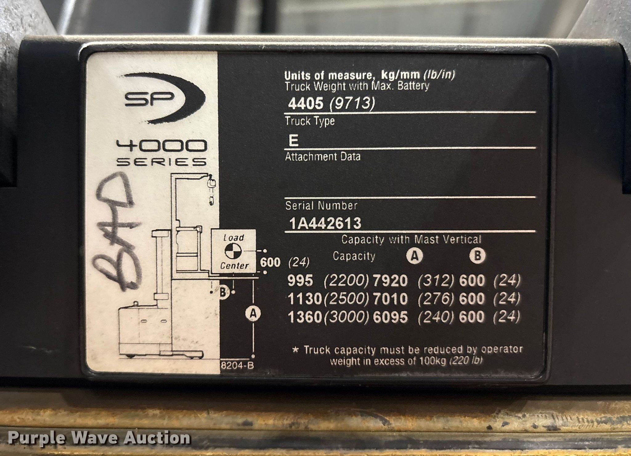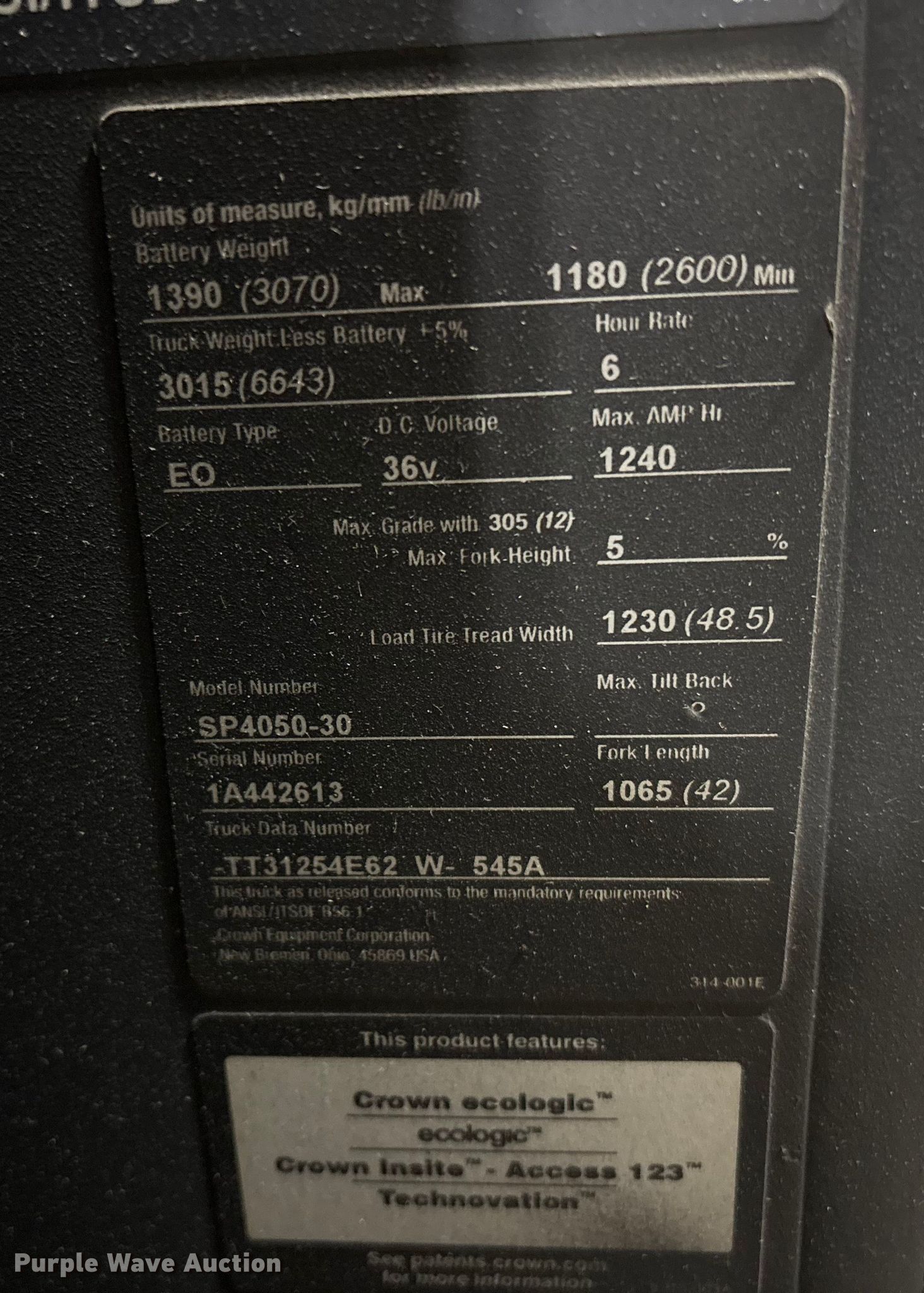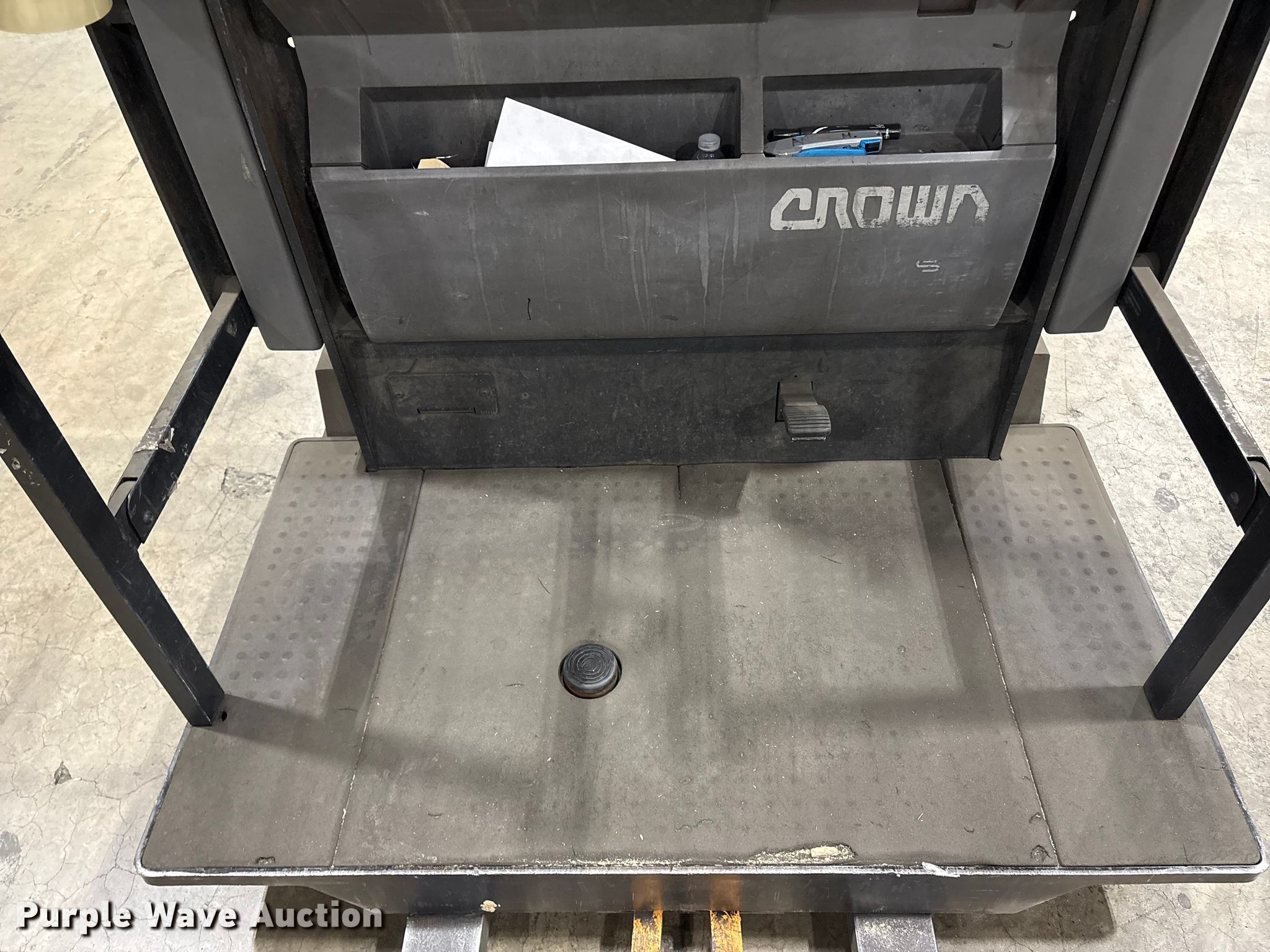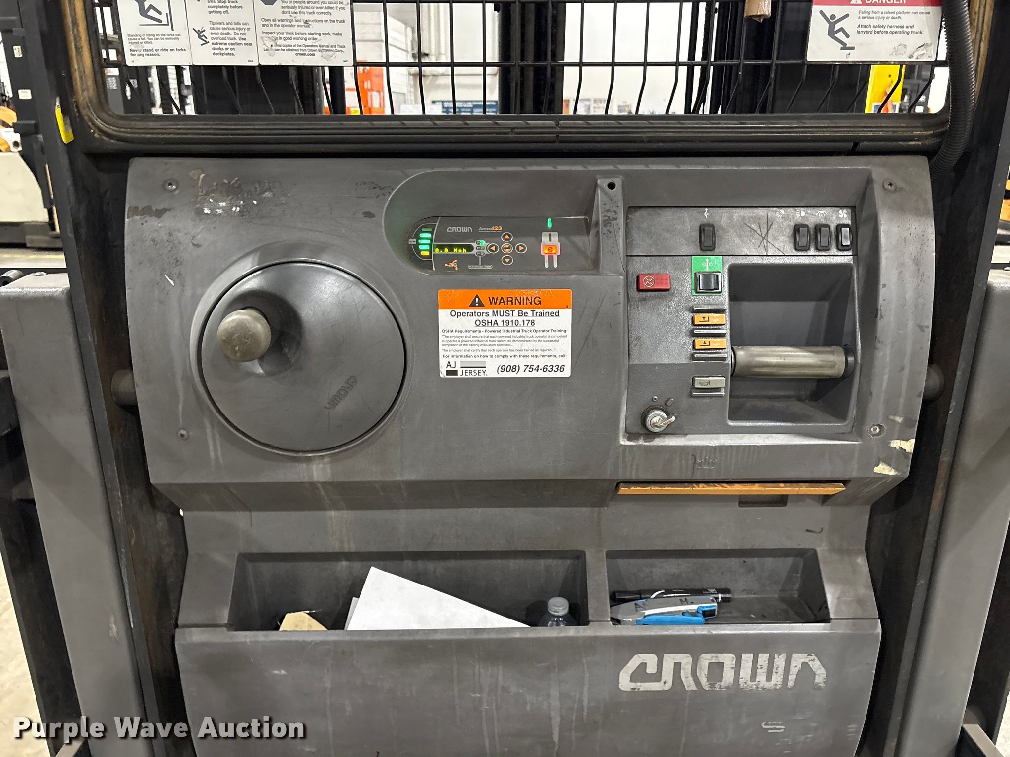Purple Wave is selling a used Warehouse Forklift in New Jersey. This item is a 2015 Crown SP4050-30 order picker with the following: Hours: 9,992 on meter, Miles or hours may vary, unit still in use, Serial: 1A442613, Unit #: SFS2598