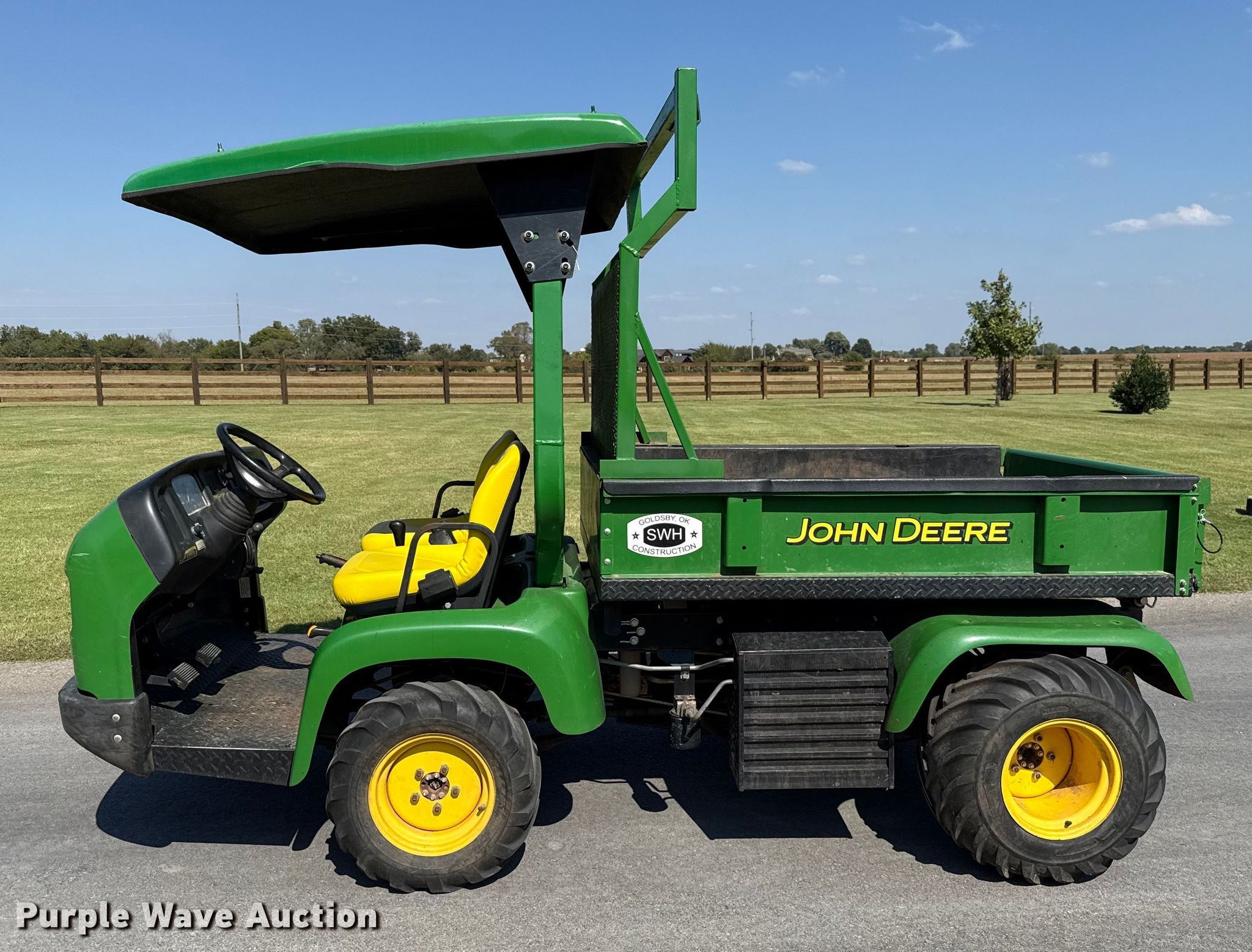 2016 John Deere ProGator 2030A utility vehicle. Hours: 1,354 on meter, VIN: 1TC203AFPGT085122. Engine Yanmar 3TNV80F-NCJUV, Serial: CH3U13D062592, Displacement: 1.267L, Cylinders: 3, Fuel type: Diesel, Electric start. Transmission Manual, Speed: 5. Chassis Four wheel drive/ All wheel drive. Operators station OROPS, Canopy. Features Receiver hitch, Dump bed 64" L x 50" W, Dump bed type: Electric/ Hydraulic. Tires Front: 23X10.50-12, Rear: 26X12.00-12. Transfer of ownership documentation will be a bill of sale. SWH Construction. Norman, OK 73072