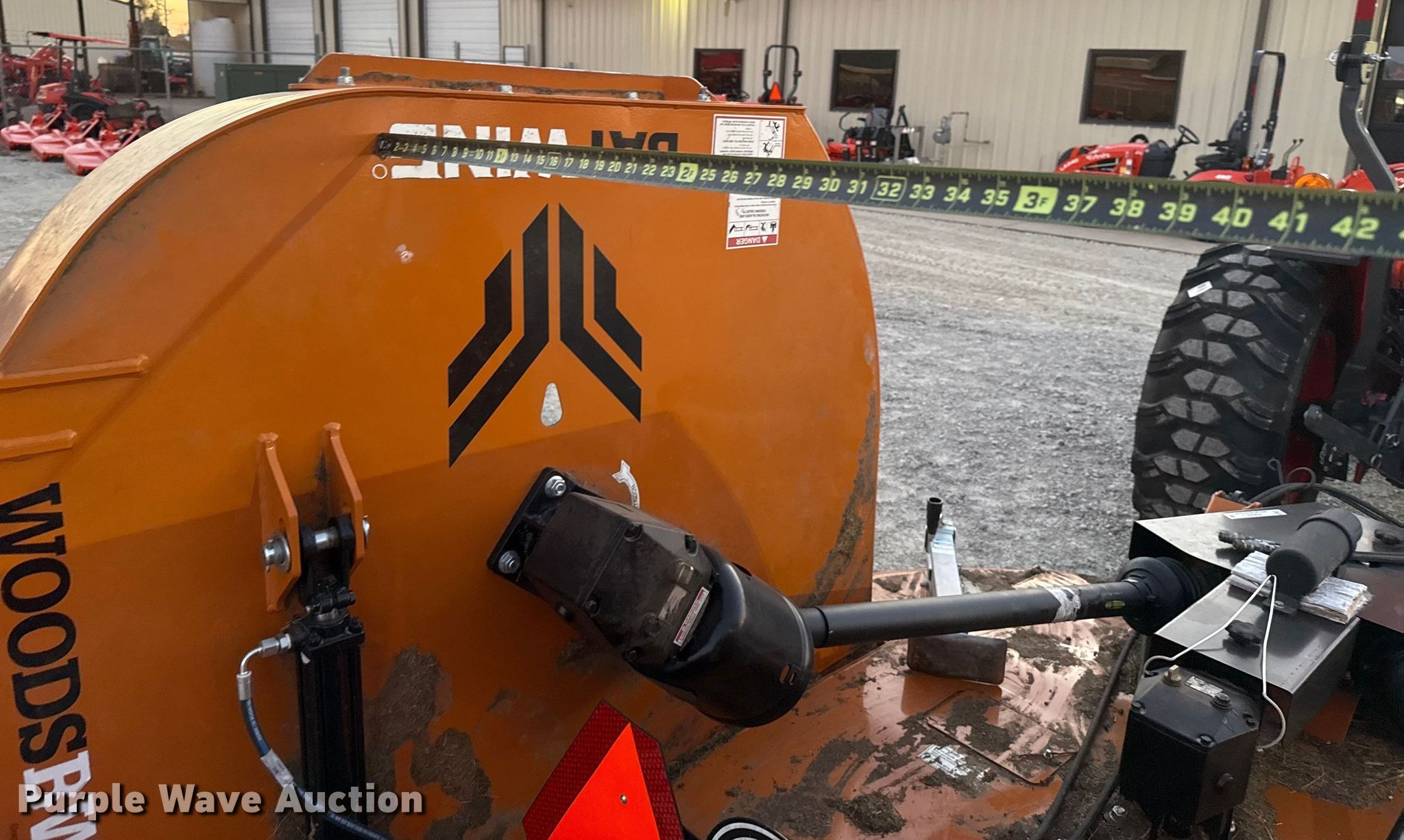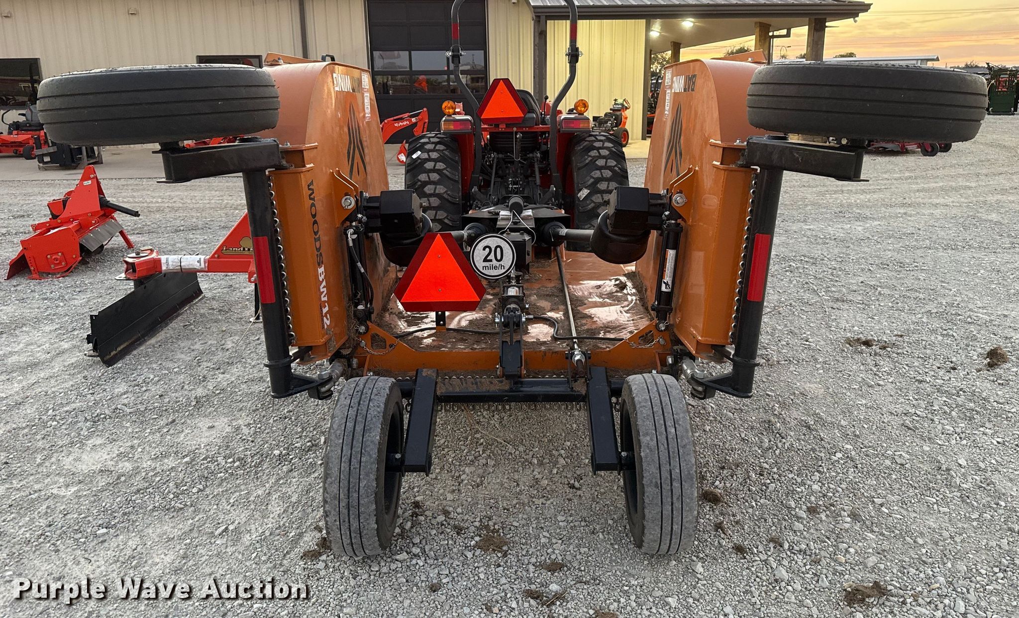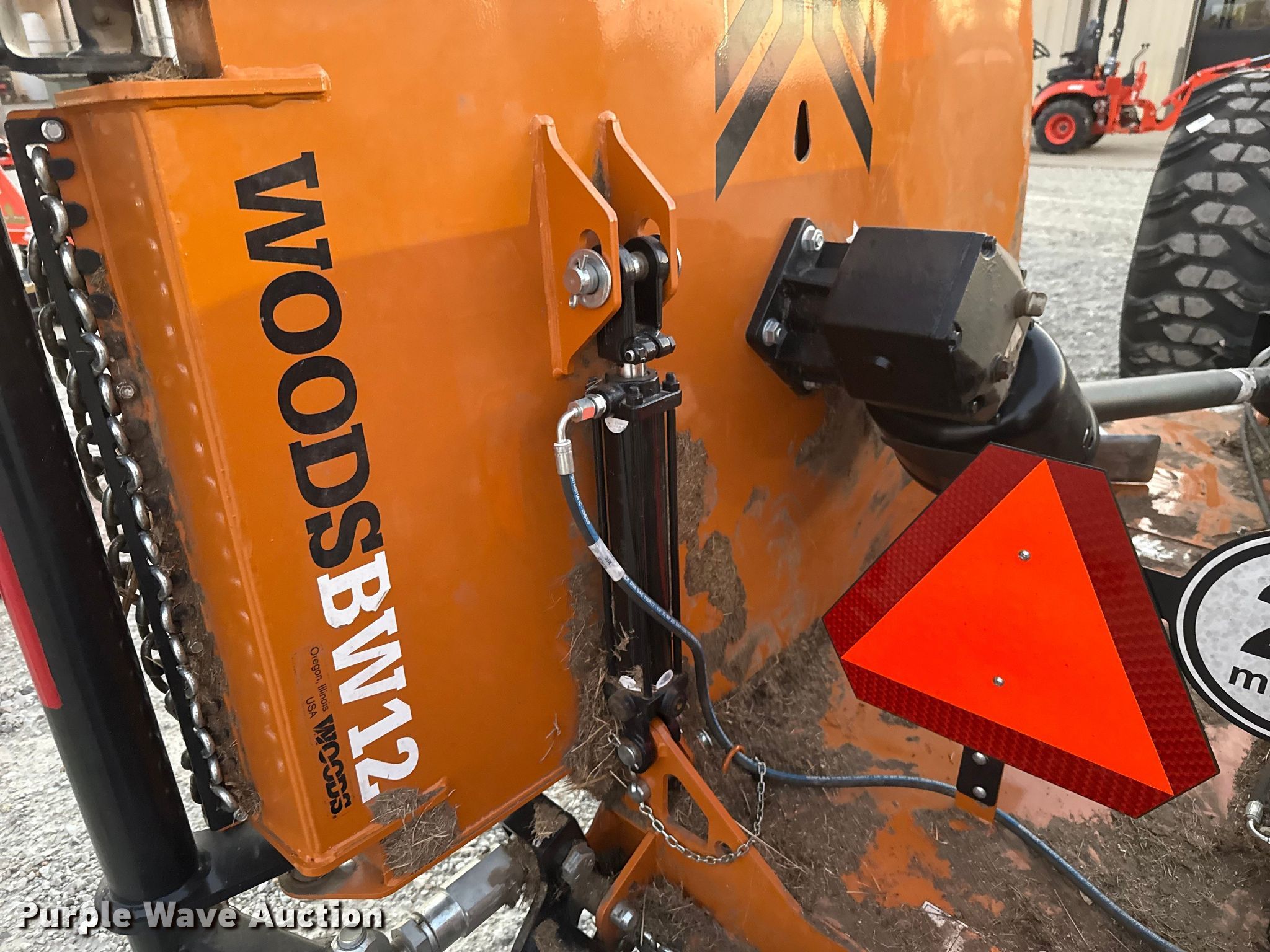 Woods BW12 batwing rotary mower. Serial: 10009034753001. Features Width: 12', Hitch: Pin. Tires Size: 25.5X8-14. Notes Tractor not included. Great Plains Kubota. 14280 U.S. 177. Shawnee, OK 74804