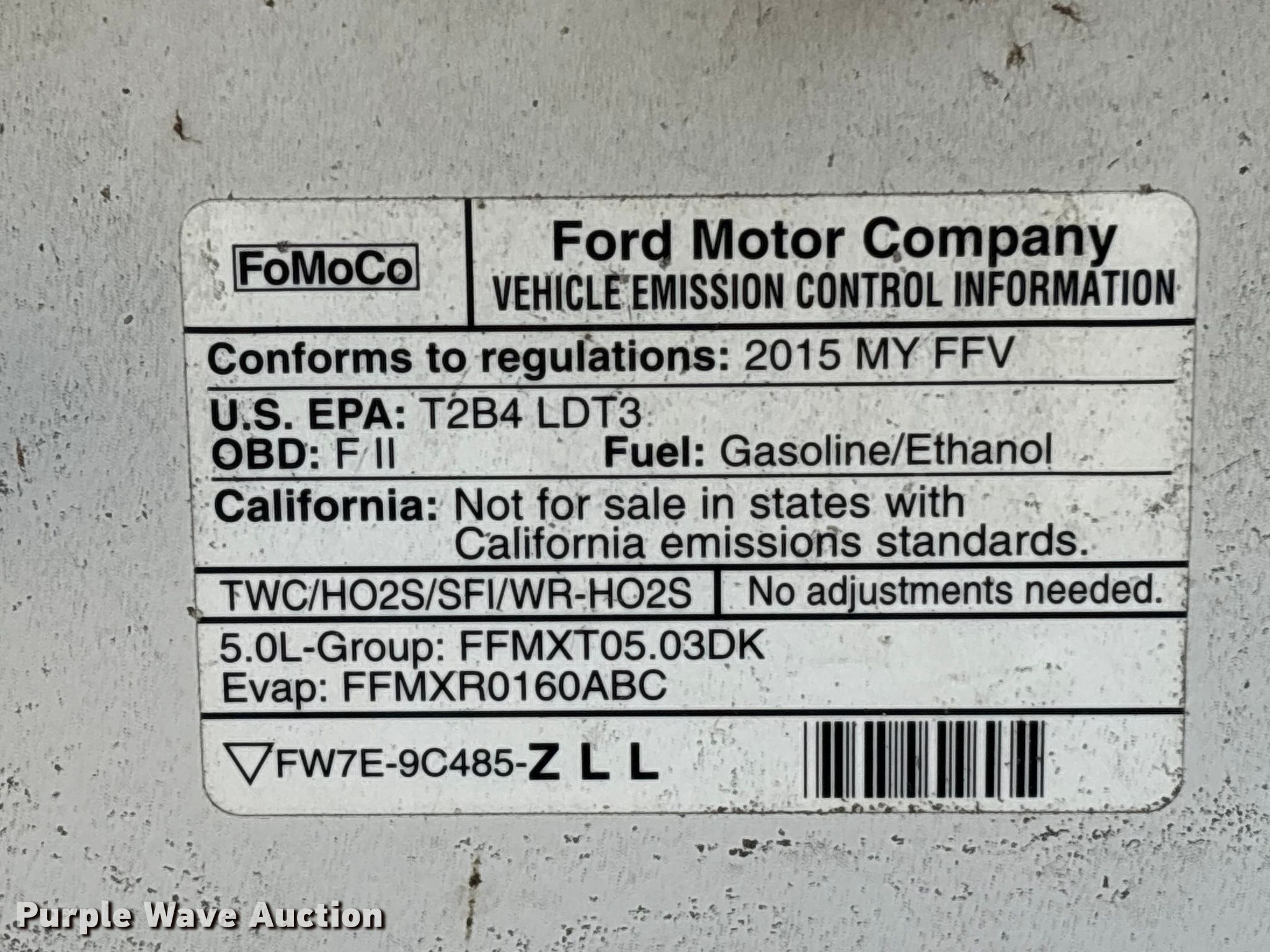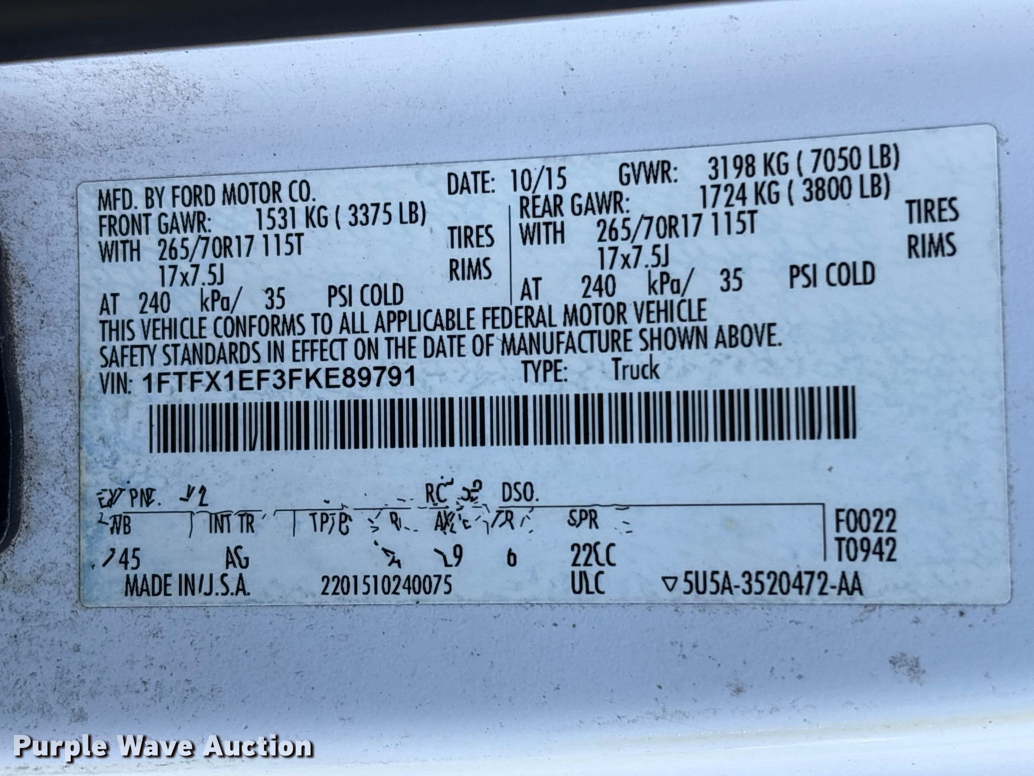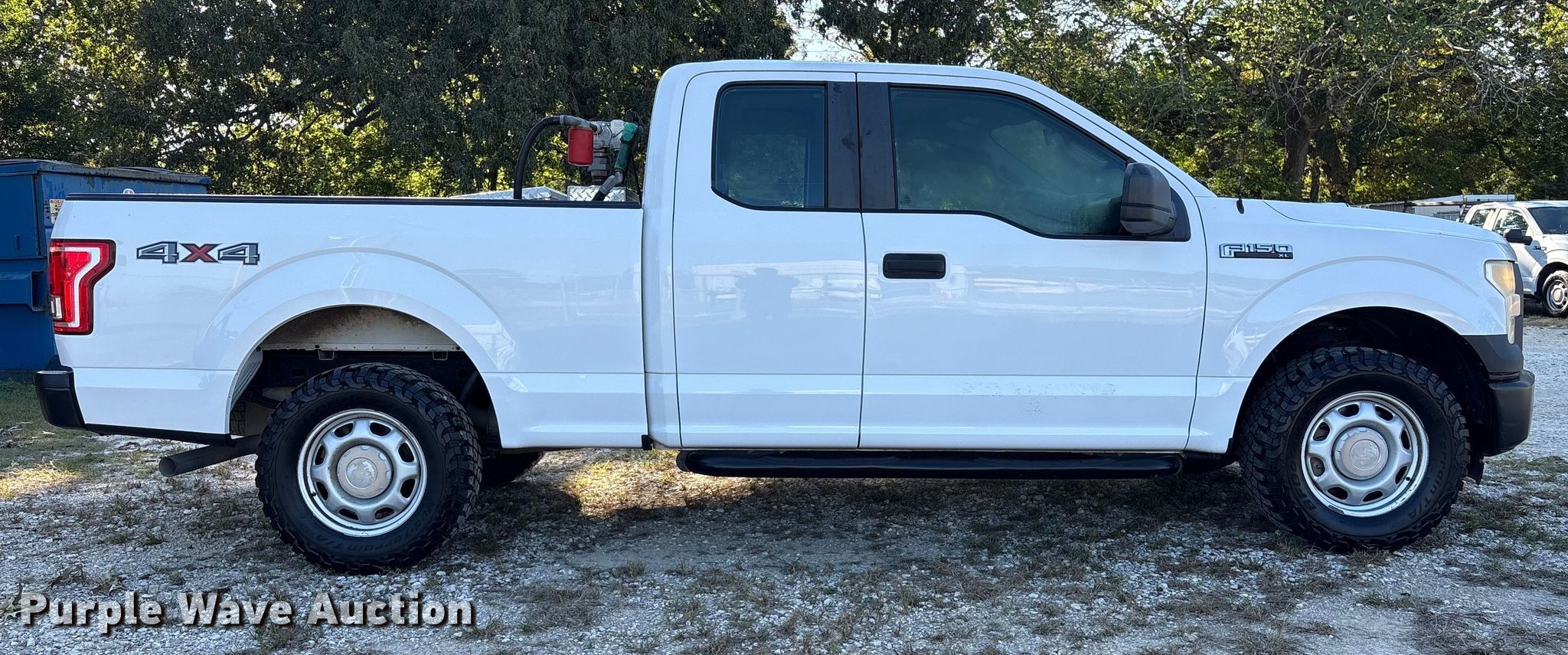 2015 Ford F150 XL SuperCab pickup truck. Miles: 143,678 on odometer, VIN: 1FTFX1EF3FKE89791. Engine Displacement: 5.0L, Cylinders: 8, Fuel type: Gas. Transmission Automatic, Four wheel drive. Interior AC, Heat, Power windows, Power locks, Cruise control, Brake controller. Features Toolbox, Fuel tank with pump included. Tires Size: 265/70R17. Notes Dash warning indicator: TPMS, Windshield chipped or cracked. Texas title. Seller is a government entity who will be assigning and distributing the title. Please contact the seller for distribution questions. Lower Neches Valley River Authority. Beaumont, TX 77708