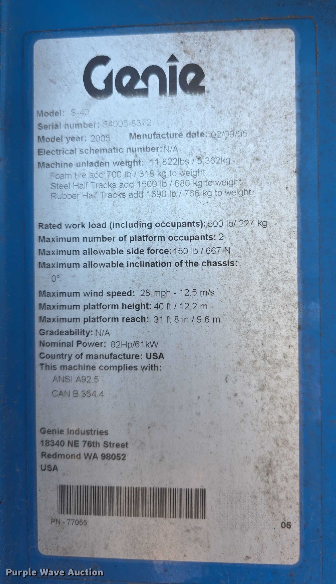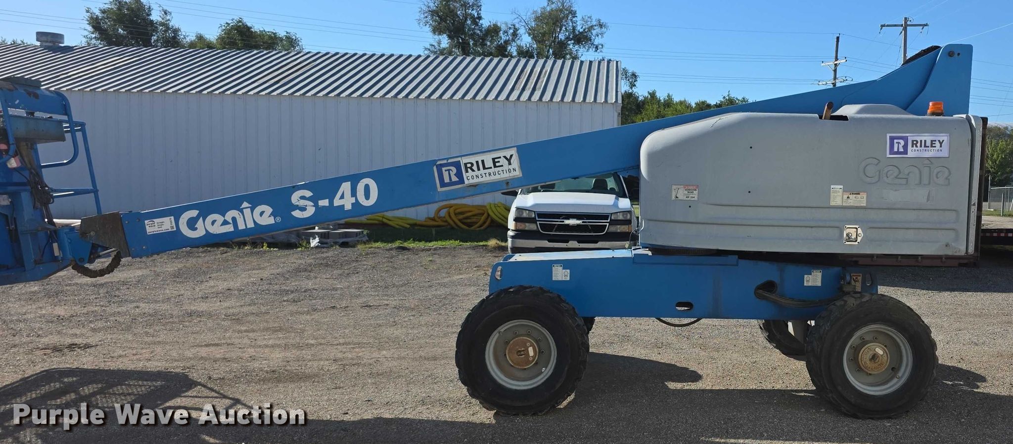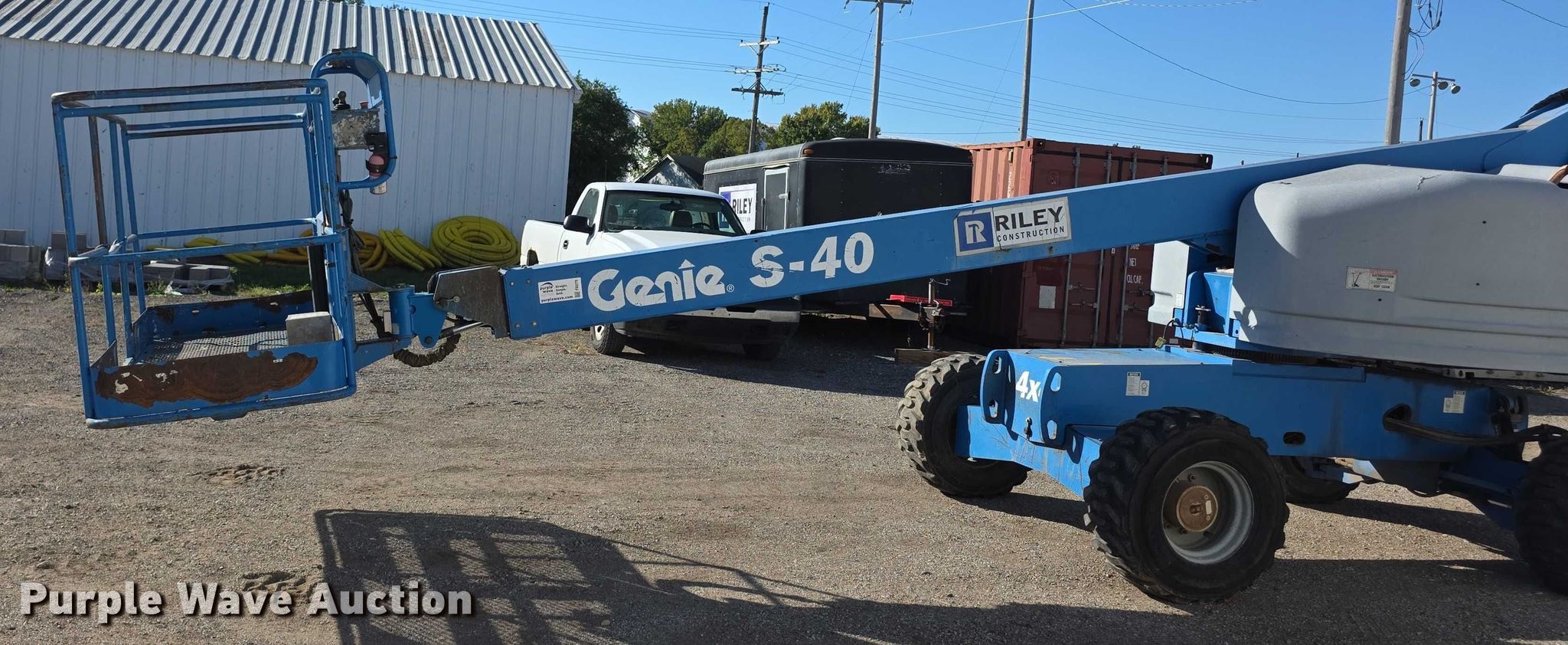 2005 Genie S-40 boom lift. Hours: 4,559 on meter, Serial: S4005-8372. Engine Ford LRG425, Serial: 04PG37030, Fuel type: Dual fuel LP bottle: Included, HP: 82. Chassis Four wheel drive. Features Rough terrain, Boom type: Telescopic, Maximum lift capacity: 500 lbs, Maximum reach length: 31' 8", Maximum lift height: 40', Platform: 93" L x 33" W, Controls: Platform, Ground, Platform rotation: Hydraulic. Tires Tire size: 12-16.5. Notes Decals will be removed prior to auction. Riley Construction Company, Inc.. Wamego, KS 66547
