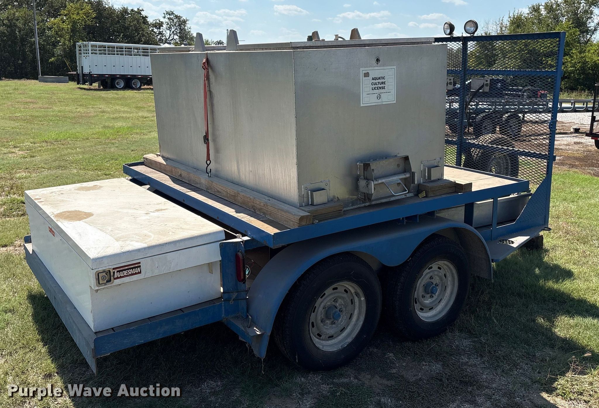1996 EE Smith Trailer fishery trailer. VIN: 1E9BA1528T1083035. Dimensions Overall Length: 15', Width: 8', Deck Length: 12', Width: 77". Features Deck type: Wood, Tank Dimensions: 7' L x 46" W x 36" H. Chassis Ball hitch: 2", Landing gear: Single, Suspension: Spring, Axles: Tandem. Tires Steel wheels, Size: 225/75R15. Transfer of ownership documentation will be a bill of sale. Noble Research Institute. Ardmore, OK 73401
