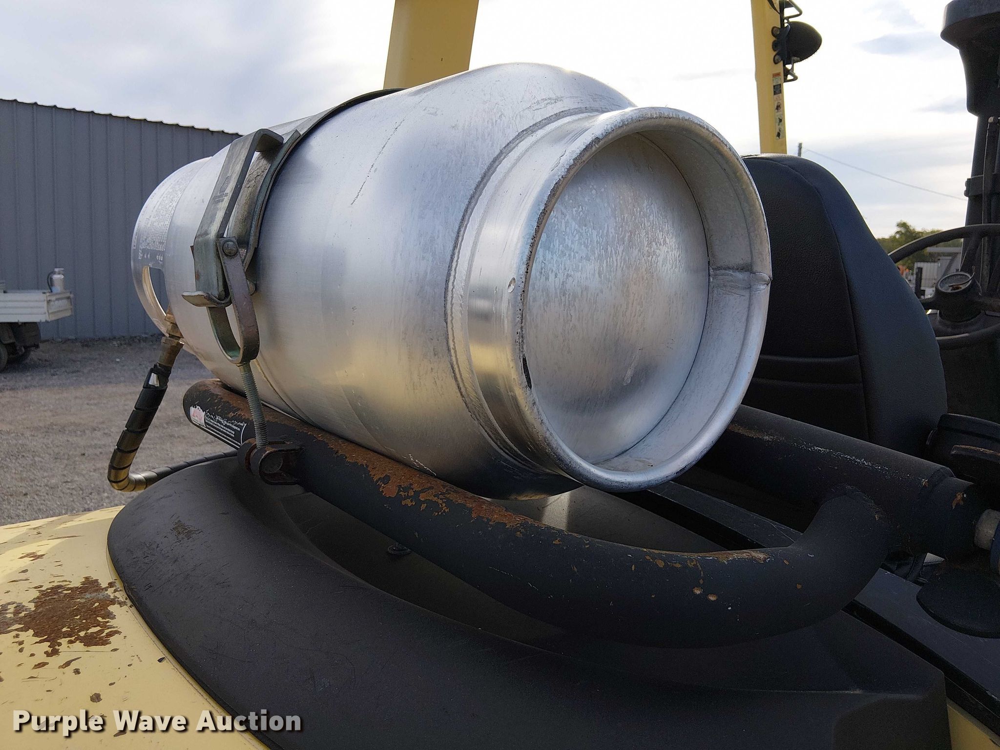2004 Hyster H80XM forklift. Hours: 4929 on meter, Serial: L005V02929B. Engine Cylinders: 6, Fuel type: LPG LP bottle: Included. Transmission Powershift, 1F - 1R. Operators station Canopy. Features Maximum lift capacity: 6,750 lbs, Maximum lift height: 185", Collapsed mast height: 88", Mast stages: 2, Side shift, Mast tilt, Fork length: 71". Tires Front: 7.00-15, Rear: 6.00-12, Solid. Notes Tires damaged. Collinsville, OK 74021