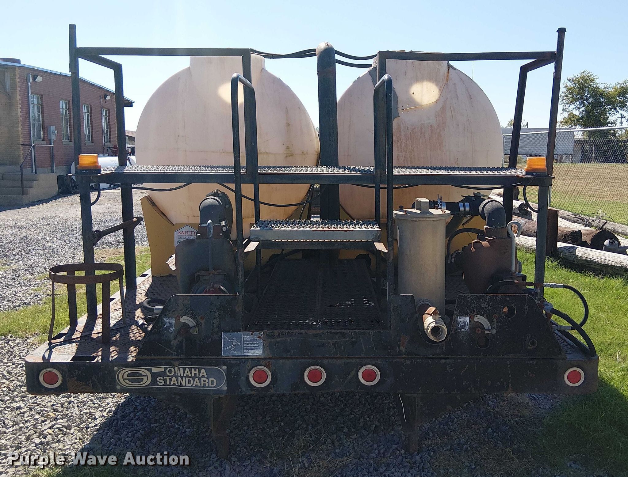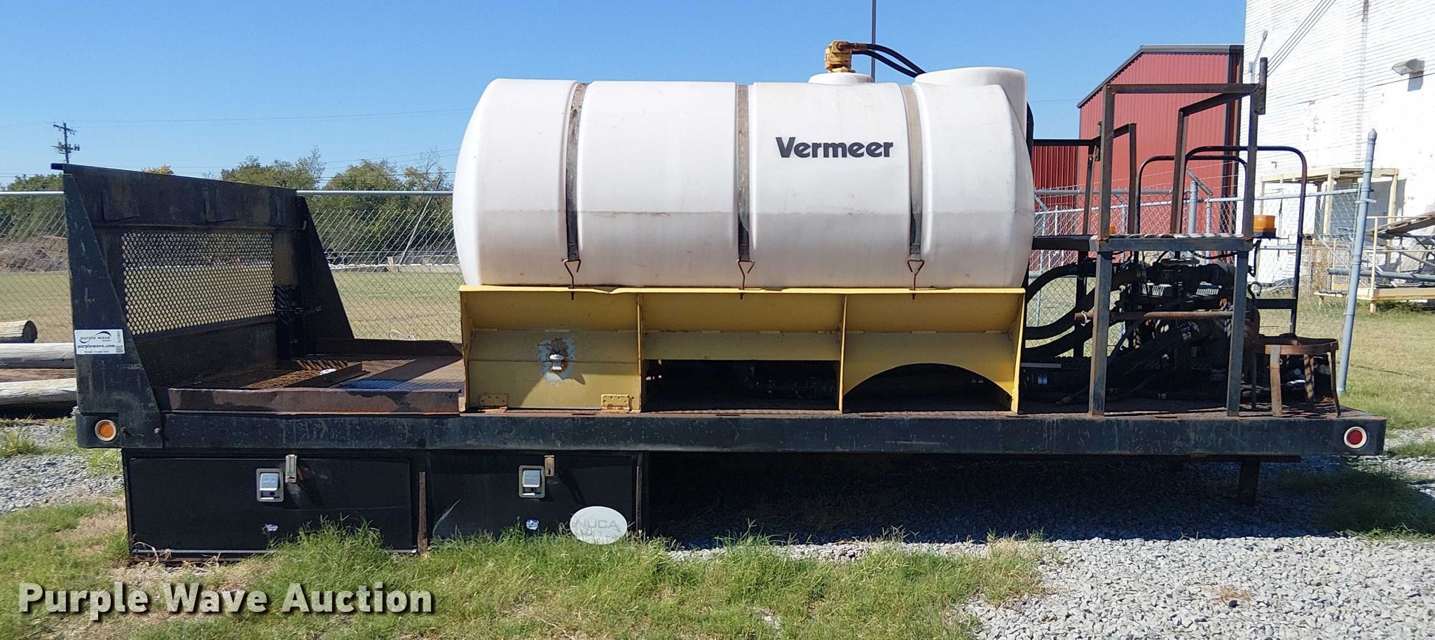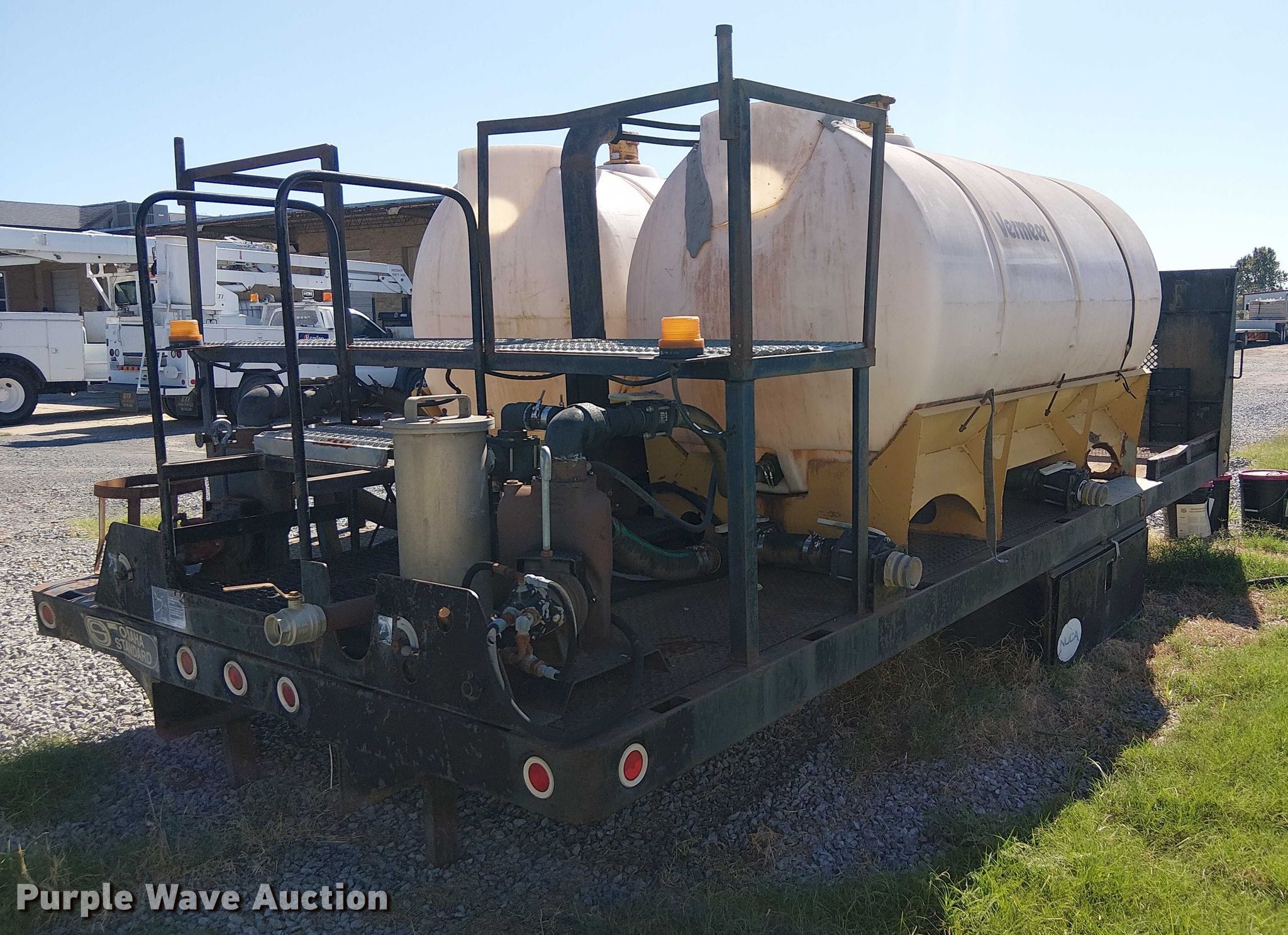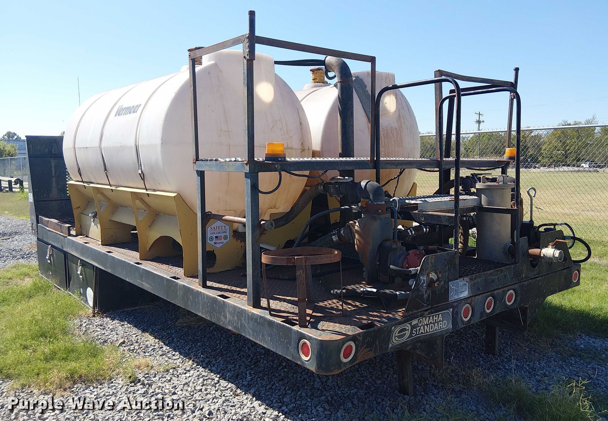 Omaha Standard flatbed. Length: 17' 10", Width: 96". Notes (2) Vermeer poly tanks, (2) pumps, Unknown operating condition of contents. REI Holdings LLC. Muskogee, OK 74403