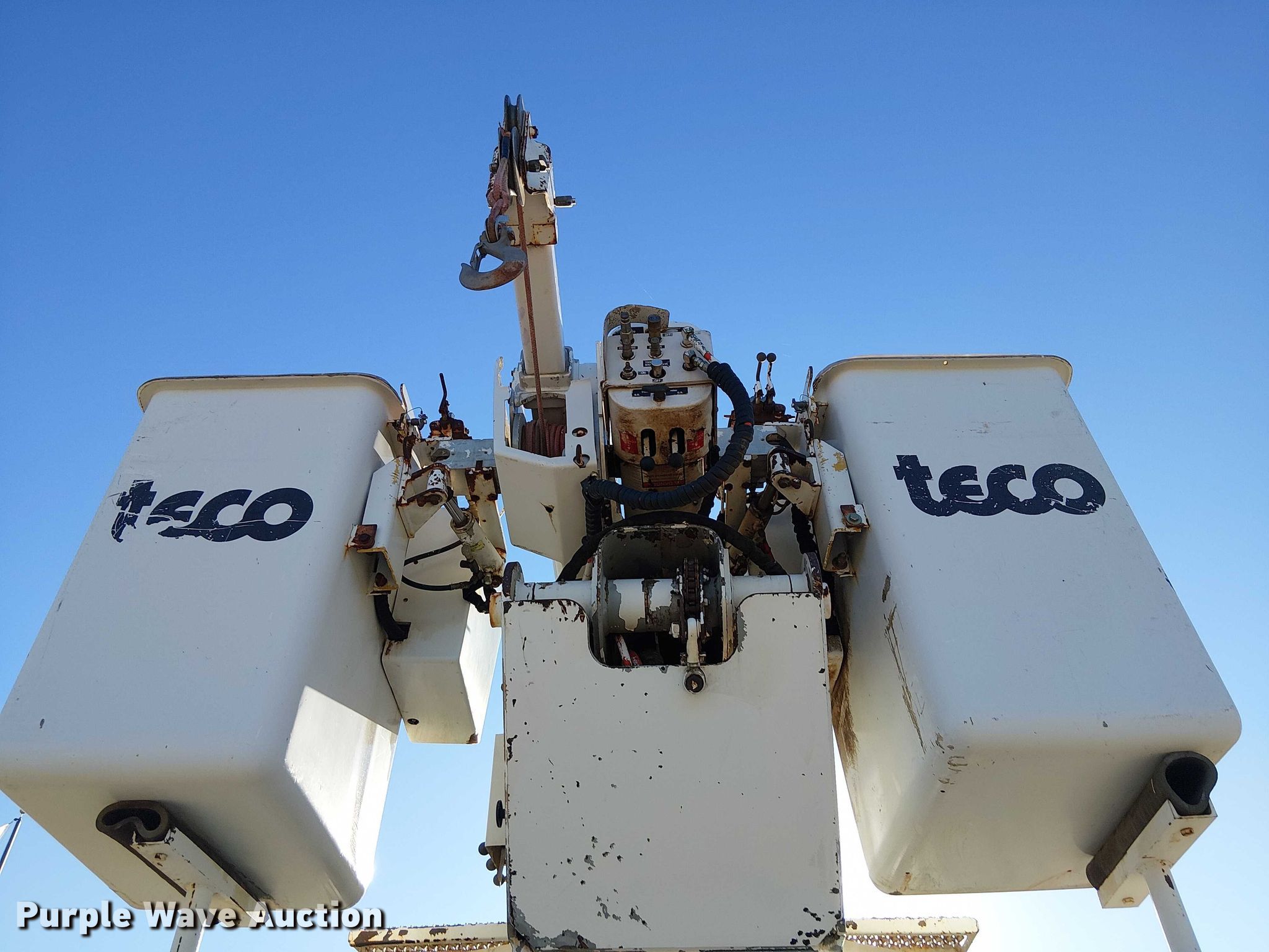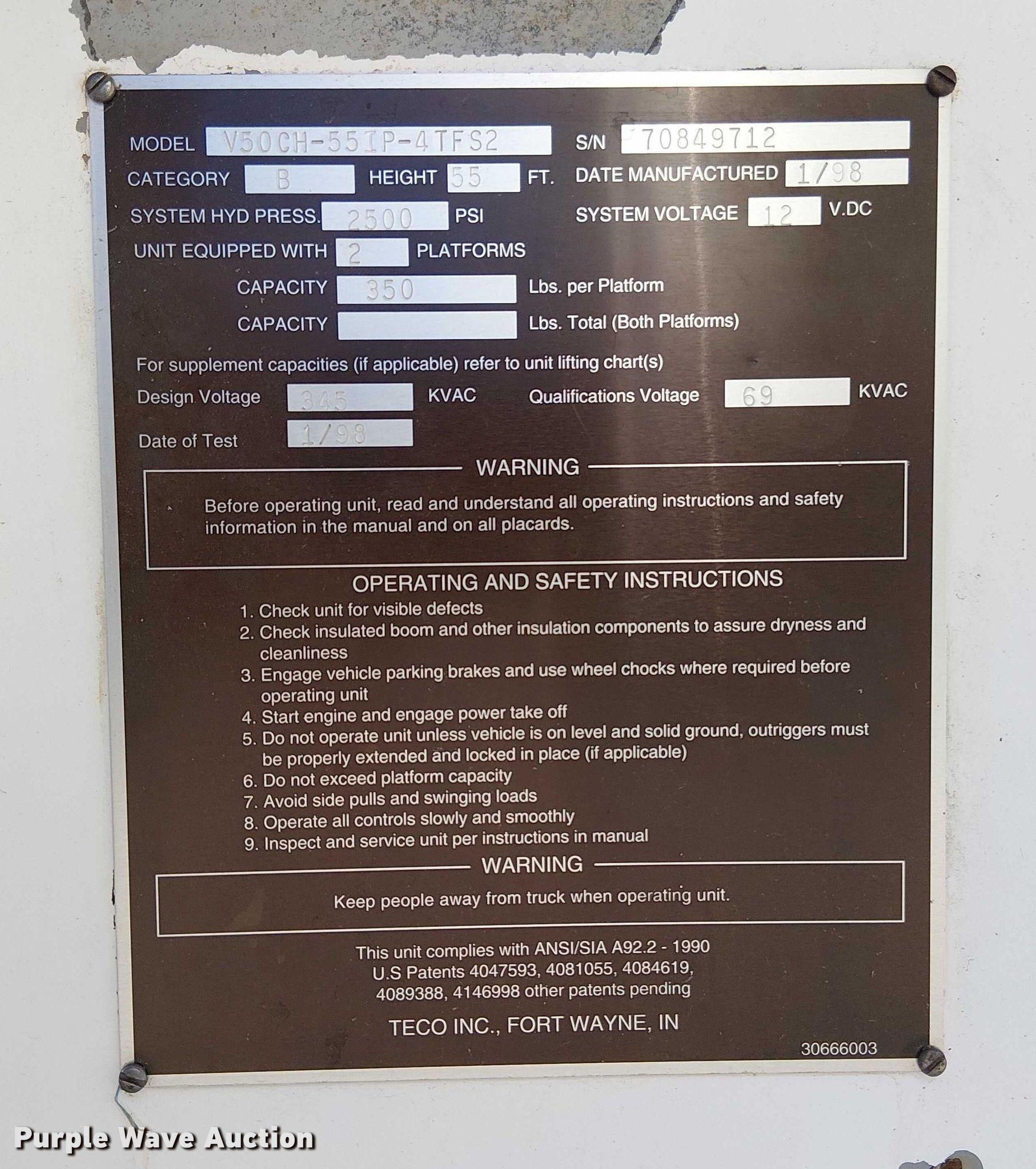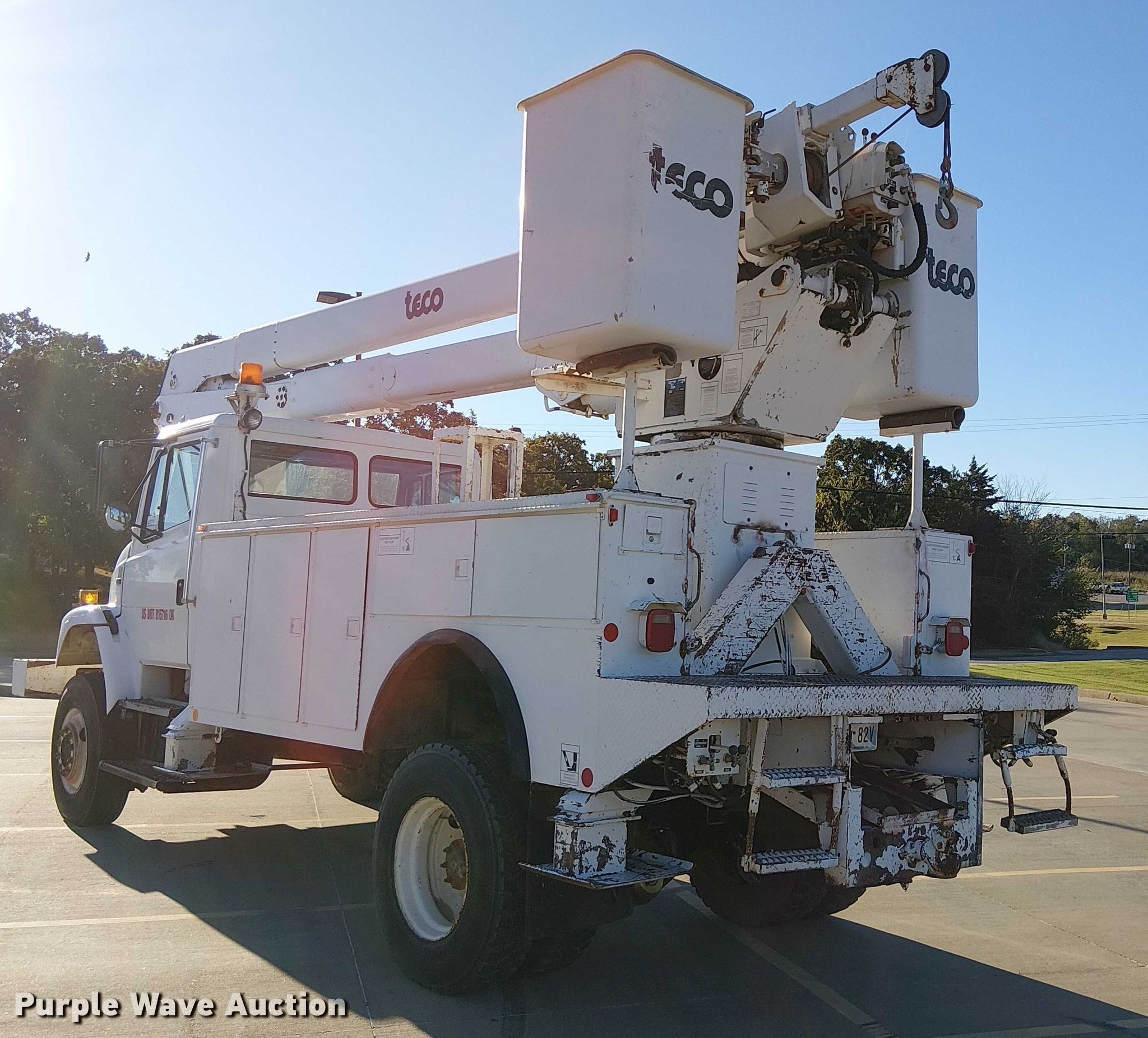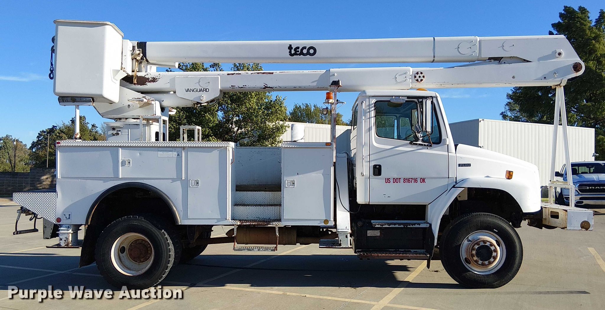1998 Freightliner FL80 bucket truck. Miles: 92,799 on odometer, Hours: 8,755 on meter, VIN: 1FV2JJBB5WH949813. Engine Caterpillar 3126, Serial: 1WM23585, Displacement: 7.2L, Cylinders: 6, Fuel type: Diesel. Transmission Eaton Fuller, Manual, Speed: 7. Chassis Four wheel drive, Axles: Single, Suspension: Spring, Brakes: Air, PTO, GVWR: 36,220 lbs. Interior AC, Heat, Cruise control. Features Bed Utility bed, Length: 14' 6", Width: 95", Boom 1998 Teco V50CH-55TP-4TFS2, Serial: 70849712, Maximum lift capacity: 350 lbs, Maximum lift height: 55', Boom type: Articulating, Insulated, Telescopic, Man basket, Boom controls Platform/ basket, Material handler. Tires Size: 11R22.5. Notes Windshield chipped or cracked. Oklahoma title. Title distribution may be delayed up to 14 days from verification of funds. US Tank Trucks Inc. Drumright, OK 74030