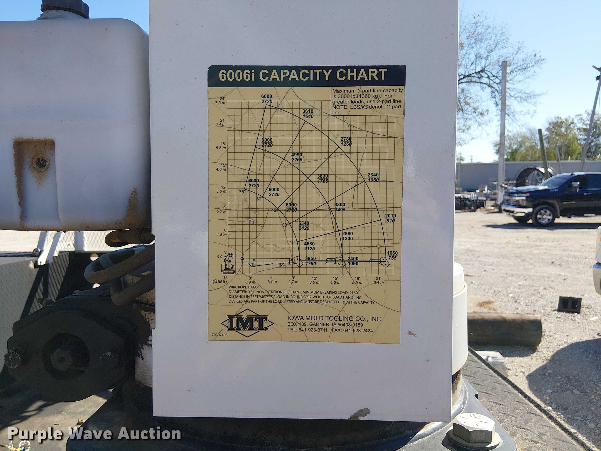 Utility bed. Features. Bed Utility bed, Length: 9' 1", Width: 94", Crane IMT 6006i, Boom length: 21', Maximum lift capacity: 6,000 lbs. Notes Unknown operating condition of crane. Third Generation Electric. Tulsa, OK 74132