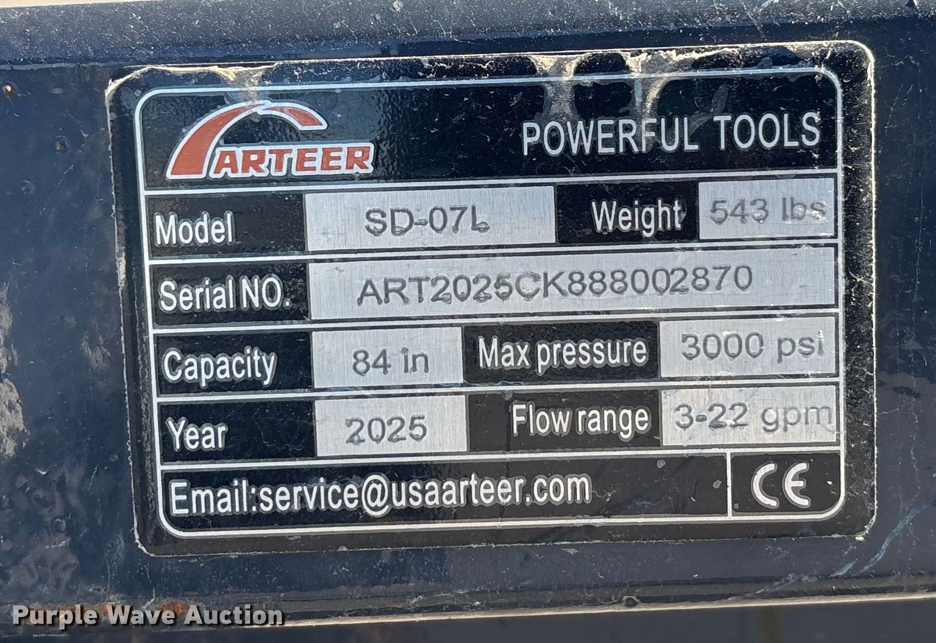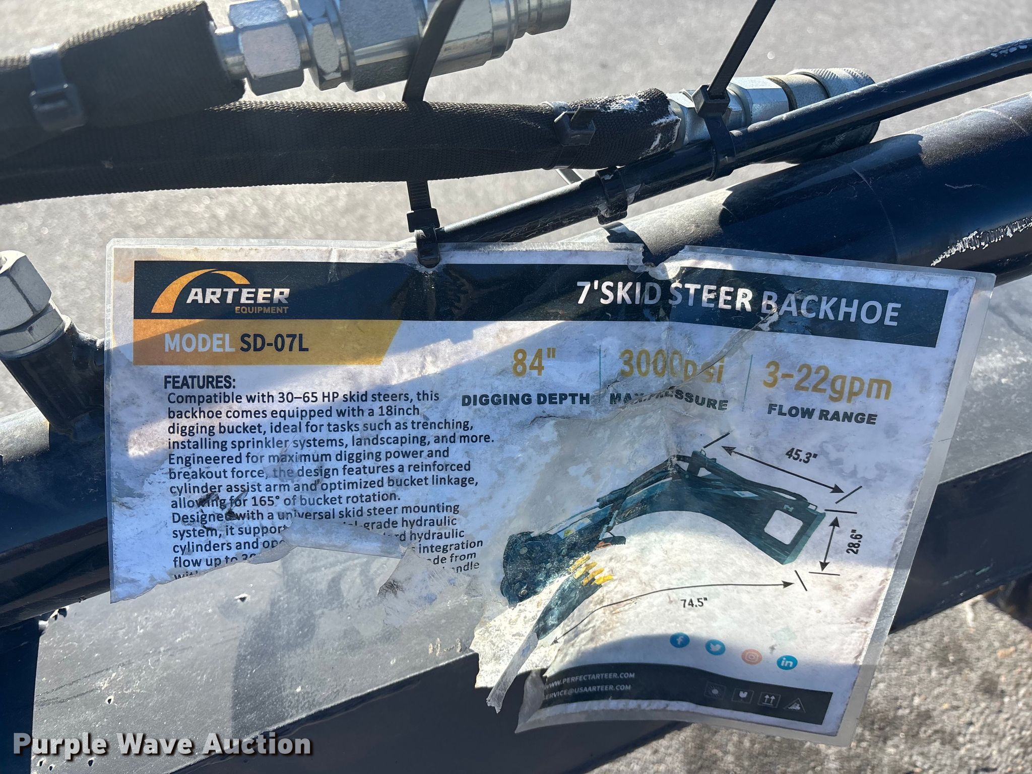 Purple Wave is selling a used Skid Steer Attach. in Nebraska. This item is a 2025 Arteer SD07L skid steer backhoe with the following: Serial: ART2025CK888002870, Width: 17", Length: 84", PSI: 3000, GPM: 3 to 22