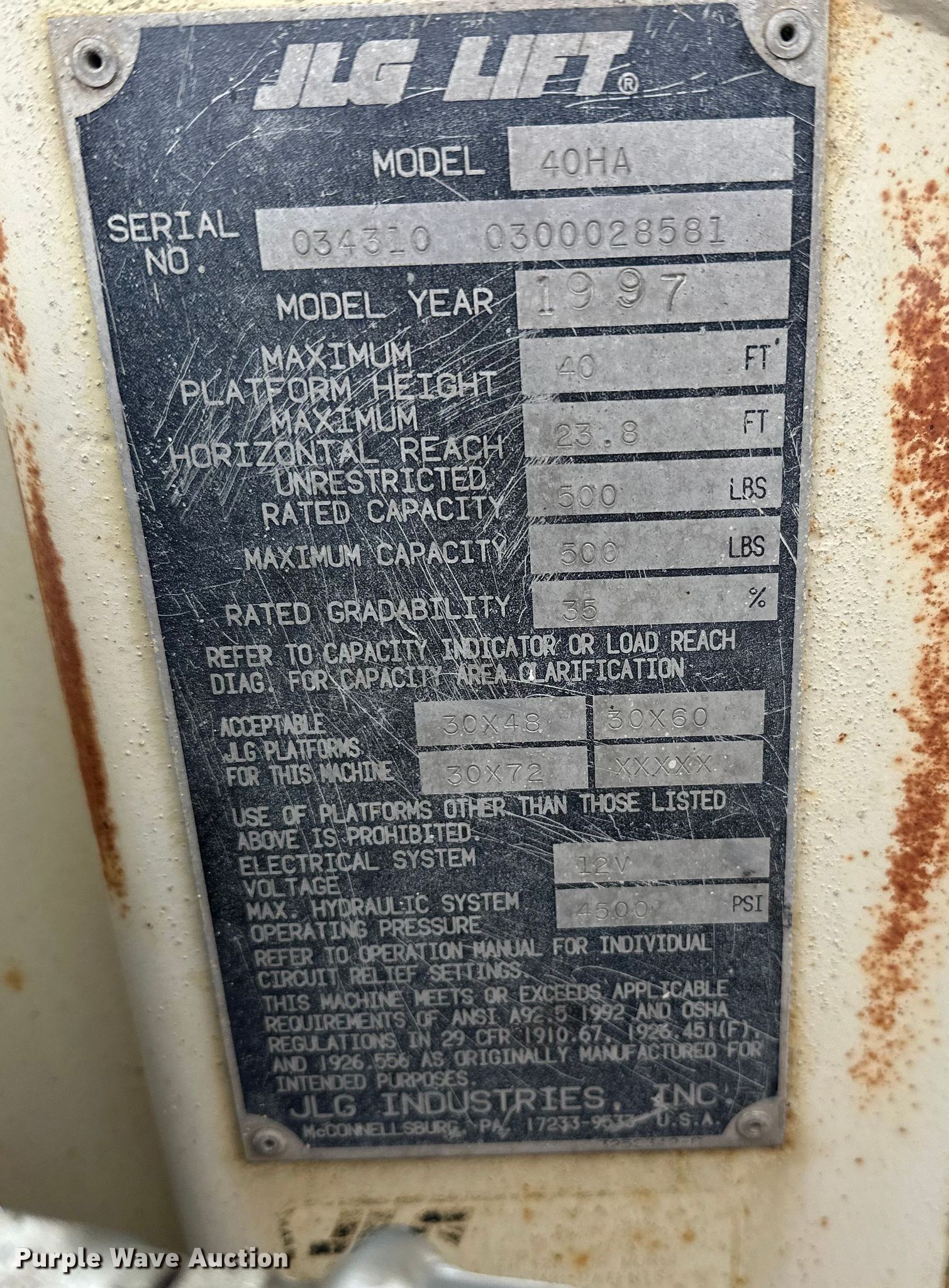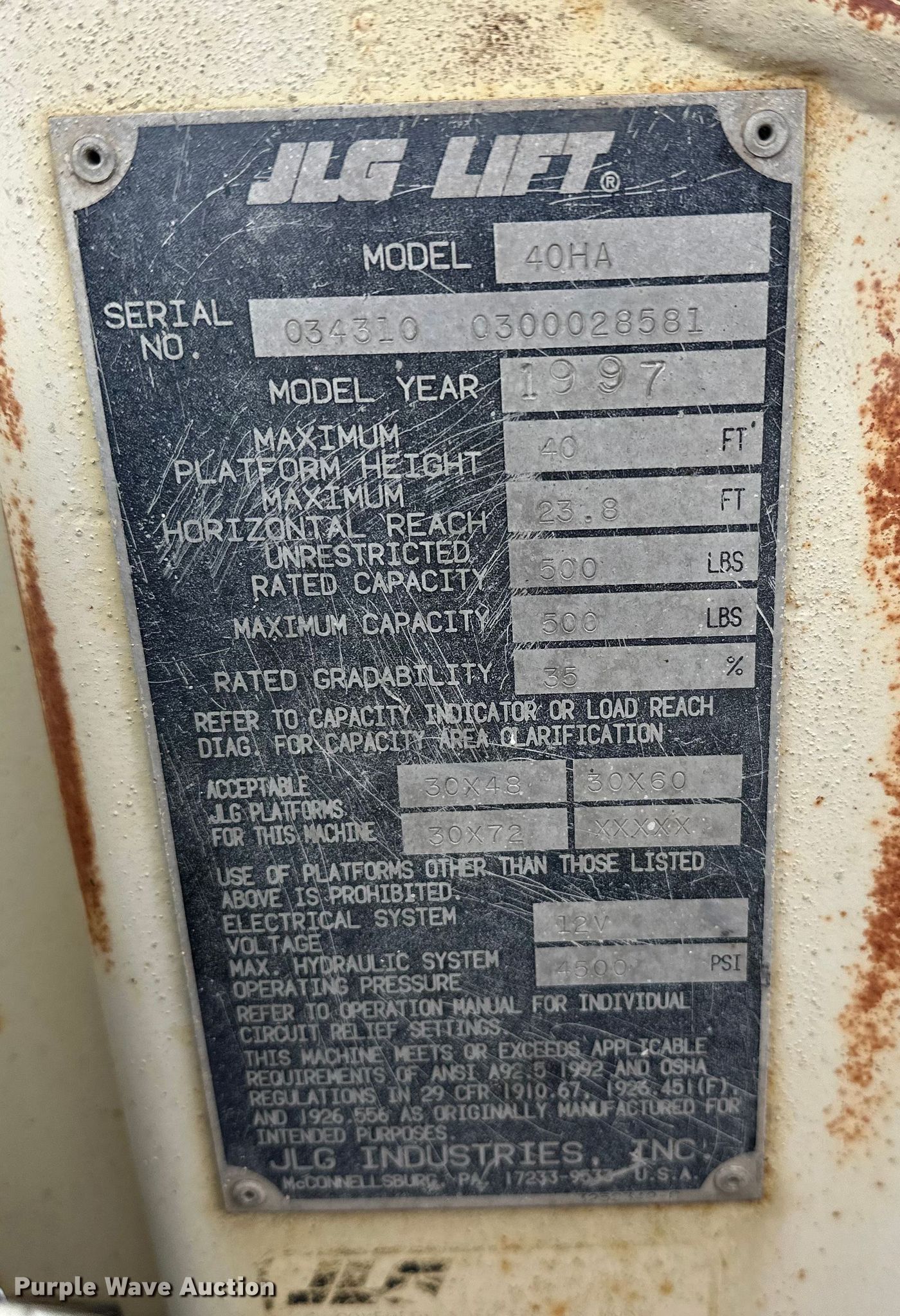 Purple Wave is selling a used Boom Lift in Minnesota. This item is a 1997 JLG 40HA boom lift with the following: Serial: 0300028581, Unit #: 82227
