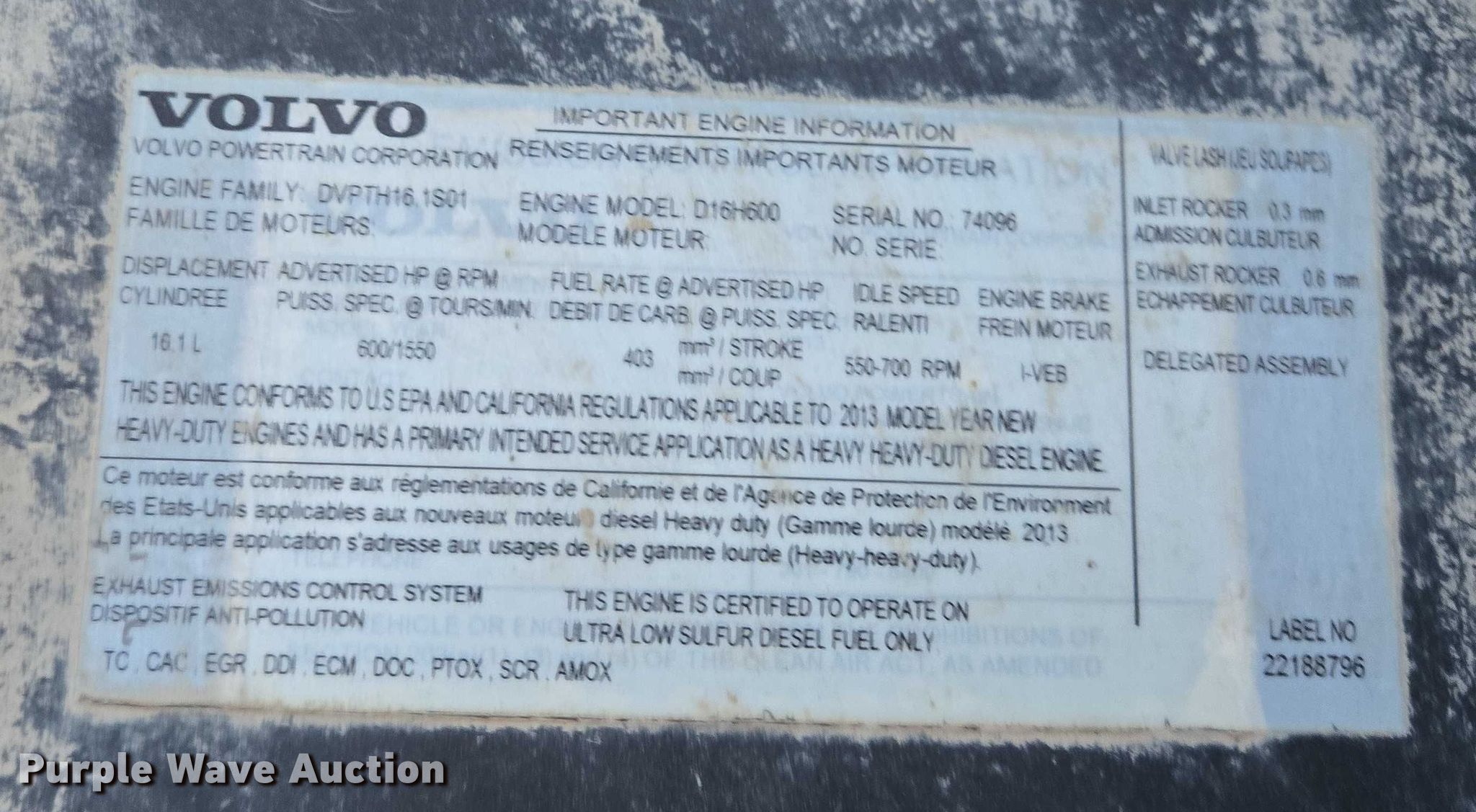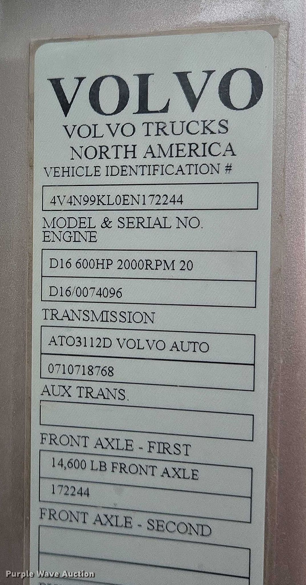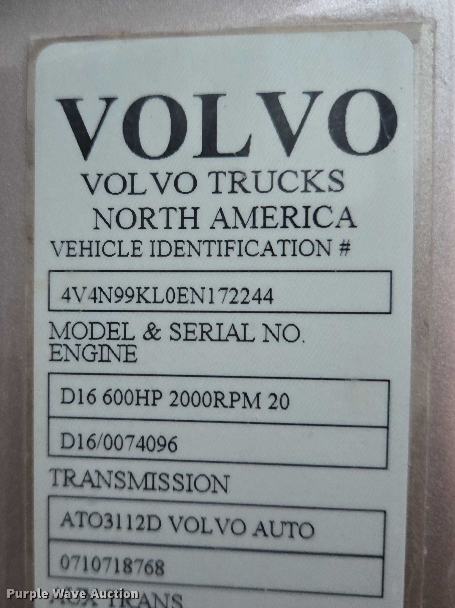 2014 Volvo VNL semi truck. Miles: 390,360 on odometer, VIN: 4V4N99KL0EN172244. Engine Volvo D16, Displacement: 16.1L, Cylinders: 6, Fuel type: Diesel, HP: 575. Transmission Automated manual. Chassis Axles: Triple, Pusher axle Steerable, Differential lock: Inter-axle, Suspension: Air Dump valves, Brakes: Air, PTO, Wet kit. Interior AC, Heat, Power locks, Cruise control, Air ride cab. Features Deck plate: Aluminum, Fifth wheel type: Air operated, Sliding, Fuel tank: Dual. Tires Front: 11R22.5, Rear: 295/75R22.5, Lift axle: 295/75R22.5. Notes Dash warning indicator: Coolant, Windshield chipped or cracked, Jump start required during on-site data collection, Unknown operating condition , Unit must be towed or hauled. Iowa title. Title distribution may be delayed up to 14 days from verification of funds. Croell Inc. Sundance, WY 82729