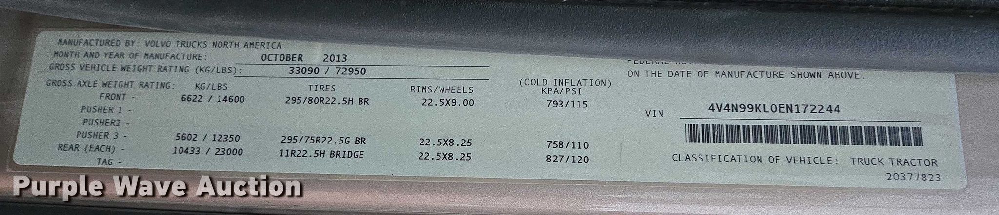 Purple Wave is selling a used Truck Tractor in Wyoming. This item is a 2014 Volvo VNL semi truck with the following: Miles: 390,360 on odometer, VIN: 4V4N99KL0EN172244