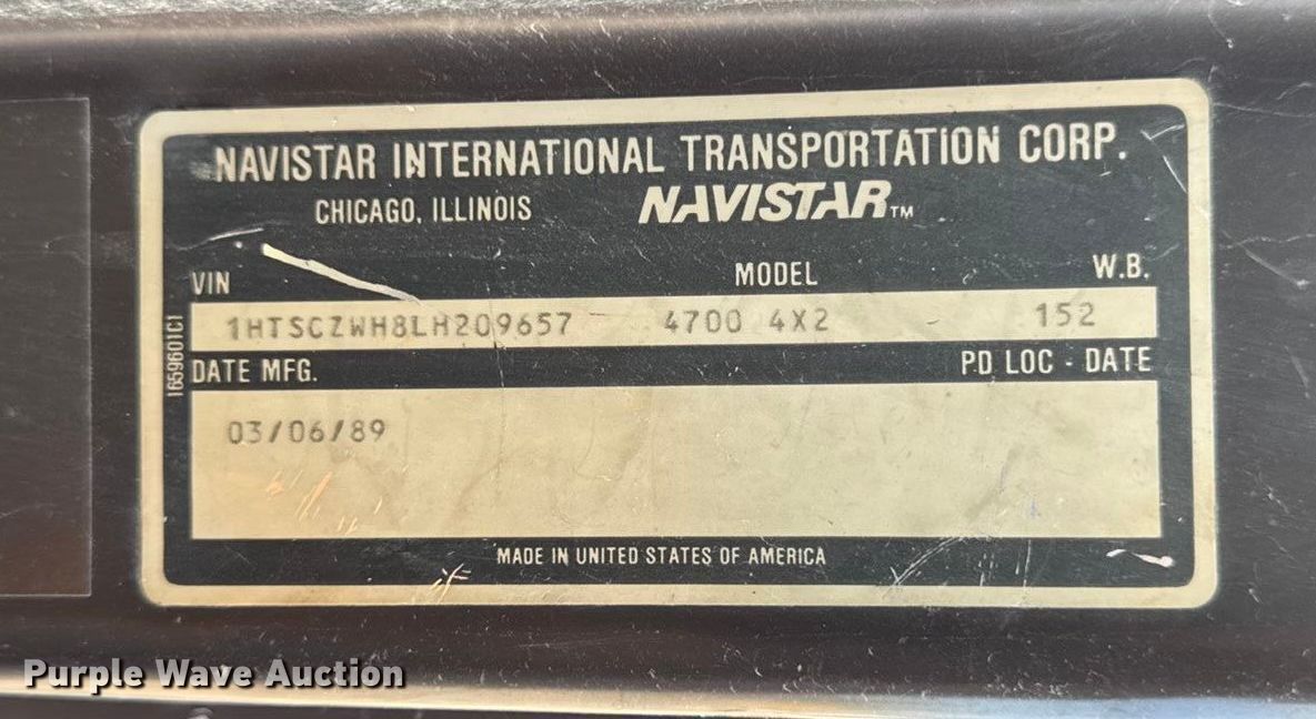 1990 International 4700 dump flatbed truck. Miles: 33,772 on odometer, VIN: 1HTSCZWH8LH209657. Engine Navistar B170F, Displacement: 5.9L, Cylinders: 6, Fuel type: Diesel. Transmission Manual, Speed: 5, plus 2. Chassis Axles: Single, Suspension: Spring, Brakes: Hydraulic, PTO. Interior Heat, Brake controller. Features Bed Dump flatbed, Length: 143', Width: 95", Bed type: Steel, Ram: Single. Tires Front: 225/70R19.5, Rear: 8R19.5. Title distribution may be delayed up to 14 days from verification of funds. Jasper Construction Services. Newton, IA 50208