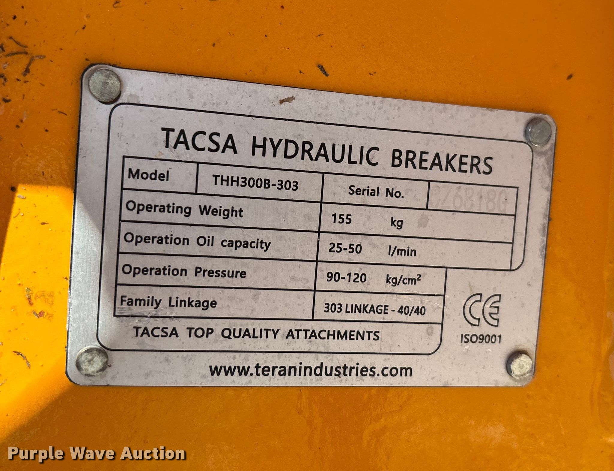 Purple Wave is selling a used Skid Steer Attach. in Florida. This item is a Teran THH300B-303 skid steer breaker with the following: Serial: CZ6818G