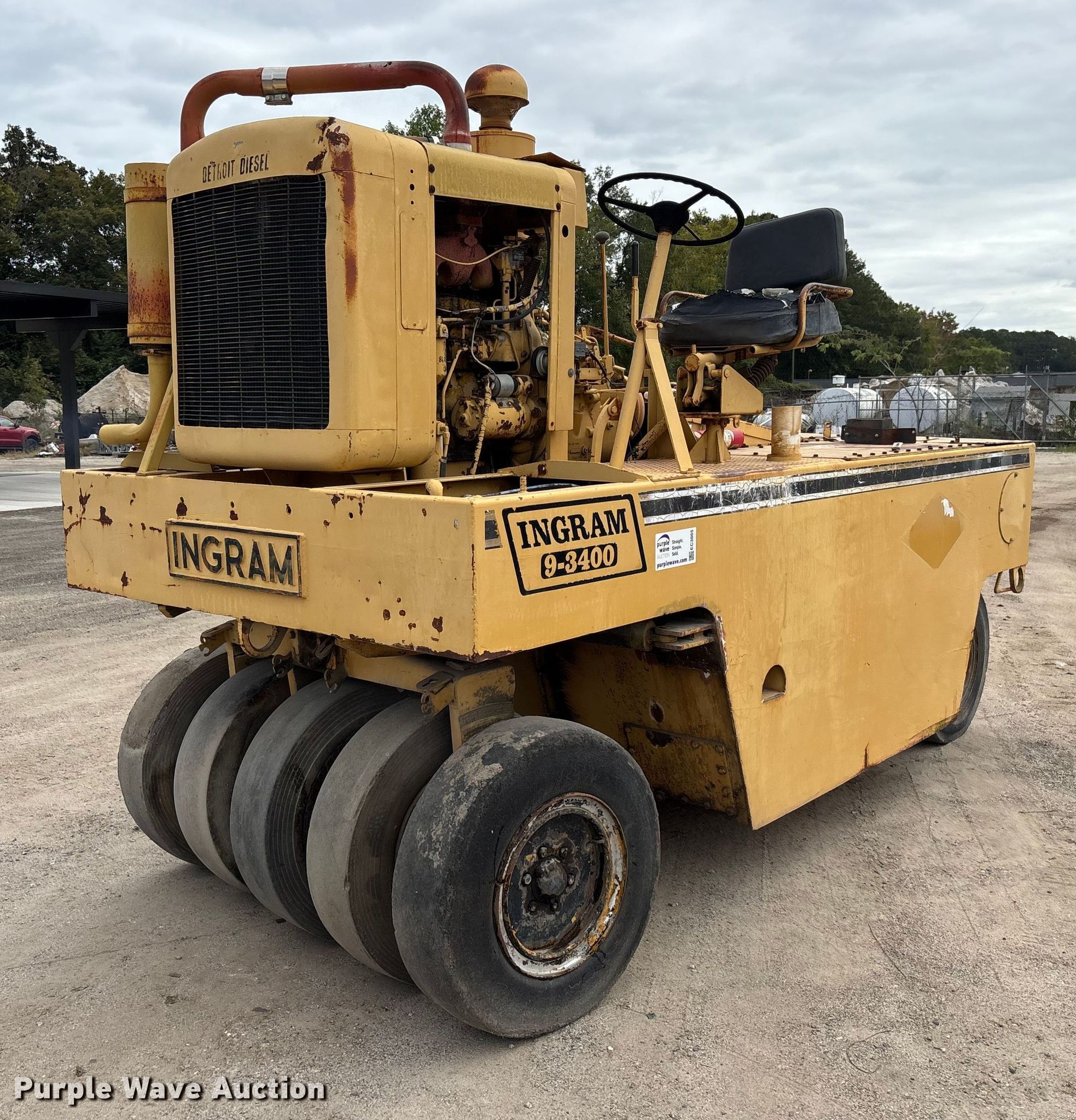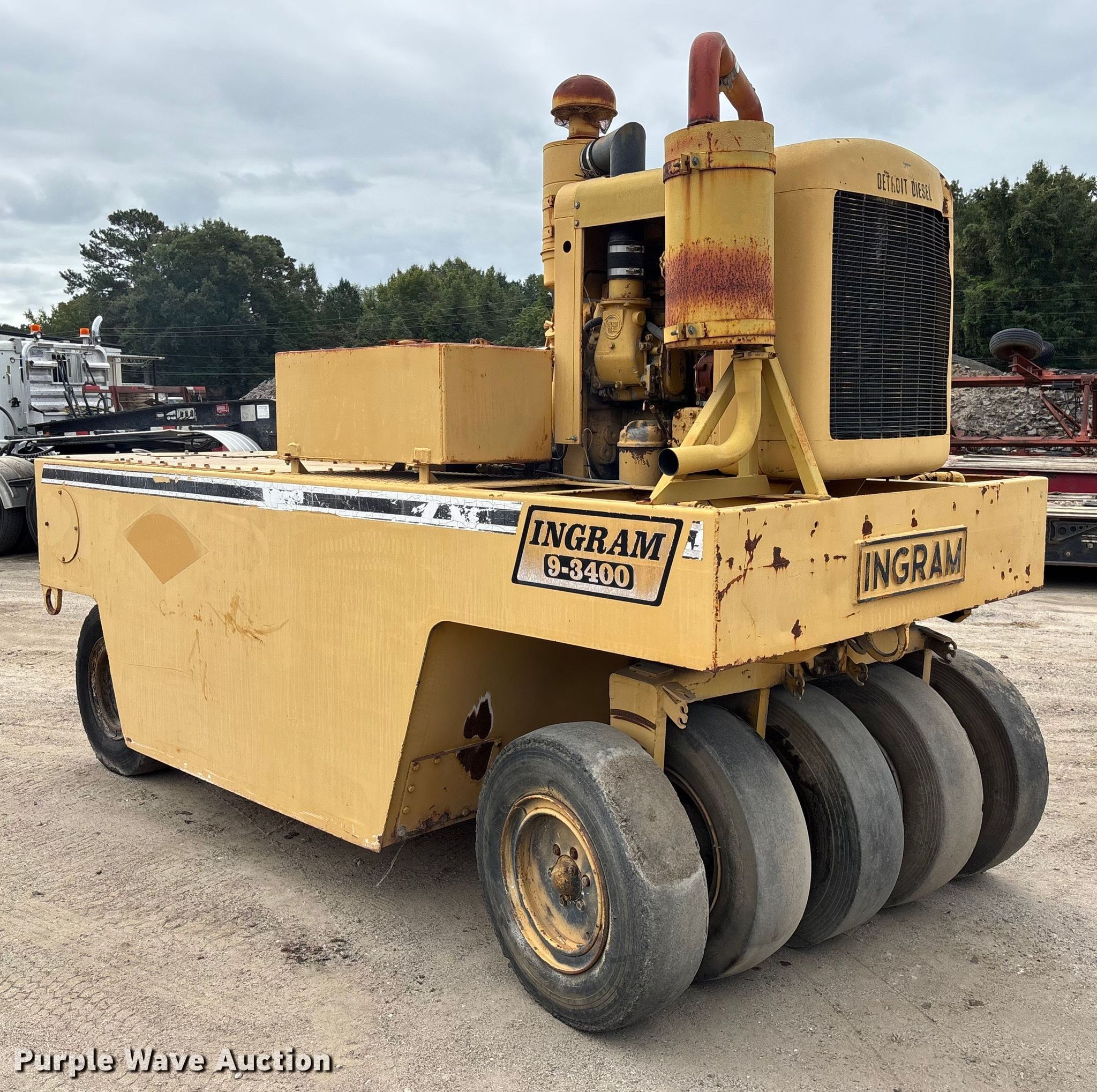 Ingram 9-3400 pneumatic roller. Serial: 422003P55. Engine Detroit Diesel, Cylinders: 3, Fuel type: Diesel. Transmission Hydrostatic. Tires Size: 7.50-15NHS, Quantity: 9. Chipley Company. Florence, SC 29501