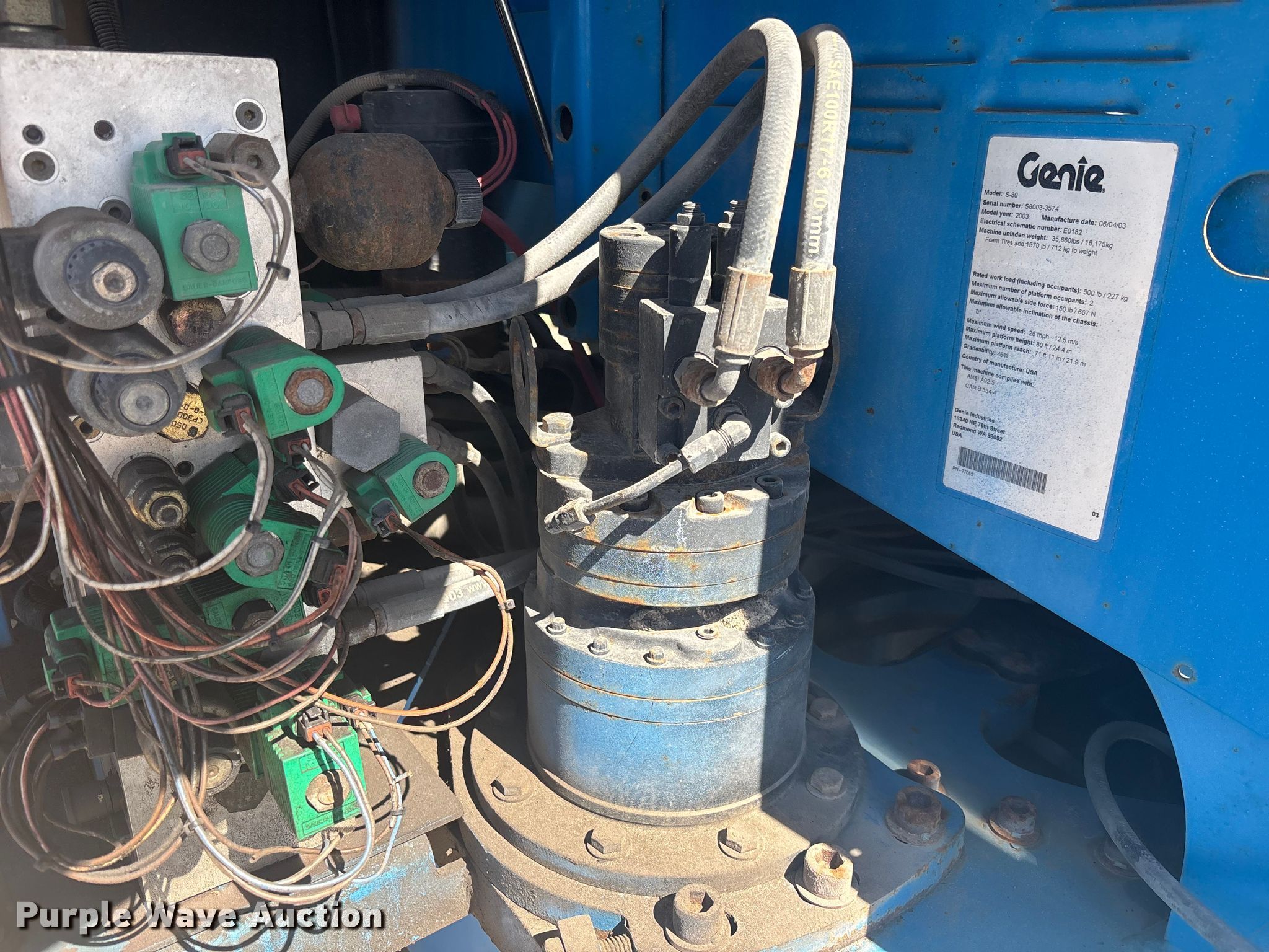 Purple Wave is selling a used Boom Lift in Florida. This item is a 2003 Genie S-80 boom lift with the following: Hours: 1,669 on meter, Serial: S8003-3574