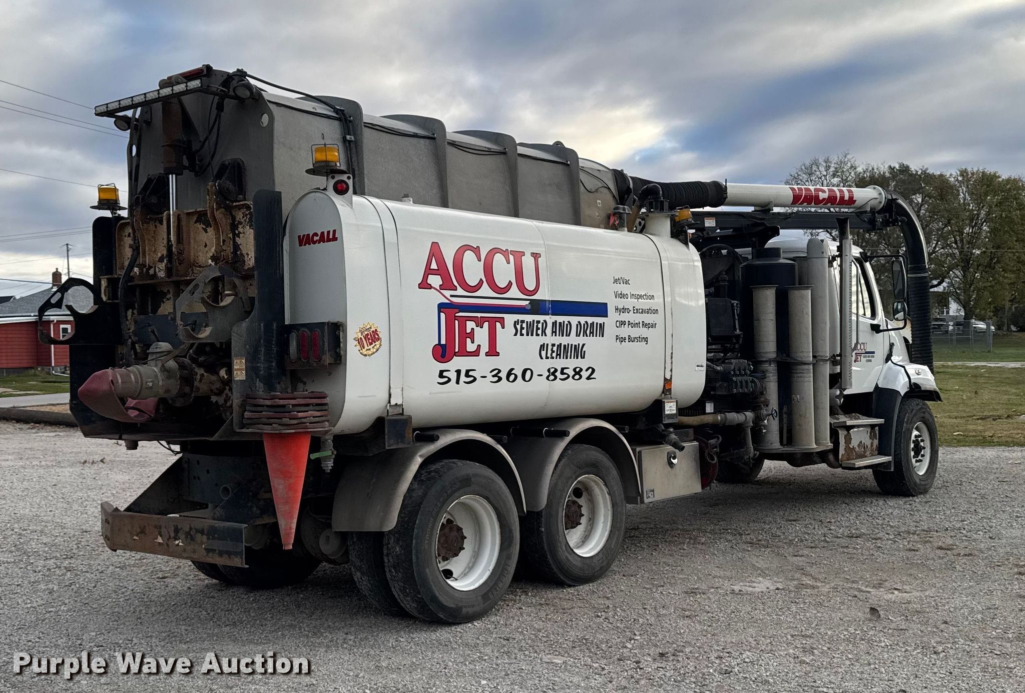 2015 Freightliner 108SD sewer jetter truck. Miles: 159,501 on odometer, Hours: 14,273 on meter, VIN: 1FVHG5CY5FHGJ6288. Engine Cummins ISL, Displacement: 8.9L, Cylinders: 6, Fuel type: Diesel, HP: 310. Transmission Automatic. Chassis Axles: Tandem, Differential lock: Inter-axle, Suspension: Spring over walking beam, Brakes: Air, PTO, GVWR: 66,000 lbs. Interior AC, Heat, Heated mirrors, Cruise control, Auxiliary controls. Features Bed Vacall AJV1215, Serial: AJV0004375, Length: 18', Width: 102". Tires Size: 425/65R22.5, Rear: 11R22.5. Notes Rear gate issues, seized , Dash warning indicator: Check engine. Lender owned. Item condition and history unknown. Transfer of ownership documentation will be a bill of sale. AccuJet Liquidation - Open Inspection November 12th 2025. Perry, IA 50220
