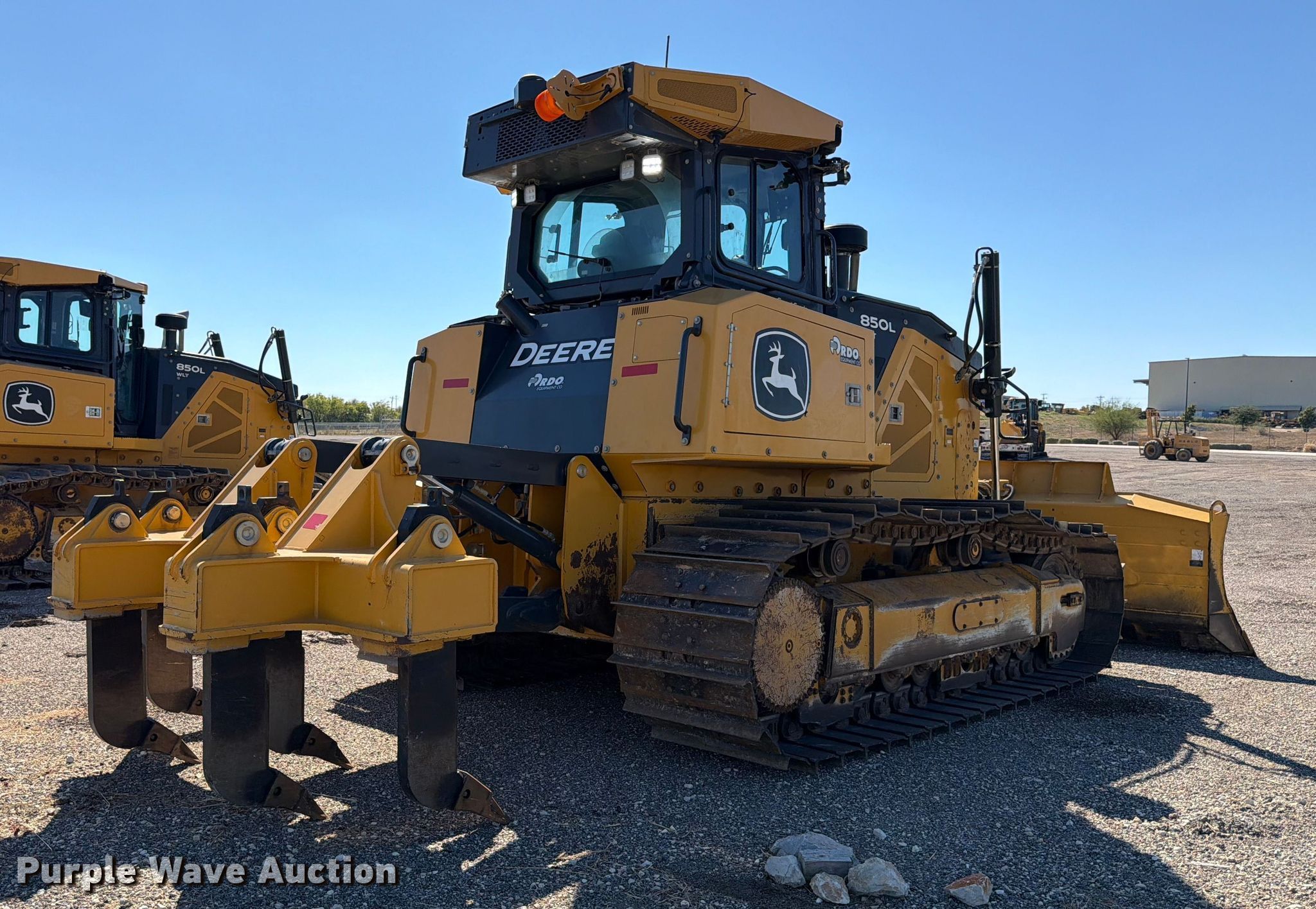 2022 John Deere 850L WLT dozer. Hours: 5,930 on meter, Serial: 1T0850LXJNF430144. Engine John Deere PowerTech PSS, Displacement: 9.0L, Cylinders: 6, Fuel type: Diesel, HP: 225. Transmission Hydrostatic. Operators station Enclosed cab, AC, Heat, Electronic Monitoring System panel, Grade control, John Deere SmartGrade, Steering: Joystick. Features Auxiliary hydraulics, Dozer blade Blade type: 6-way, Blade shape: Straight, Width: 13' 2", Attachments Ripper HR Manufacturing, Shanks: 5.. Tracks Width: 30", Grouser pads: Single, Bottom rollers: 8, Track guards. Notes Extended warranty powertrain and hydraulic valid through September 13 2026 or 8,000 hours. Lender Owned. Buda, TX 78610