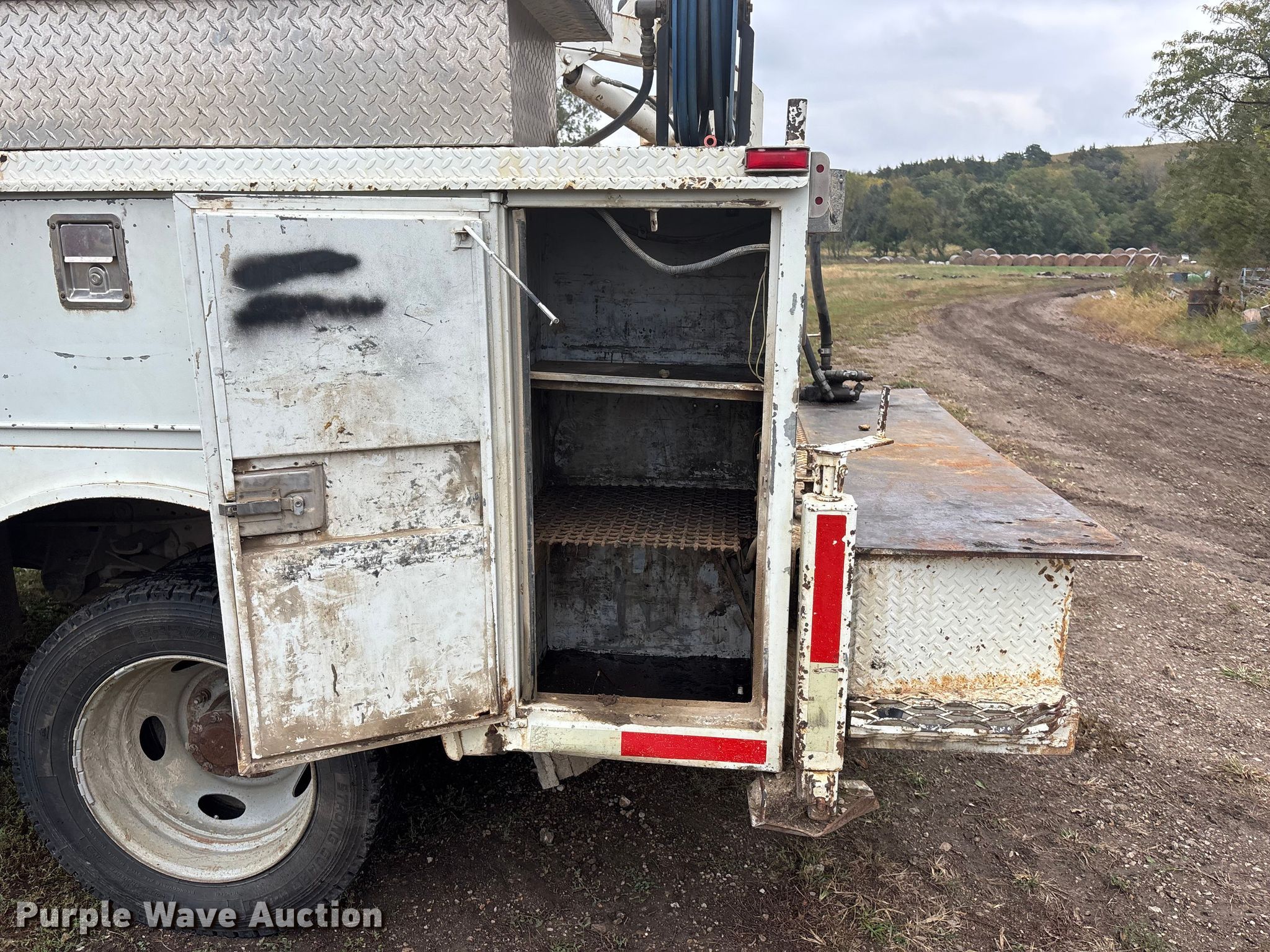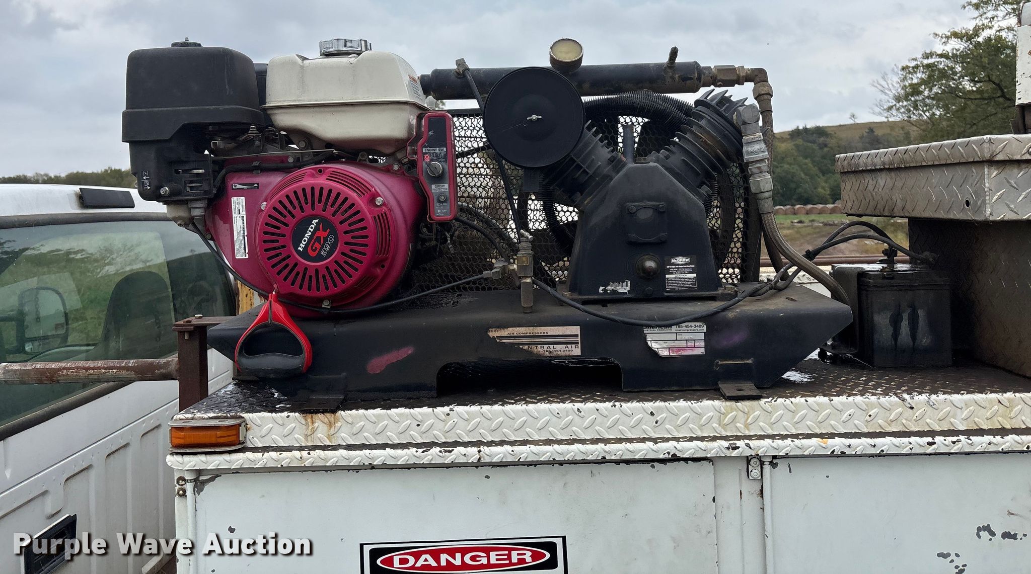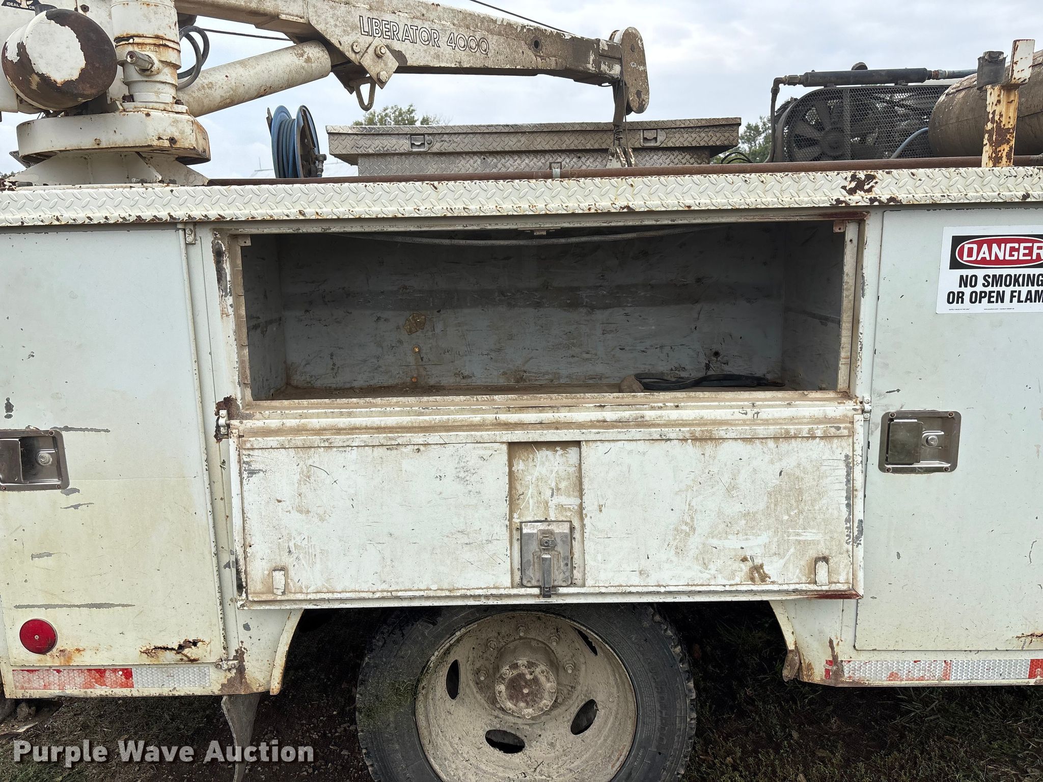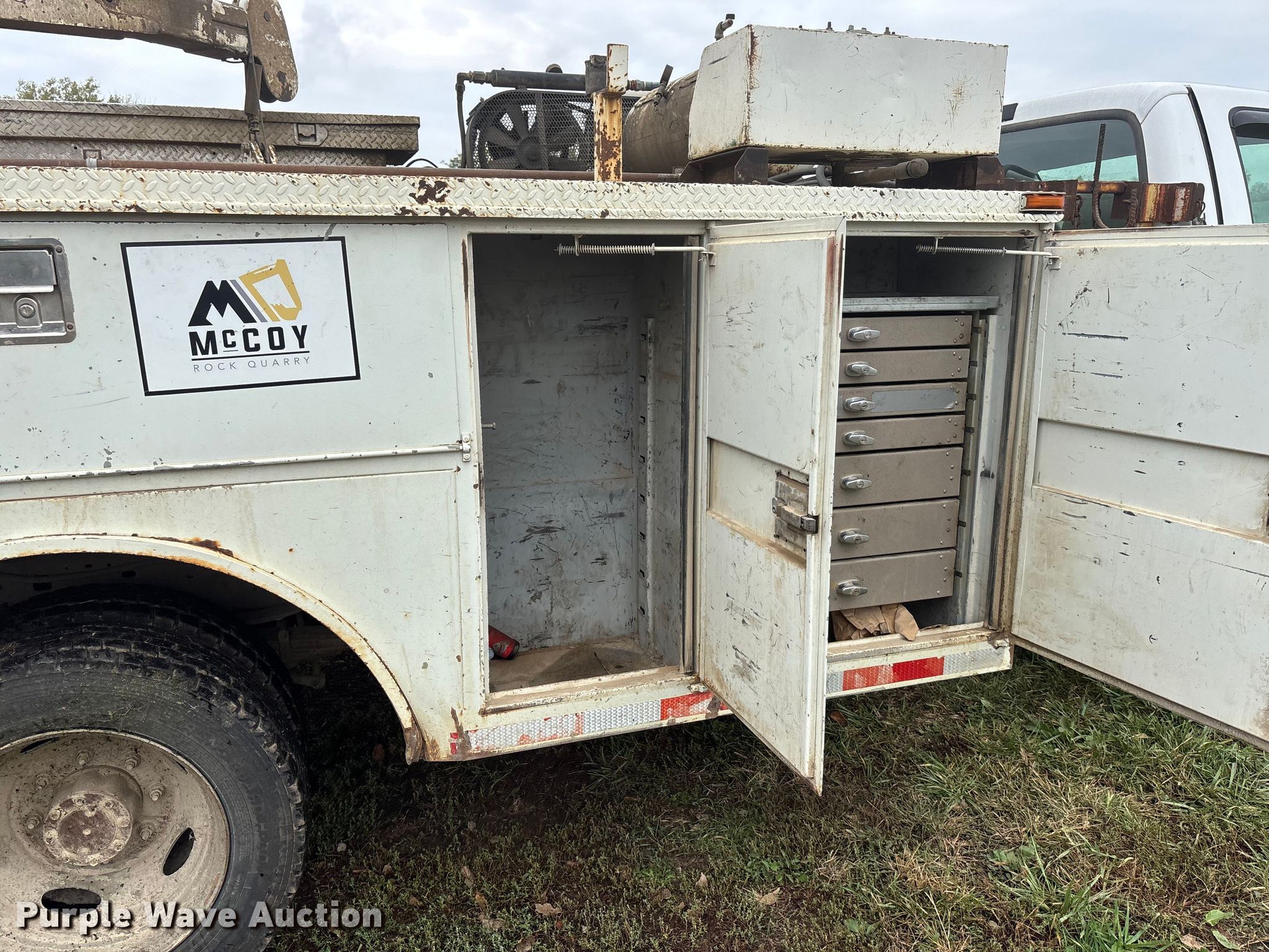 2001 Ford F550 utility / service truck. Miles: 258,432 on odometer, PTO hours: 448 on meter, VIN: 1FDAF56F11EB78978. Engine Displacement: 7.3L, Cylinders: 8, Fuel type: Diesel. Transmission Manual, Speed: 6. Chassis Axles: Single, Suspension: Spring, PTO. Interior AC, Heat, Cruise control. Features Bed Utility bed, Length: 11', Width: 94", Air compressor American Industrial, Honda GX390, Oil/lube system Hose reels, Reservoirs Hydraulic fluid, Crane Liberator 4000, Maximum boom length: 18' Maximum lift capacity: 2,000 lbs.. Tires Size: 225/70R19.5. Notes Dash warning indicator: ABS. Kansas title. Title distribution may be delayed up to 14 days from verification of funds. McCoy Rock Quarry. Alma, KS 66401