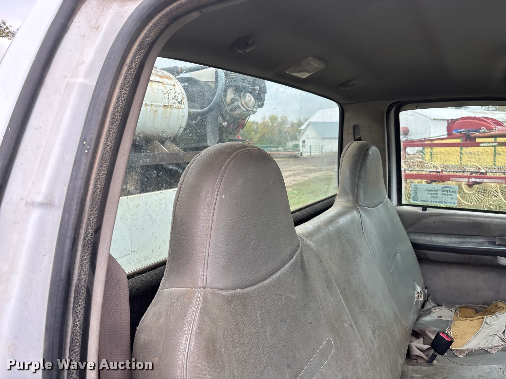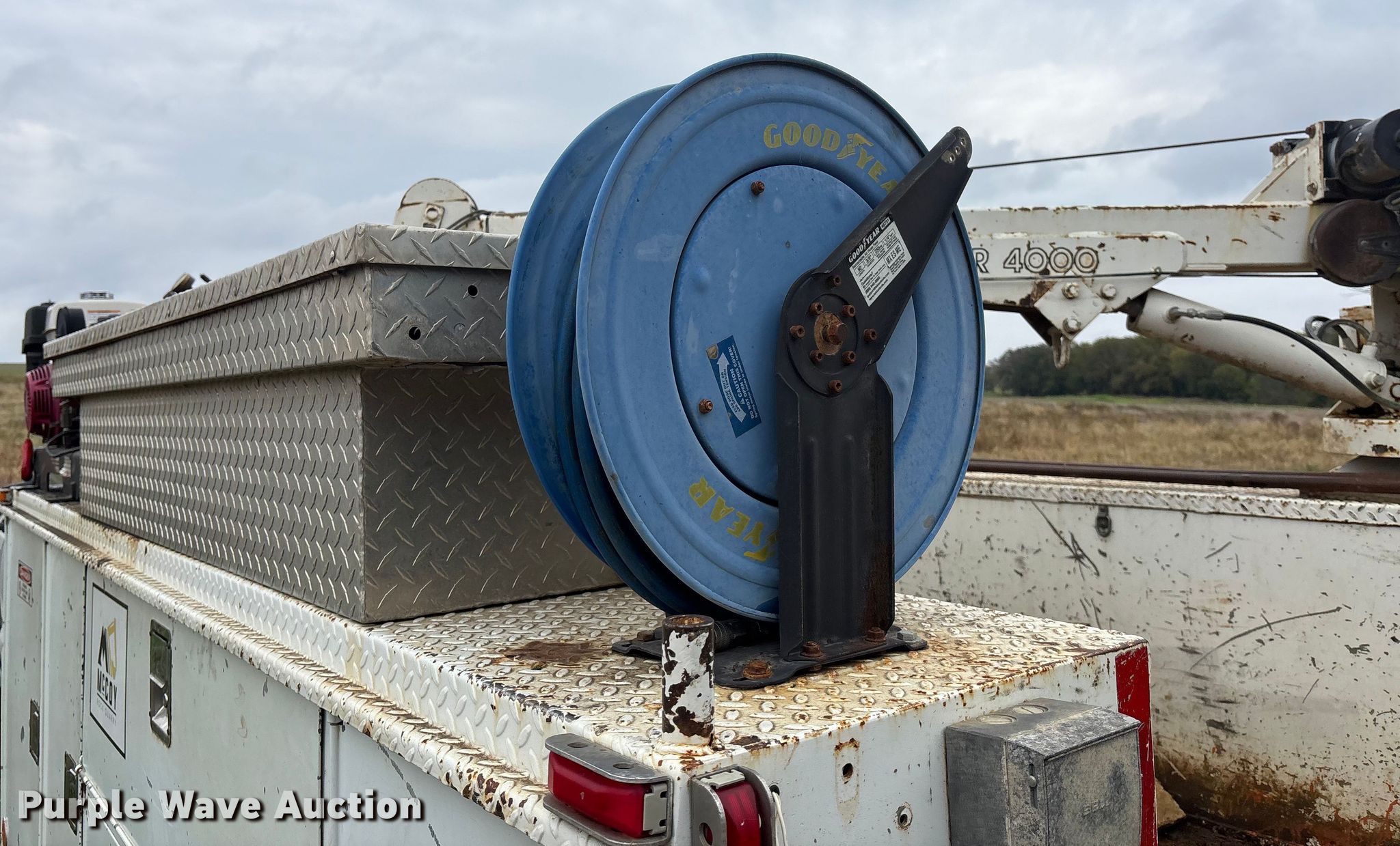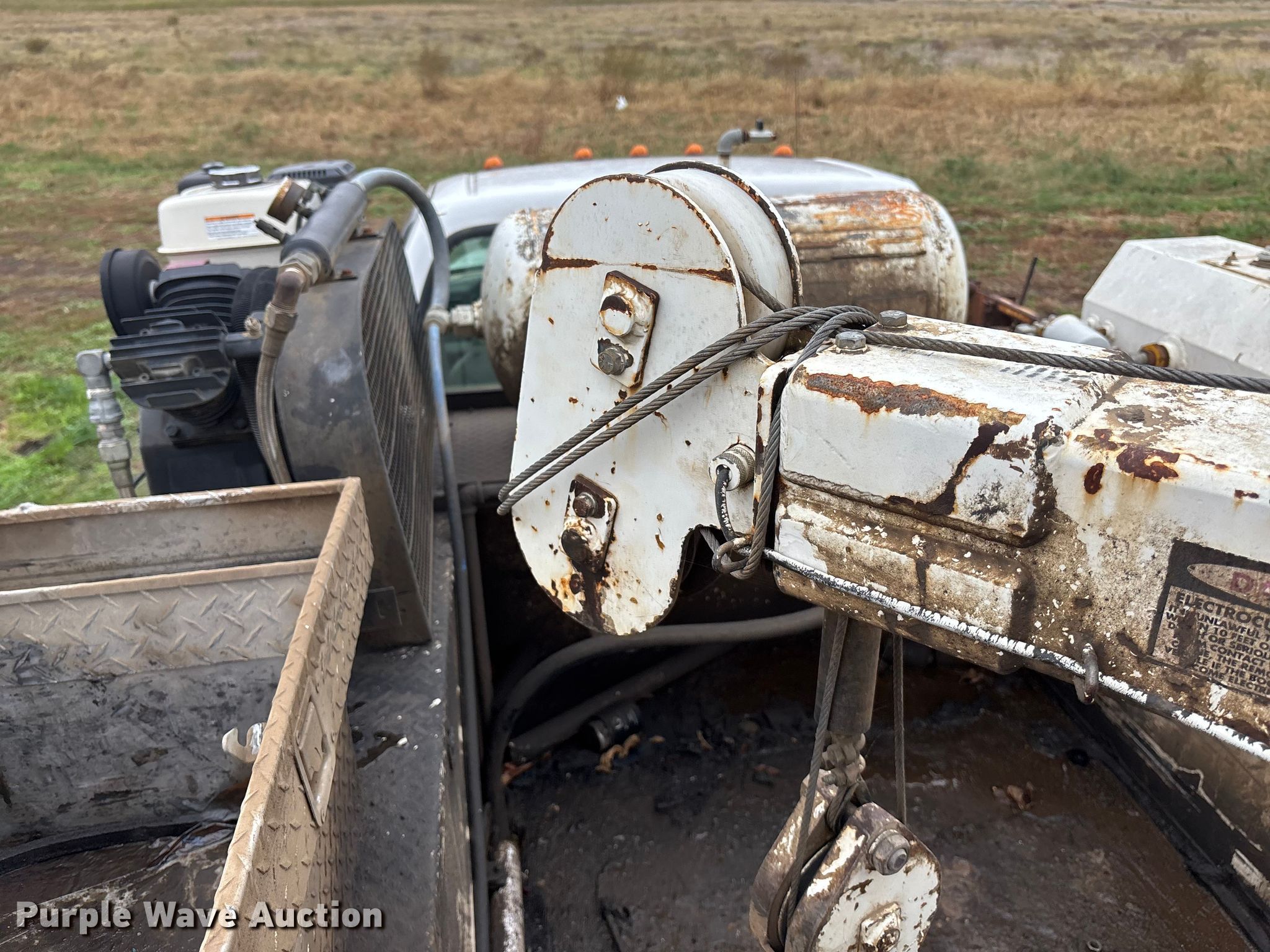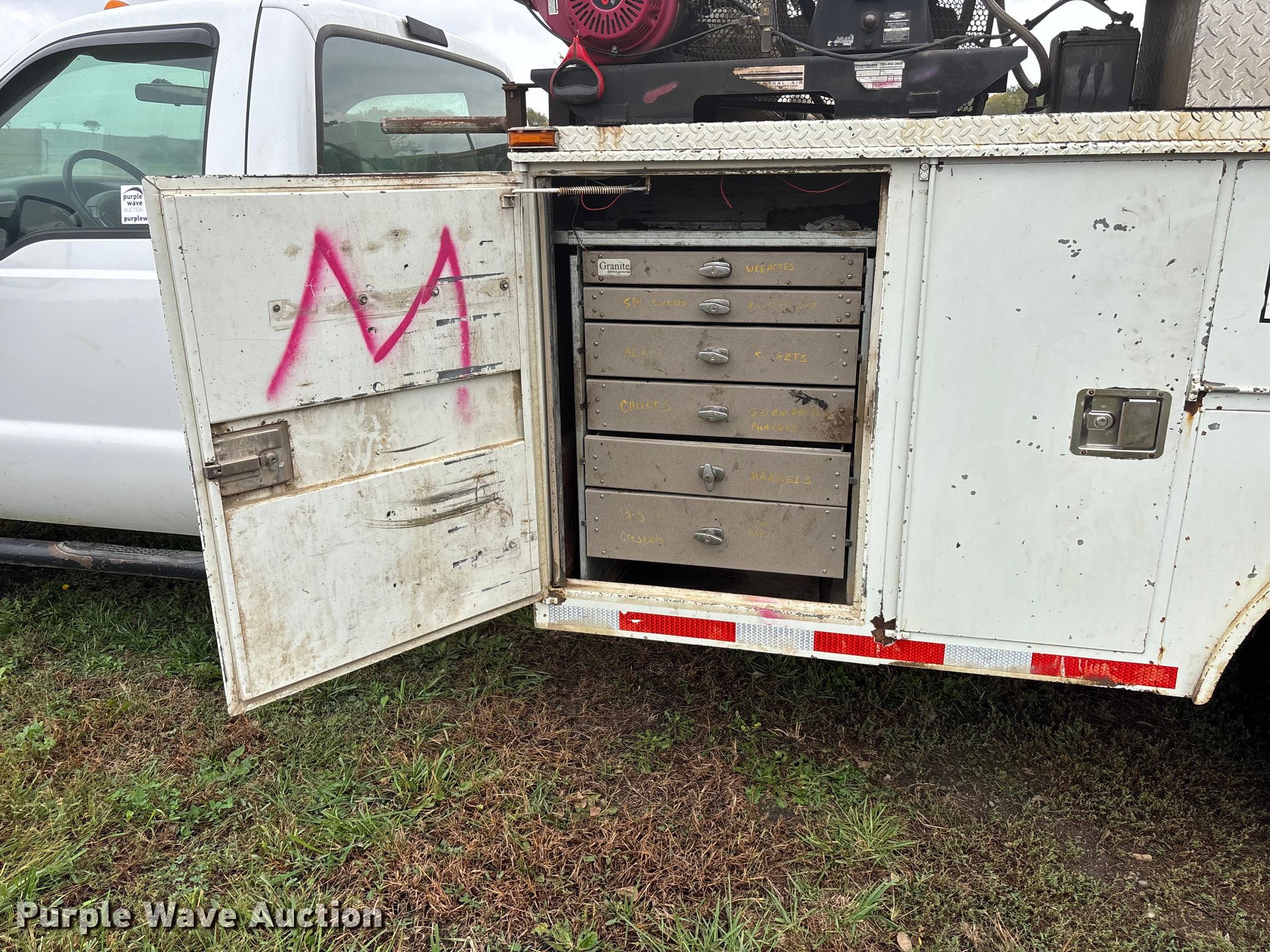 2001 Ford F550 utility / service truck. Miles: 258,432 on odometer, PTO hours: 448 on meter, VIN: 1FDAF56F11EB78978. Engine Displacement: 7.3L, Cylinders: 8, Fuel type: Diesel. Transmission Manual, Speed: 6. Chassis Axles: Single, Suspension: Spring, PTO. Interior AC, Heat, Cruise control. Features Bed Utility bed, Length: 11', Width: 94", Air compressor American Industrial, Honda GX390, Oil/lube system Hose reels, Reservoirs Hydraulic fluid, Crane Liberator 4000, Maximum boom length: 18' Maximum lift capacity: 2,000 lbs.. Tires Size: 225/70R19.5. Notes Dash warning indicator: ABS. Kansas title. Title distribution may be delayed up to 14 days from verification of funds. McCoy Rock Quarry. Alma, KS 66401