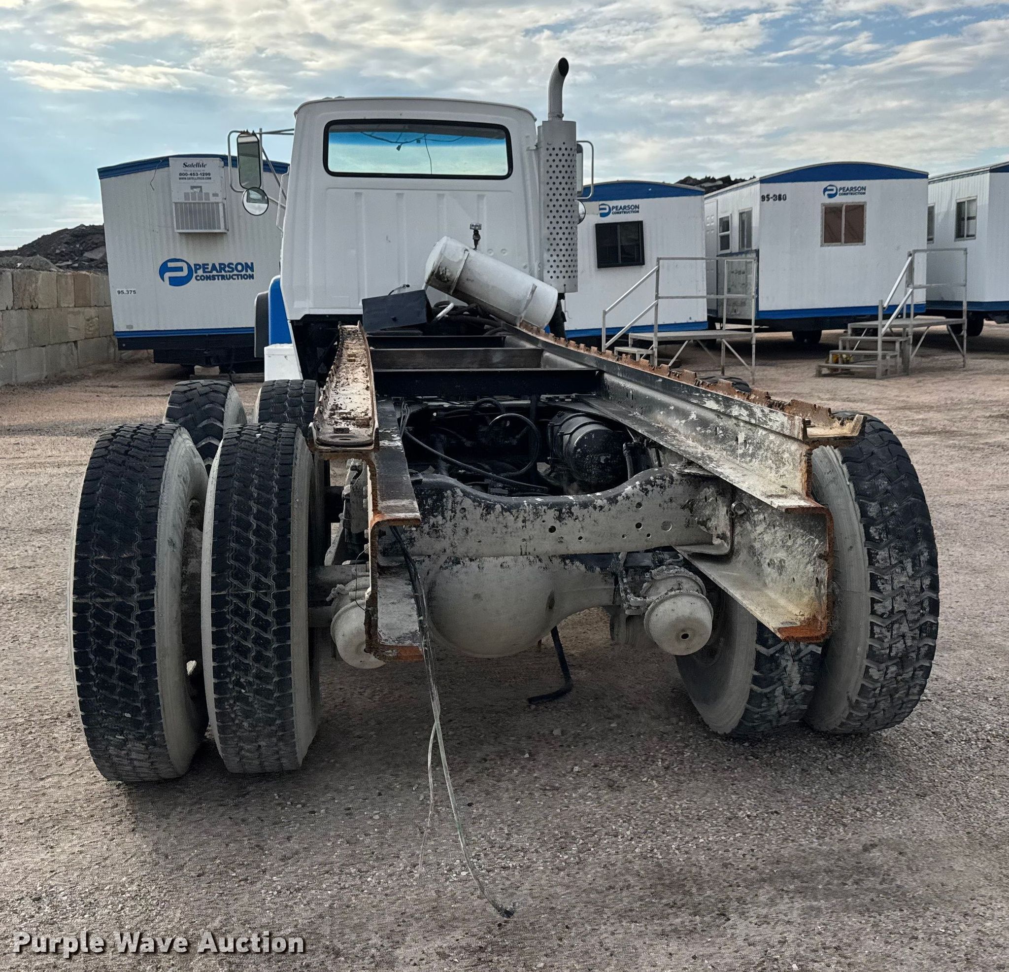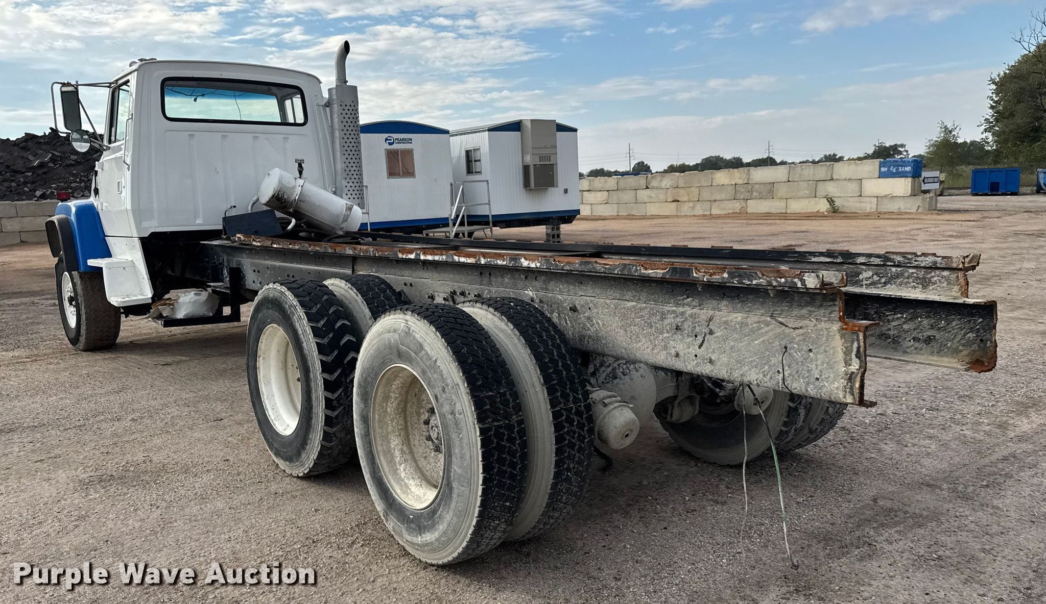 1993 Ford LT8000 truck cab and chassis. Miles: 155,414 on odometer, Hours: 3,158 on meter, VIN: 1FDZU82E0PVA19384. Engine Ford, Displacement: 8.3L, Cylinders: 6, Fuel type: Diesel. Transmission No transmission. Chassis Axles: Tandem, Differential lock: Inter-axle, Suspension: Spring over walking beam, Brakes: Air, Truck chassis: 21' 6". Interior Heat. Features Fuel tank: Single, Pump. Tires Front: 425/55R22.5, Rear: 11R22.5. Notes Passenger side door issues, will not open, Passenger seat missing, No transmission , Non-operational engine , Non-operational unit, Unit must be towed or hauled. Kansas title. Title distribution may be delayed up to 14 days from verification of funds. Pearson Construction, LLC. Wichita, KS 67219