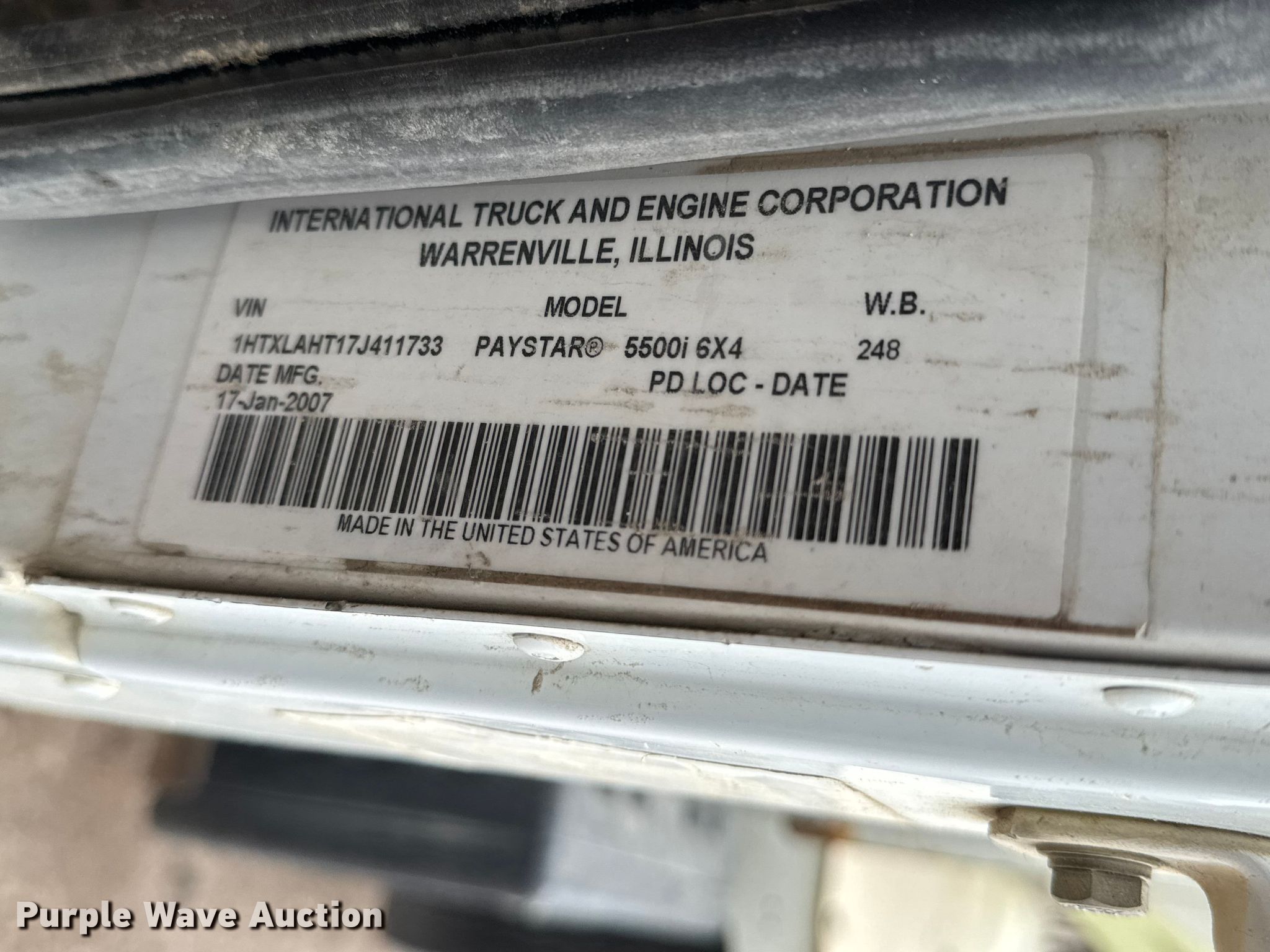 2007 International PayStar 5500i ready mix truck. Miles: 201,778 on odometer, Hours: 18,724 on meter, VIN: 1HTXLAHT17J411733. Engine Cummins ISM 320V, Serial: 35181963, Displacement: 10.8L, Cylinders: 6, Fuel type: Diesel, HP: 305. Transmission Eaton Fuller 9LL, Manual, Speed: 11. Chassis Axles: 4, Pusher axle Steerable, Tag axle Steerable, Differential lock: Inter-axle, Suspension: Spring over walking beam, Brakes: Air, PTO, GVWR: 66,000 lbs. Interior AC, Heat, Heated mirrors, Cruise control. Features Mixer McNeilus, Serial: 31572, Capacity: 11 cu.yd., Discharge: Rear, In-cab controls, Rear drum controls, Water tank capacity: 110 gallons, Chute Extensions: 3, Chute type: Steel.. Tires Front: 425/65R22.5, Rear: 11R22.5, Lift axle: 255/70R22.5, 11R22.5. Notes Non-operational AC, Unknown operating condition of hopper, Hopper issues, will not move. Kansas title. Title distribution may be delayed up to 14 days from verification of funds. Pearson Construction, LLC. Wichita, KS 67219