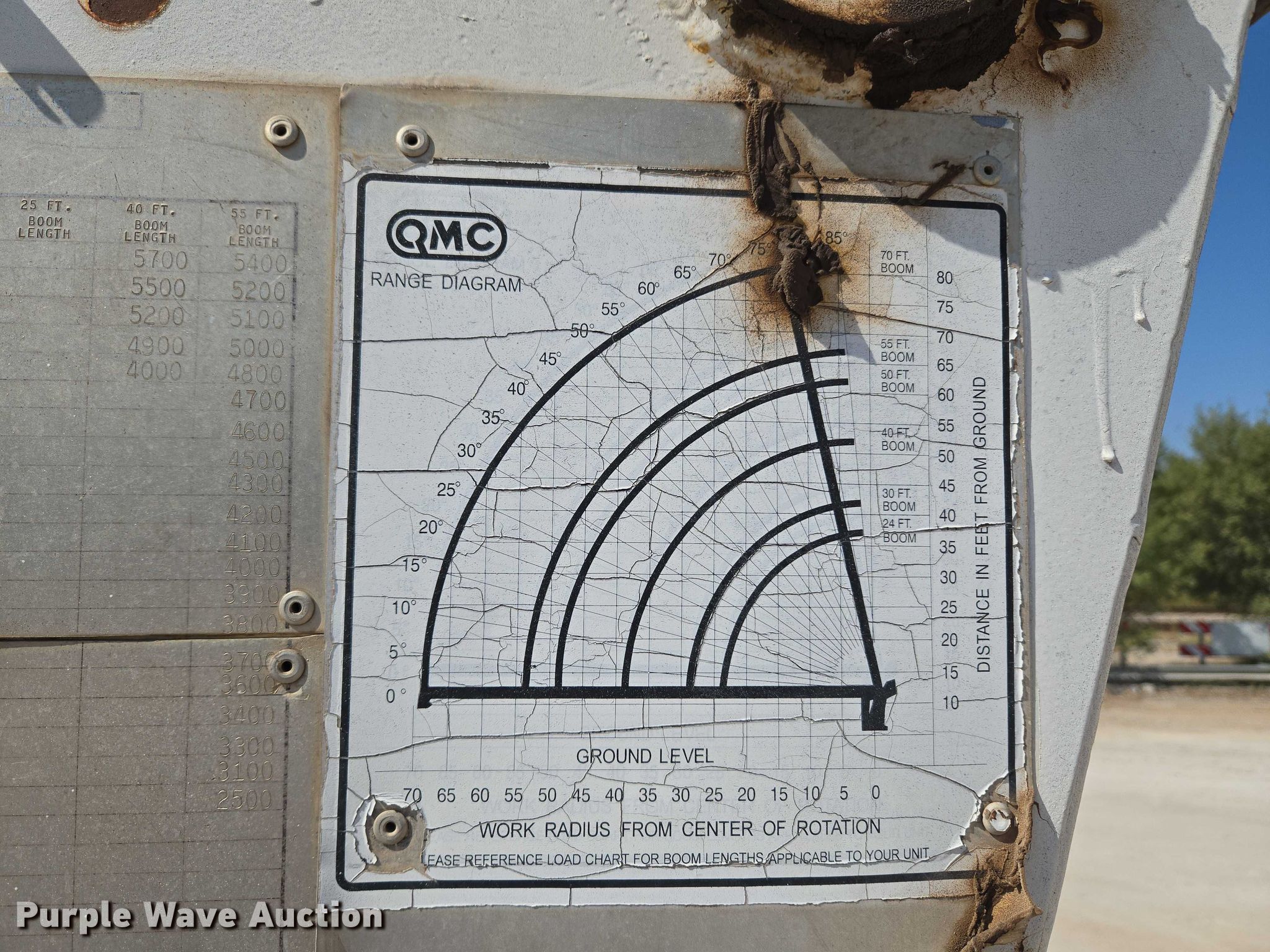 1985 Ford LNT9000 crane truck. Miles: 129,769 on odometer, VIN: 1FDZW90L5FVA65695. Engine Cummins, Displacement: 10.0L, Cylinders: 6, Fuel type: Diesel, Engine brake. Transmission Eaton Fuller, Manual. Chassis Axles: Tandem, Differential lock: Full, Suspension: Spring over walking beam, Brakes: Air, PTO, GVWR: 56,000 lbs, Wheelbase: 204". Features Bed Flatbed, Length: 21' 6", Width: 8', Crane QMC, Boom Telescopic, Maximum boom length: 80' Sections: 3, Maximum lift capacity: 24,800 lbs, Boom controls Ground, Sheaves: 2, Crane ball & hook, Lift chart. Tires Front: 425/65R22.5, Rear: 11R22.5. Notes Windshield chipped or cracked, Hail damage, Parts missing, Hydraulic leak, Oil leak, Non-operational passenger side door. Iowa title. Title distribution may be delayed up to 30 days from verification of funds. Croell Inc.. Kingfisher, OK 73750